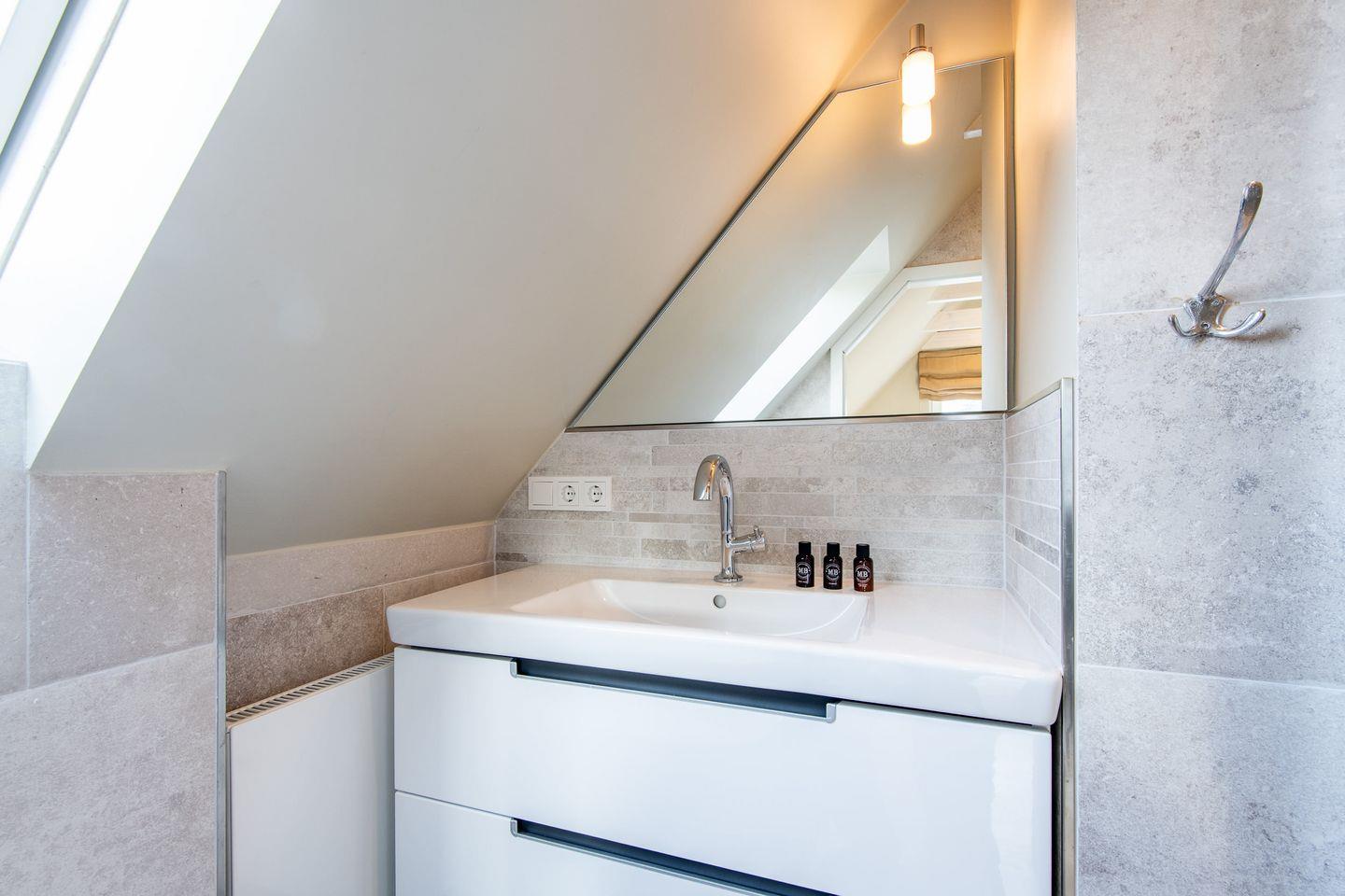 Das elegante Hauptbadezimmer ist mit einer Dusche, einer eigenen Sauna sowie Waschmaschine und Trockner ausgestattet – ideal für eine kleine Wellnessauszeit zwischendurch oder das entspannte Ankommen nach einem Tag am Meer.