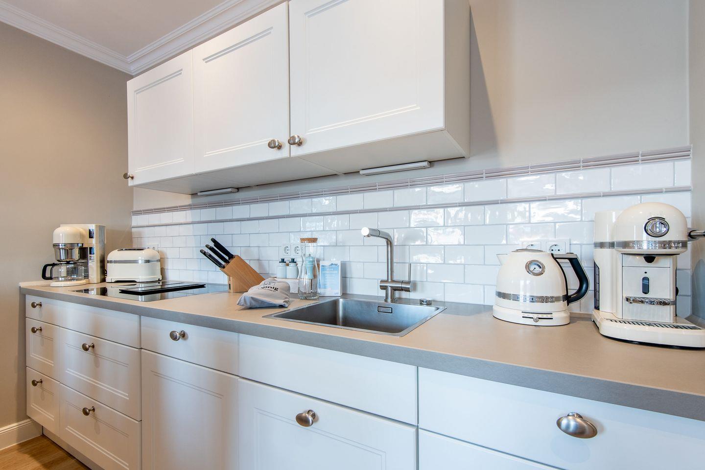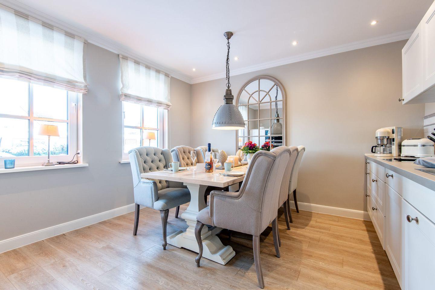 Die voll ausgestattete, offene Küche ist ein Ort der Begegnung – ob beim Zubereiten eines kleinen Snacks oder eines festlichen Dinners. Der große Esstisch mit sechs bequemen Sesseln lädt ein zu ausgedehnten Mahlzeiten, Spielrunden oder guten Gesprächen mit Familie und Freunden – mittendrin und immer verbunden.