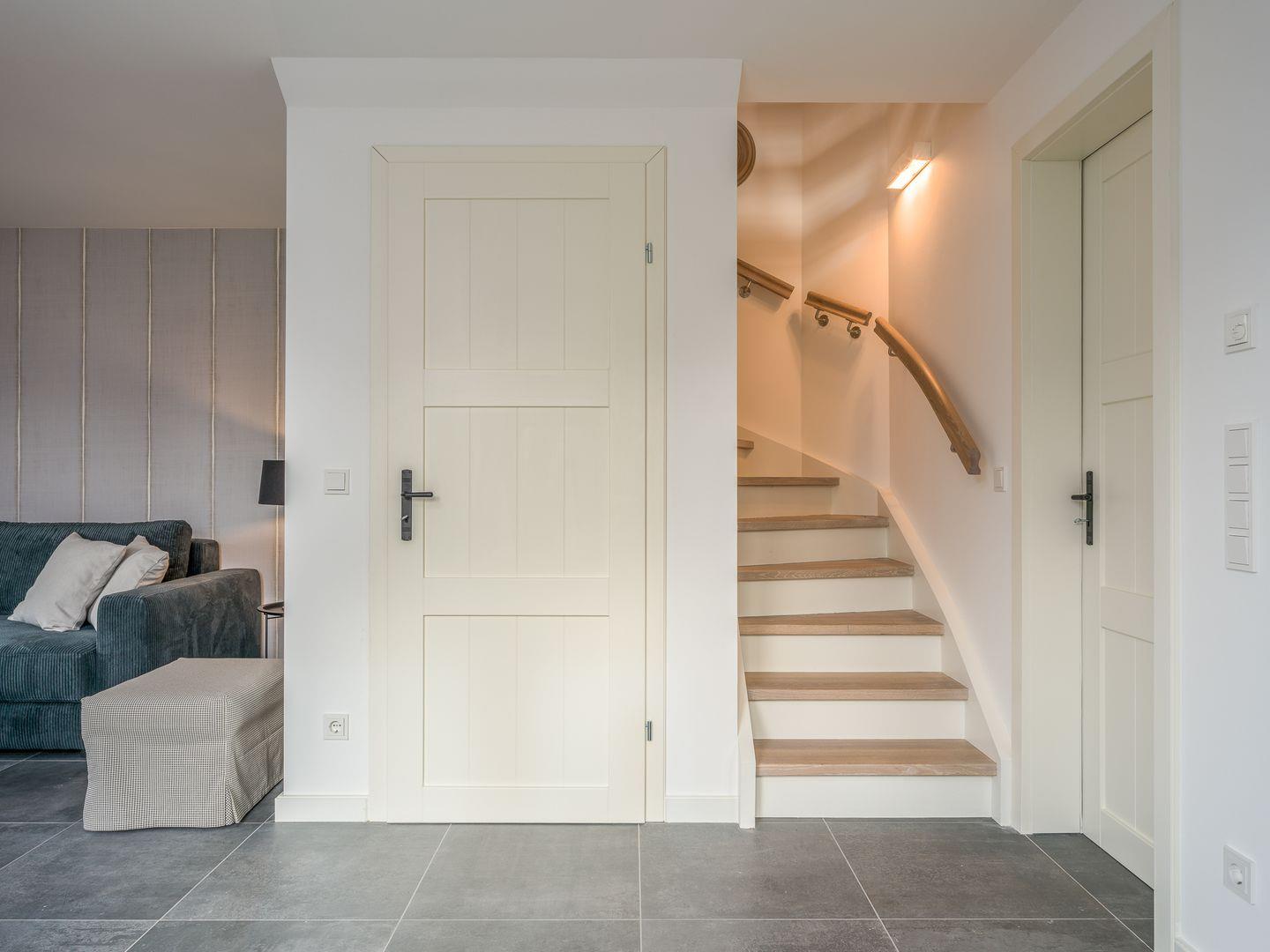 Eine Treppe höher liegen die beiden Schlafzimmer. mit jeweils einem Doppelbett. Begleitet werden sie von einem großen Bad mit Naturstein und hochwertiger Ausstattung wie z.B. einer Walk-in Dusche. Die Einrichtung im ersten OG ist nicht nur schön, sondern auch hochwertig: vom Holzboden, über Naturstein bis hin zu maßgefertigten Tischlereinbauten. Ein zeitlos-nordischer Look, der Qualität und Behaglichkeit vereint.