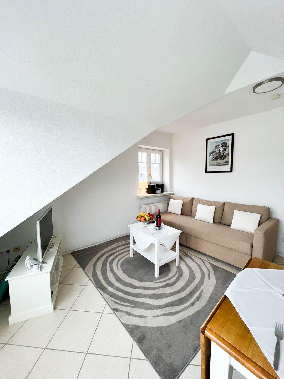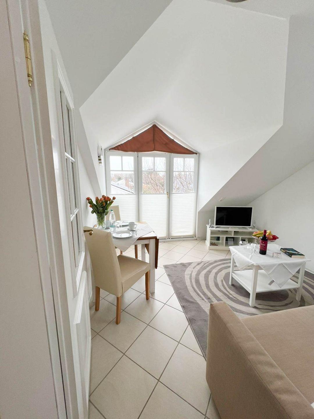 Schon beim Betreten spüren Sie die angenehme Atmosphäre: der offene Wohn- und Essbereich lädt mit einer komfortablen Sitz- und Sofaecke sowie einem einladenden Essplatz zum Verweilen ein. Große Fenster fluten den Raum mit Tageslicht und öffnen sich zum Balkon, auf dem Sie frische Seeluft und Sylter Sonnenstunden genießen können – ein herrlicher Ort für den ersten Kaffee des Tages oder einen entspannten Abend unter dem Himmel der Nordsee.