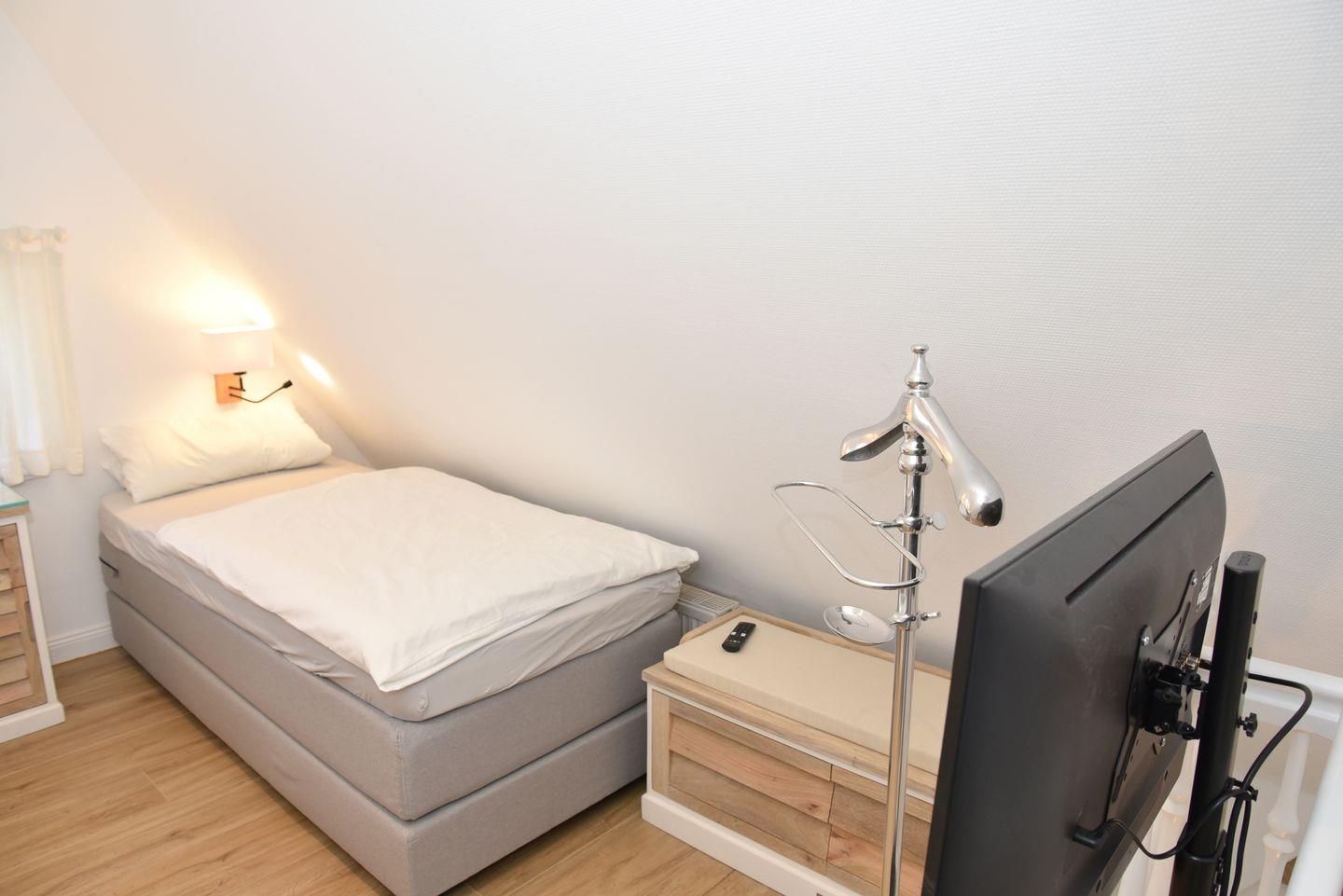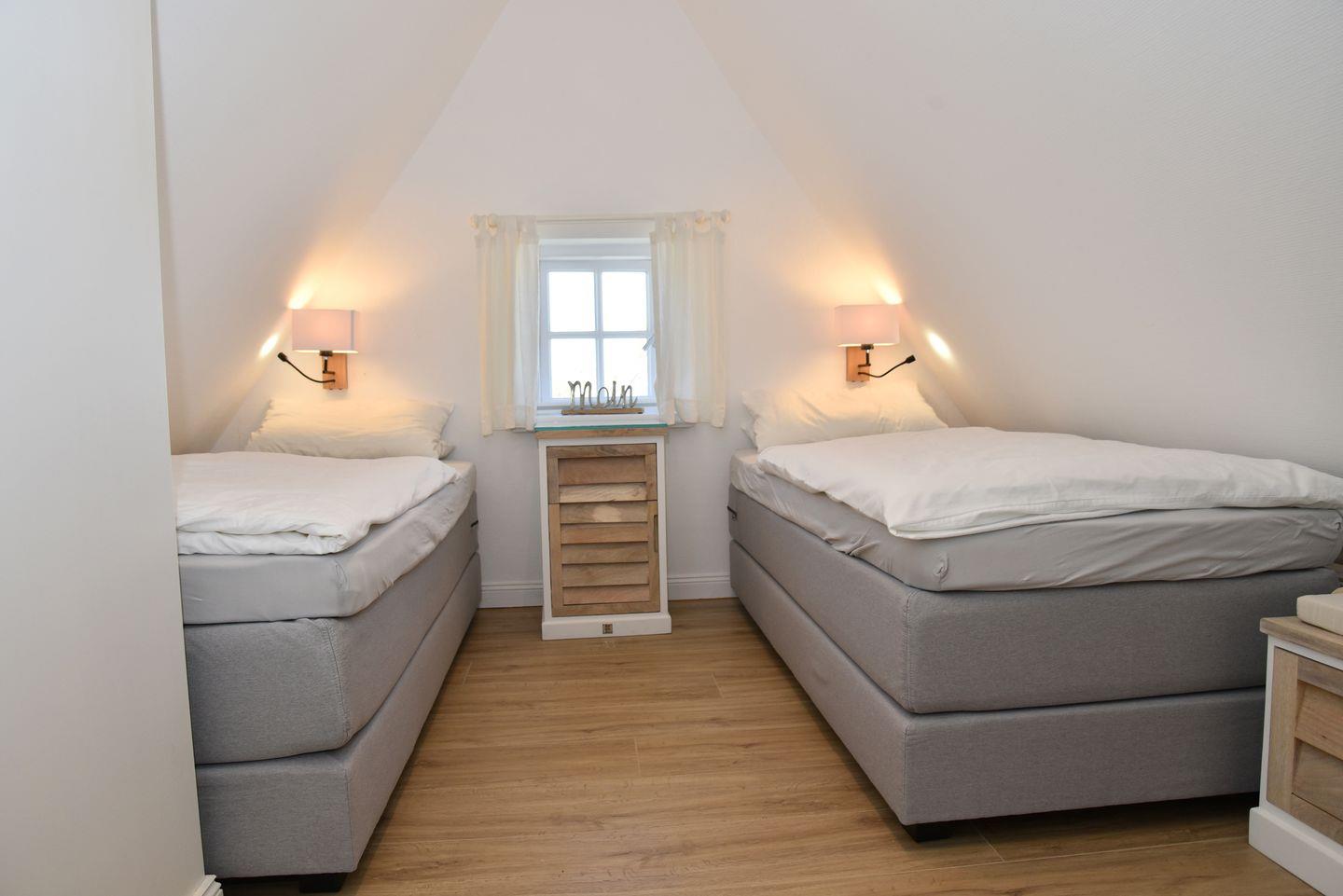 Im Dachgeschoss finden Sie den gemütlichen Schlafraum mit zwei Einzel-Boxspringbetten, wo Sie erholsame Nächte verbringen können.