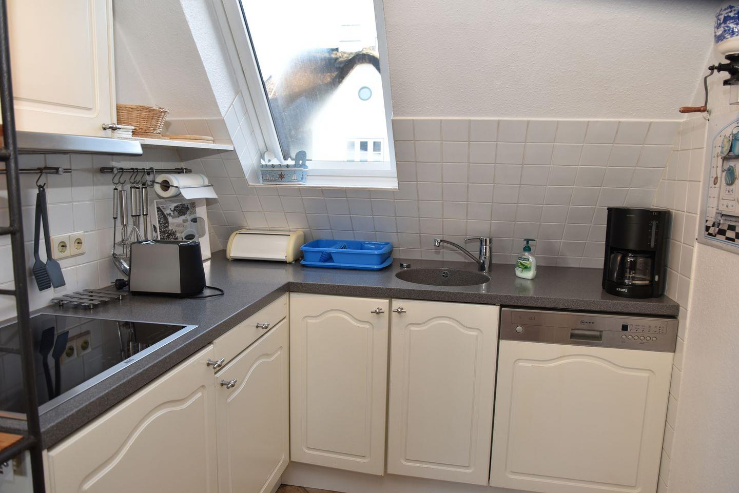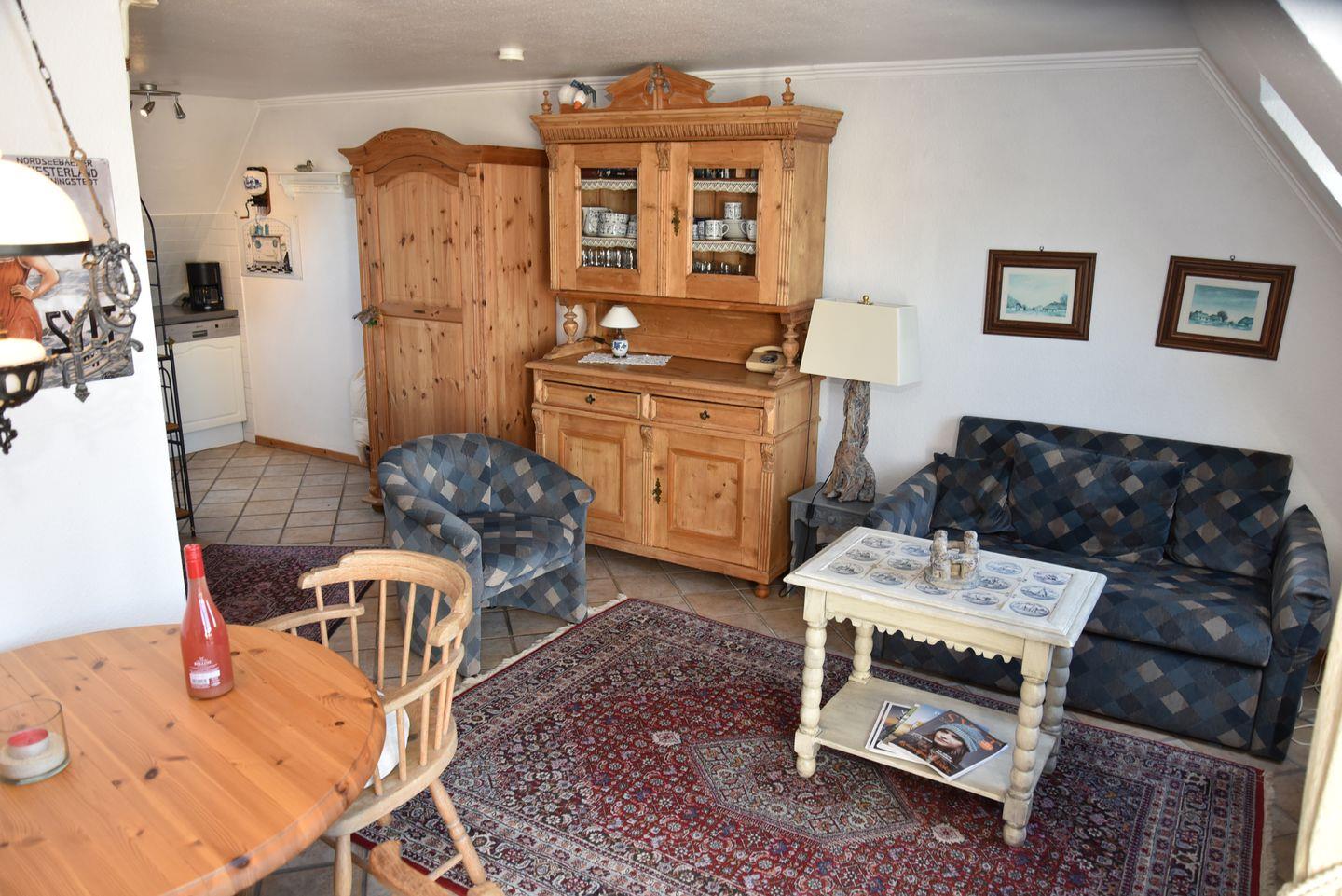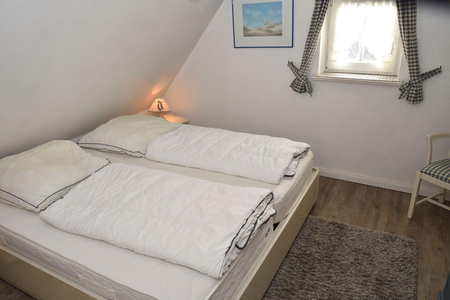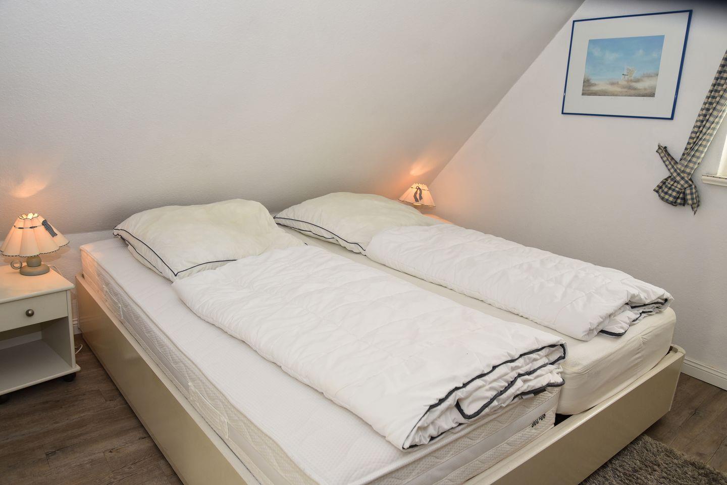 Im Obergeschoss befindet sich der Wohn-/Essbereich, der neben einer gut ausgestatteten Küche auch Zugang zum Duschbad gewährt. Der Westbalkon lädt dazu ein, die frische Nordseeluft zu genießen und den Tag entspannt ausklingen zu lassen. Im Dachgeschoss erwartet Sie ein behaglicher Doppelschlafraum, der für erholsame Nächte sorgt.