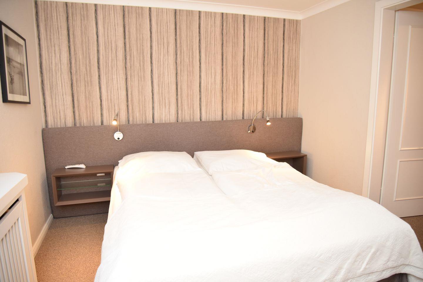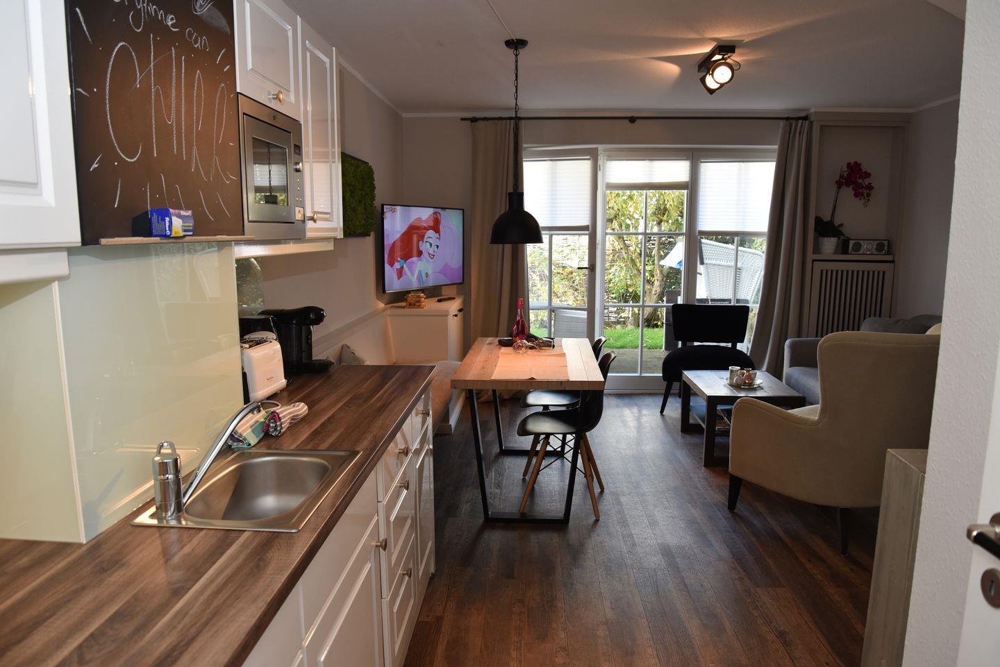 Das Erdgeschoss präsentiert einen großzügigen Wohn-/Essbereich mit einer gut ausgestatteten Küchenzeile, die keine Wünsche offen lässt. Von hier aus gelangen Sie auf eine sonnige Westterrasse, auf der Sie die wohltuende Meeresluft genießen können.