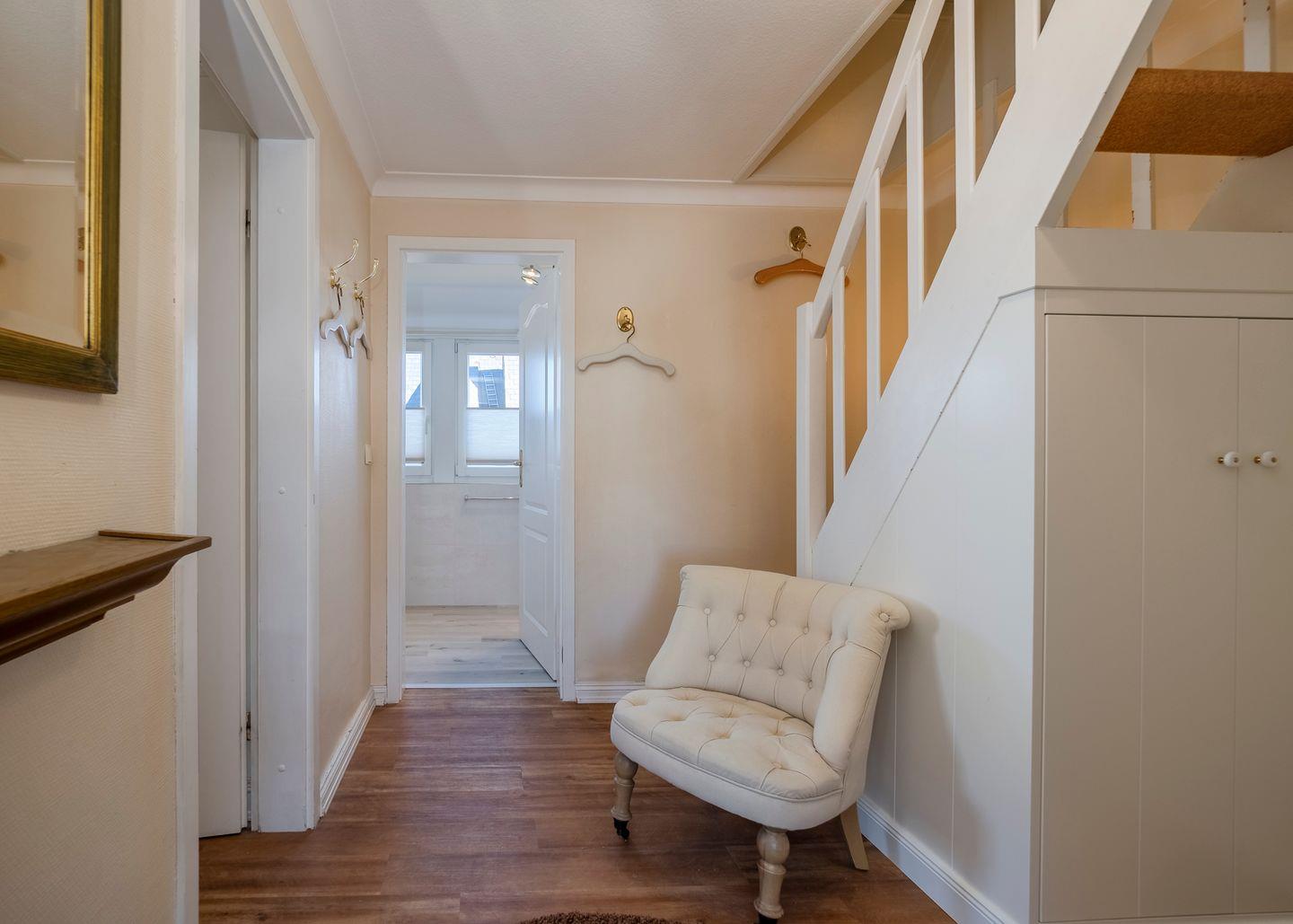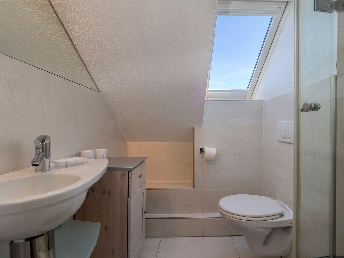 Im Obergeschoss finden Sie den Wohnraum mit einer separaten, voll ausgestatteten Küche, einen Doppelschlafraum sowie ein modernes Duschbad/WC. Das Dachgeschoss bietet einen weiteren Doppelschlafraum und ein zusätzliches Duschbad/WC. Die Einrichtung ist im modernen Landhausstil gehalten, und vom Balkon aus genießen Sie den Blick auf den gepflegten Garten.
