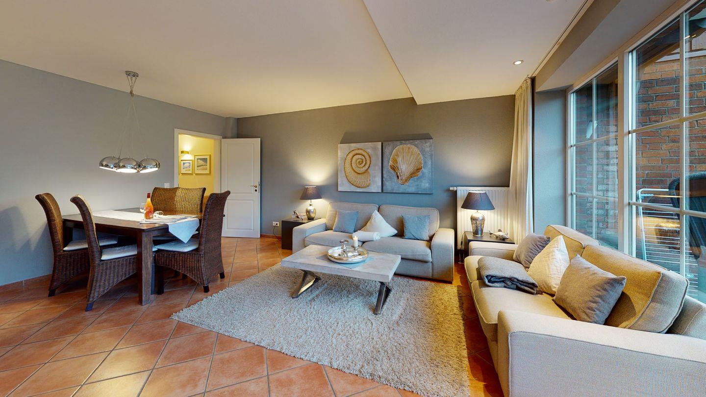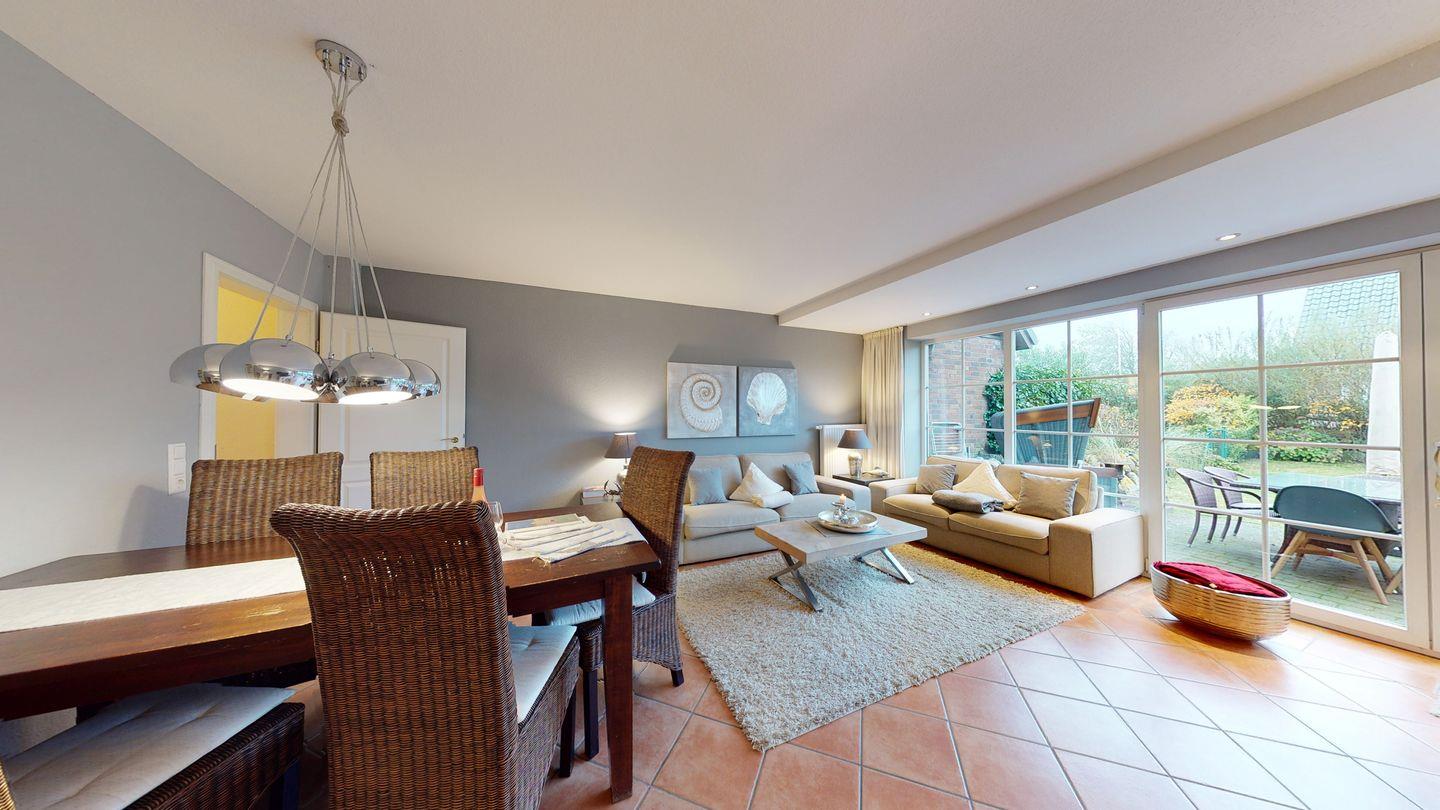 Willkommen in diesem wunderschönen Hausteil, wo Gemütlichkeit und Helligkeit Hand in Hand gehen. Das außergewöhnlich helle Wohnzimmer empfängt Sie mit zwei einladenden Sofas und einem großzügigen Esstisch, perfekt für gesellige Abende. Genießen Sie die Sonne auf der Terrasse nach Süden, ausgestattet mit einem gemütlichen Strandkorb und stilvollen Gartenmöbeln.