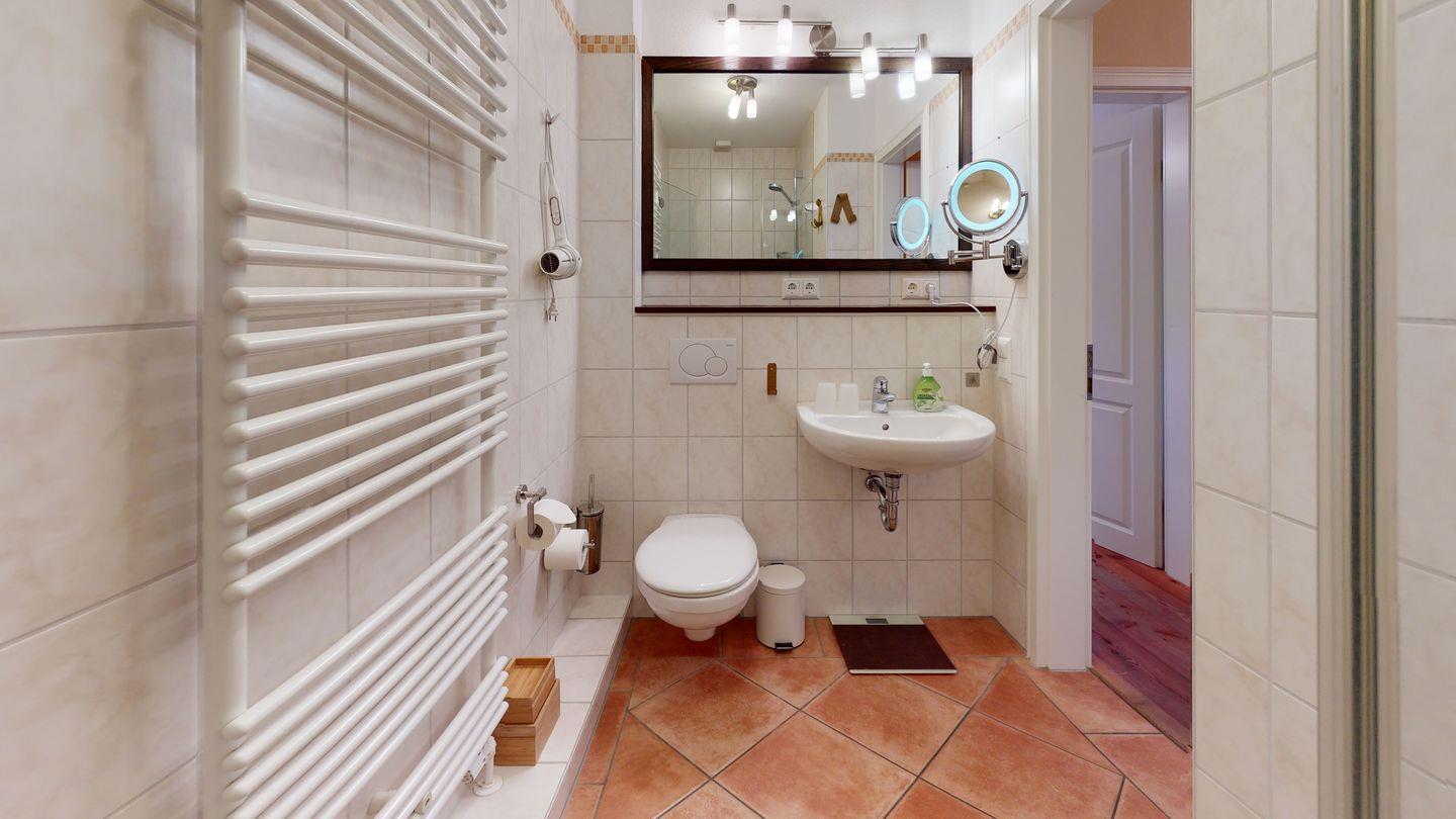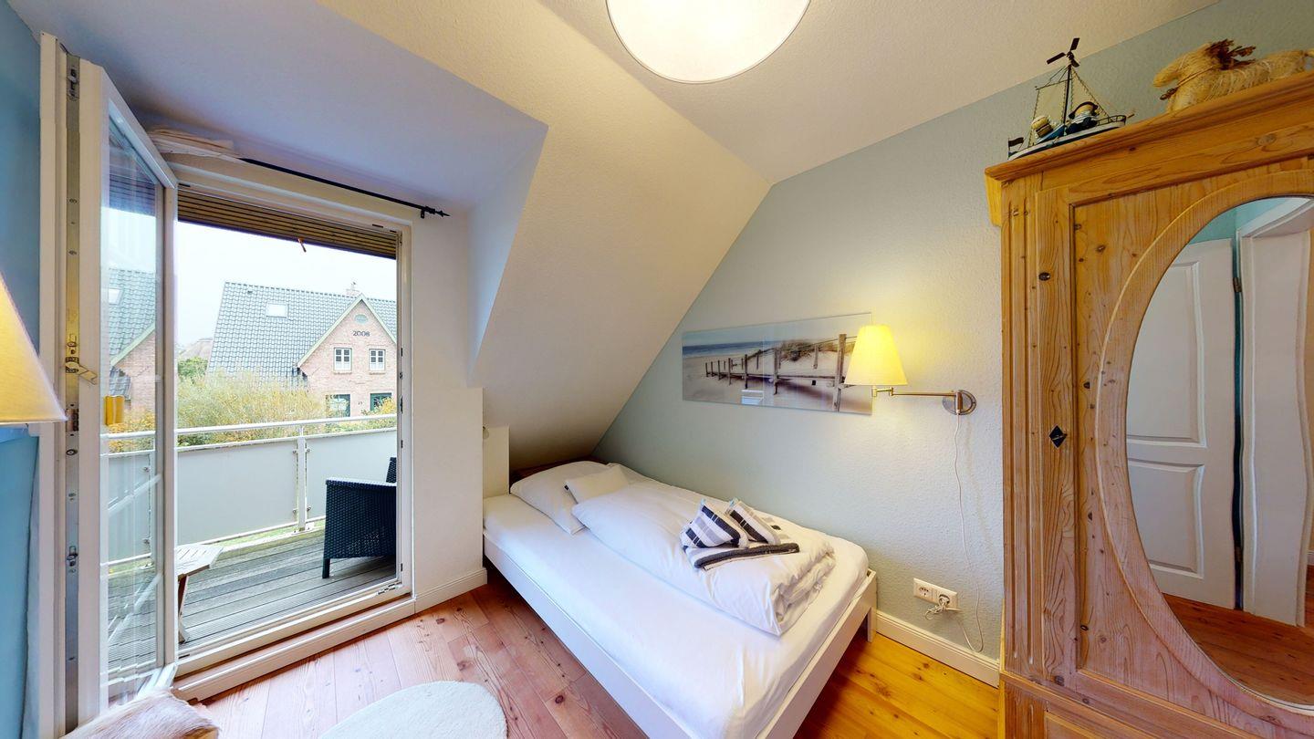 Im Obergeschoss erwarten Sie ein behaglicher Doppelschlafraum sowie zwei Schlafzimmer mit Einzelbetten und einem Balkon, perfekt für ruhige Momente im Freien. Ein weiteres Duschbad komplettiert das Angebot dieses charmanten Hausteils.