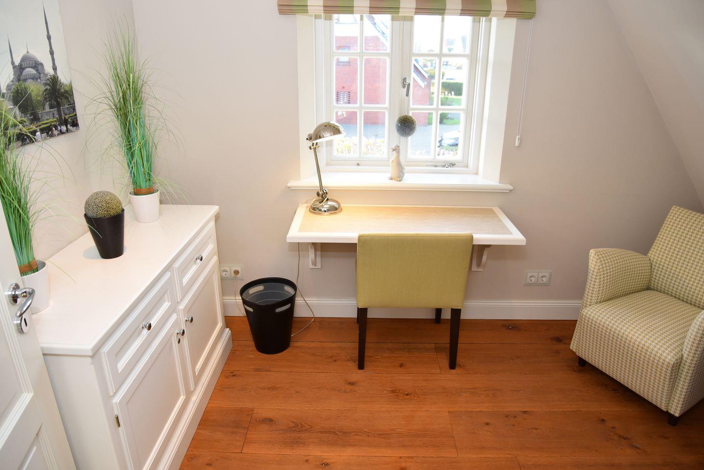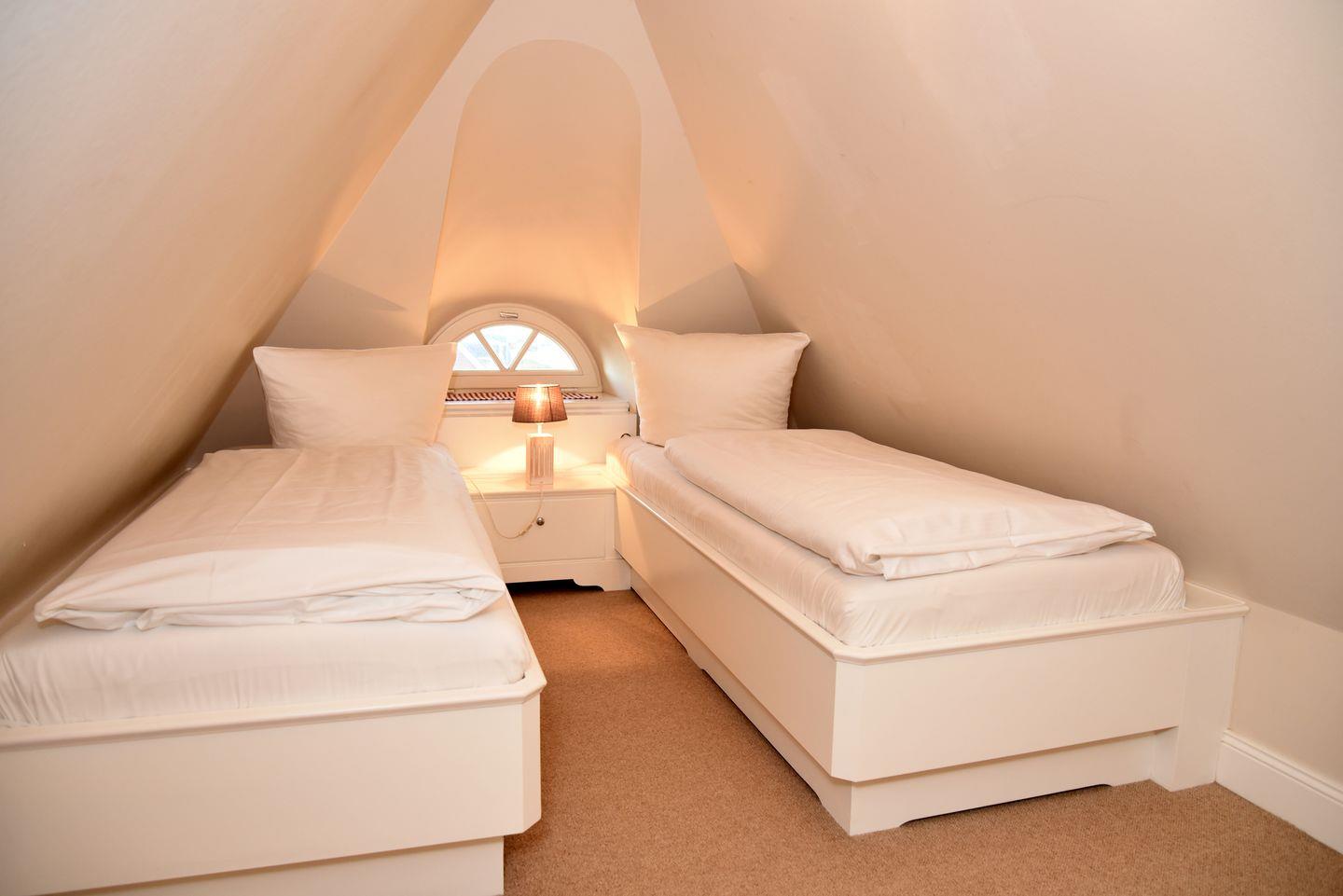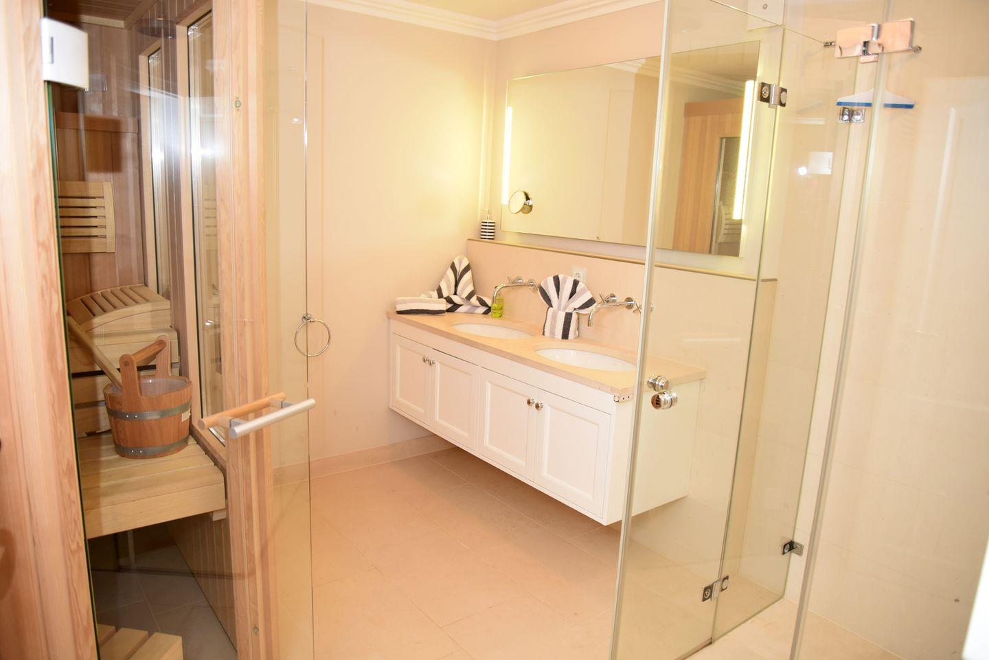 Im Untergeschoss befinden sich ein Doppelschlafraum mit eigenem Duschbad, ein weiterer Doppelschlafraum, ein Badezimmer mit Sauna sowie ein Wirtschaftsraum mit Waschmaschine und Trockner. Das 1. Obergeschoss bietet einen weiteren Doppelschlafraum und ein Duschbad. Zusätzlich steht ein weiteres Zimmer mit Schreibtisch bereit, das Raum für kreative Ideen oder gelegentliche Arbeiten schafft. Unter dem Dach finden Sie zwei Einzelbetten für zusätzlichen Komfort.