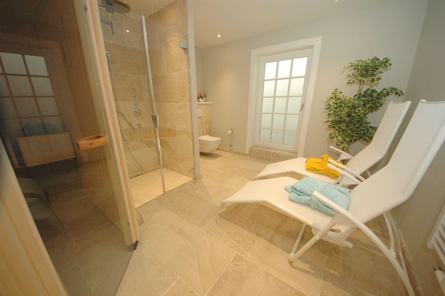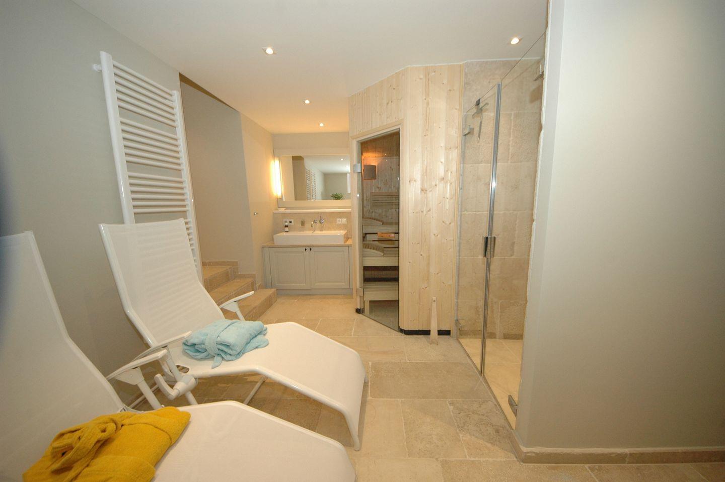 Im Untergeschoss erwarten Sie 2 Doppelschlafzimmer und 2 Bäder, darunter eines mit Sauna für entspannende Momente. Im Obergeschoss befindet sich ein geräumiger Doppelschlafraum, ein Wannen-/Duschbad und ein weiteres Bad für das Schlafzimmer im Dachgeschoss mit 2 Einzelbetten. Ein Gäste-WC im Erdgeschoss rundet das Angebot ab.