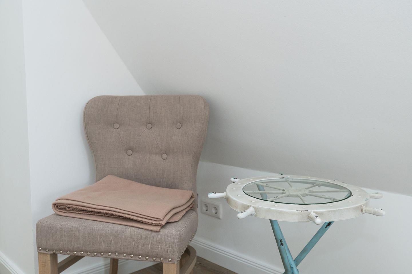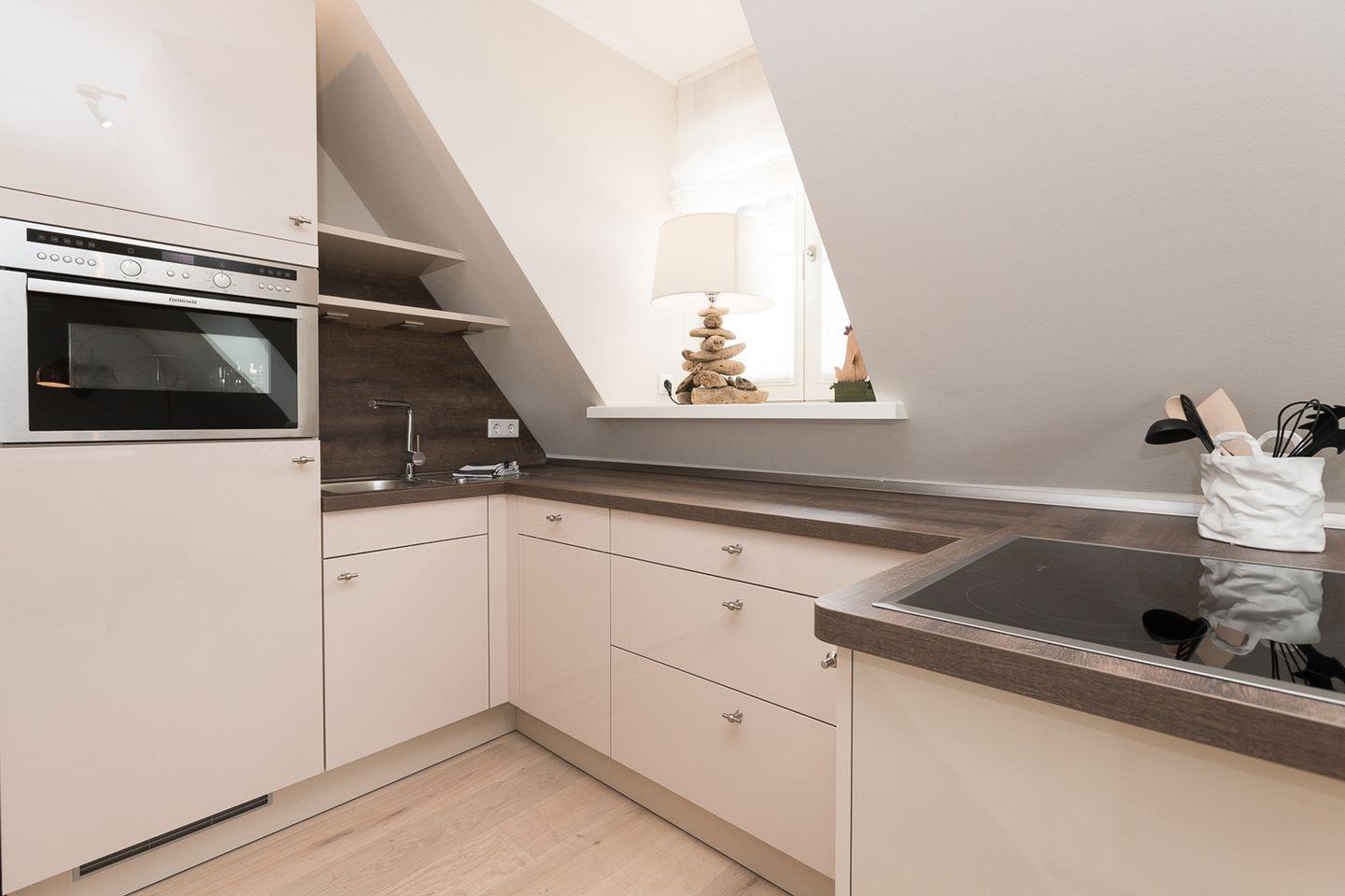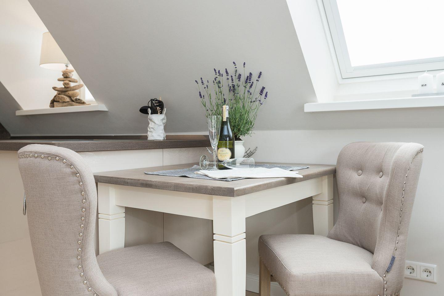 Die außergewöhnlich gestaltete Obergeschoss-/Dachgeschoss-Endwohnung mit Balkon bietet auf großzügigen 56 qm Platz für 3 Personen. Im Dachgeschoss erwartet Sie ein geräumiger Wohnraum mit einer gemütlichen Schlafcouch sowie ein elegantes Duschbad/WC. Im Dachgeschoss befinden sich zudem ein Doppelschlafraum und ein Gäste-WC. Die Küche fügt sich nahtlos in den Gesamtstil ein und ist mit einem Geschirrspüler, Backofen und Herd ausgestattet.
