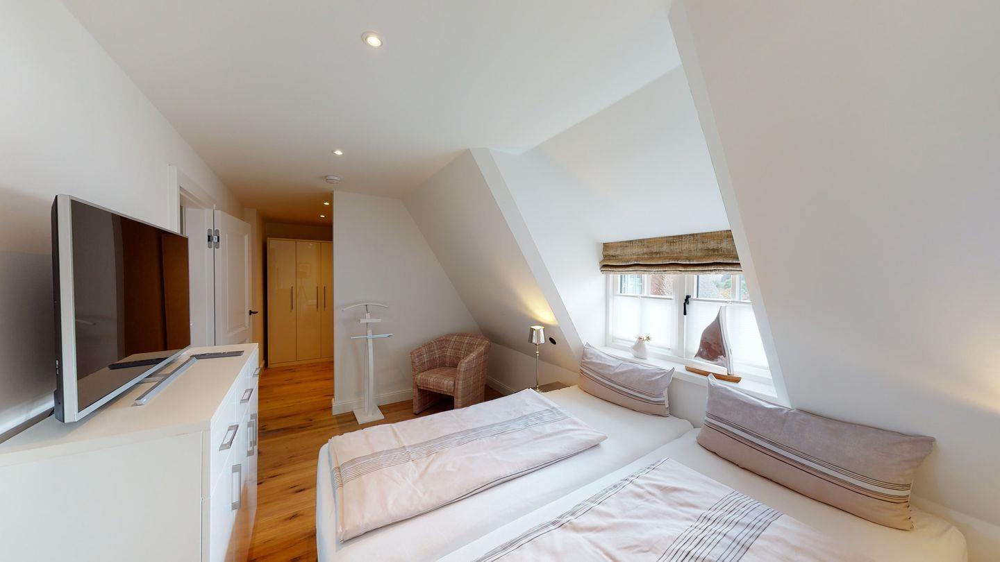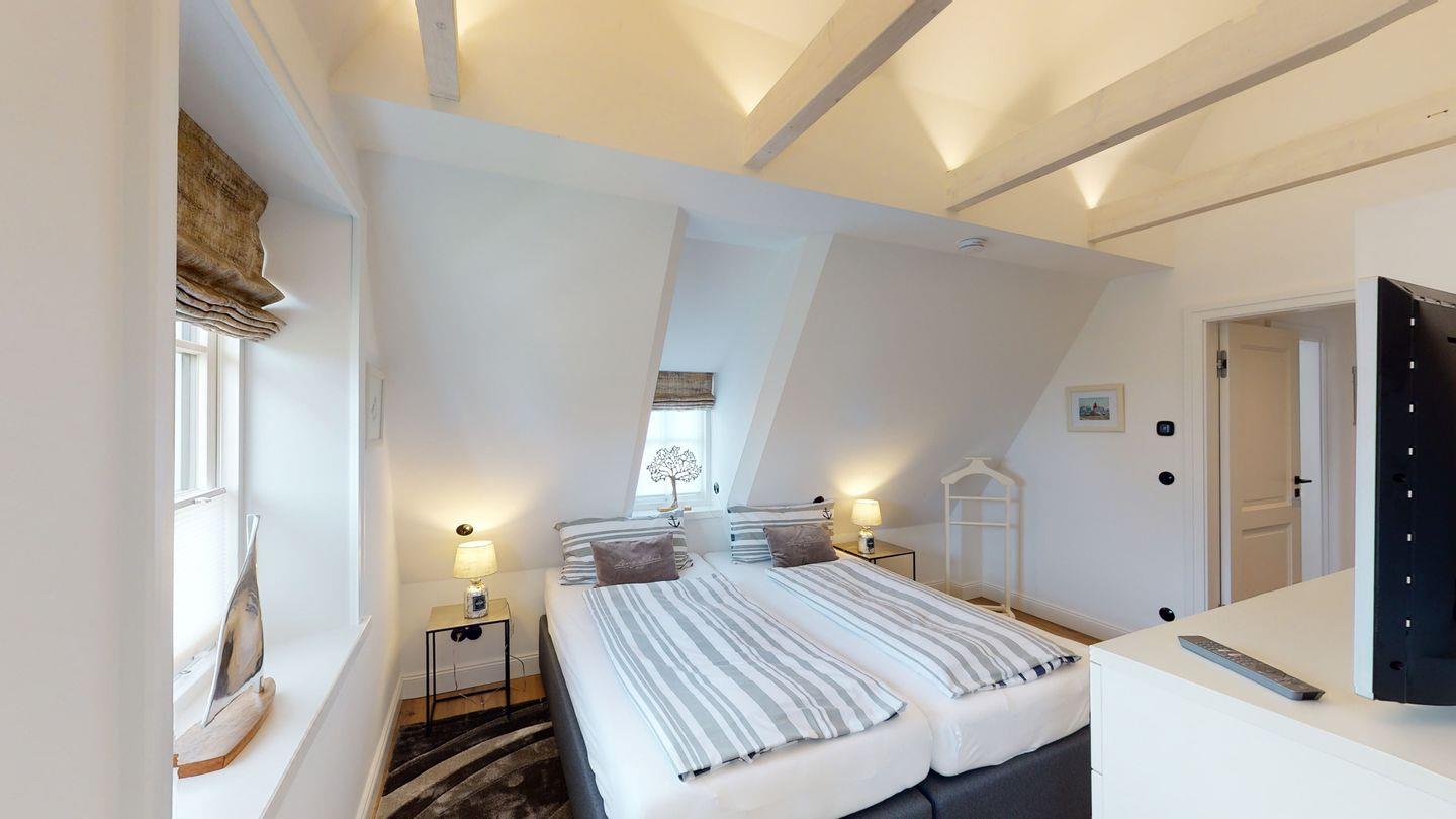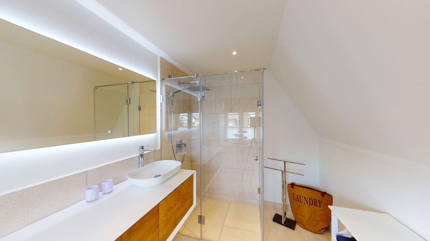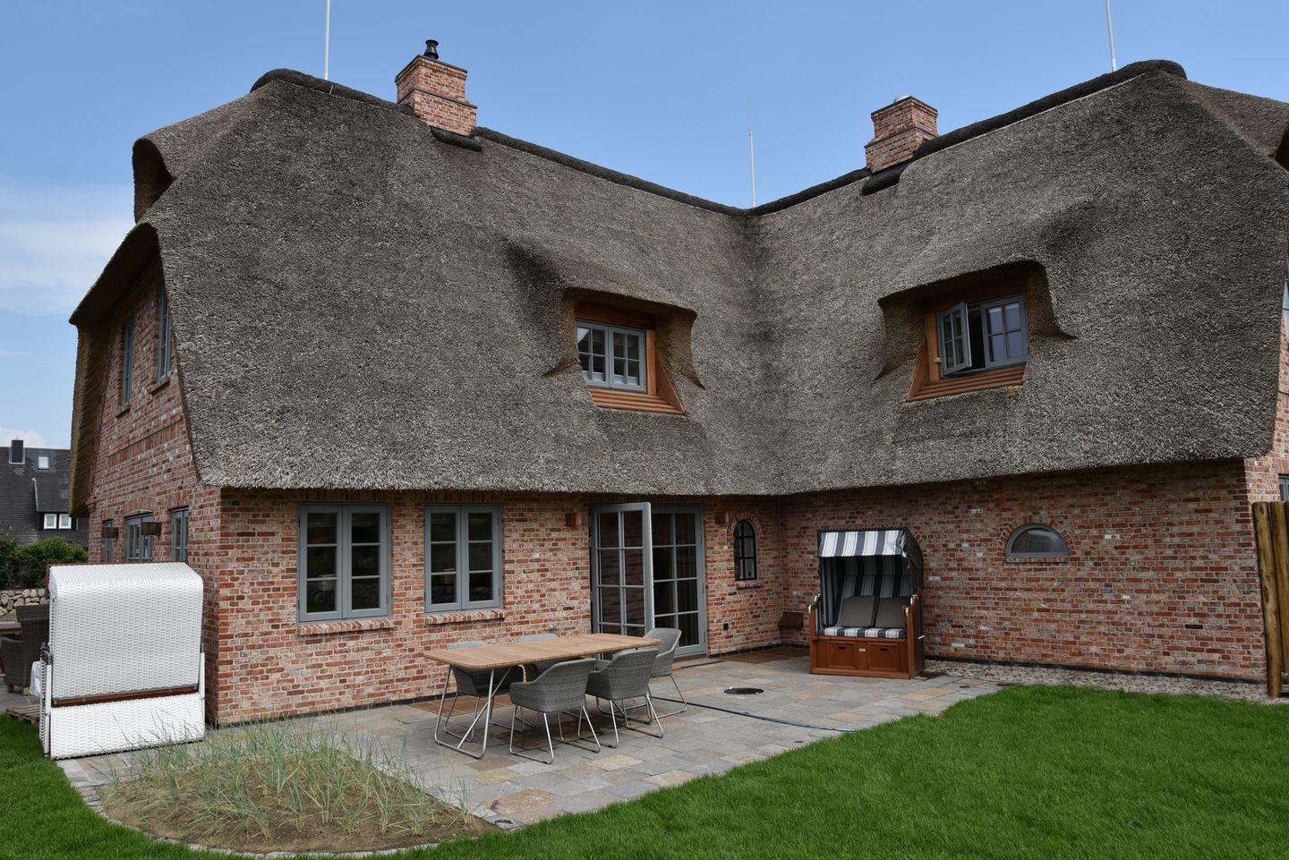 Das gemütliche Wohnzimmer lädt zum Verweilen vor dem verglasten Gas-Kamin ein. Im Dachgeschoss erwartet Sie ein Masterbedroom mit eigenem Duschbad, sowie ein Schlafraum mit 2 Einzelbetten und ein weiteres Duschbad. Im Untergeschoss befinden sich zwei weitere Doppelschlafzimmer, ein weiteres Duschbad mit Sauna und ein Gäste-WC. Genießen Sie entspannte Stunden auf der großen Südwest-Terrasse mit Blick auf den Garten. Zwei PKW-Stellplätze stehen Ihnen ebenfalls zur Verfügung. Tauchen Sie ein in die luxuriöse Atmosphäre dieses besonderen Domizils direkt am Meer.