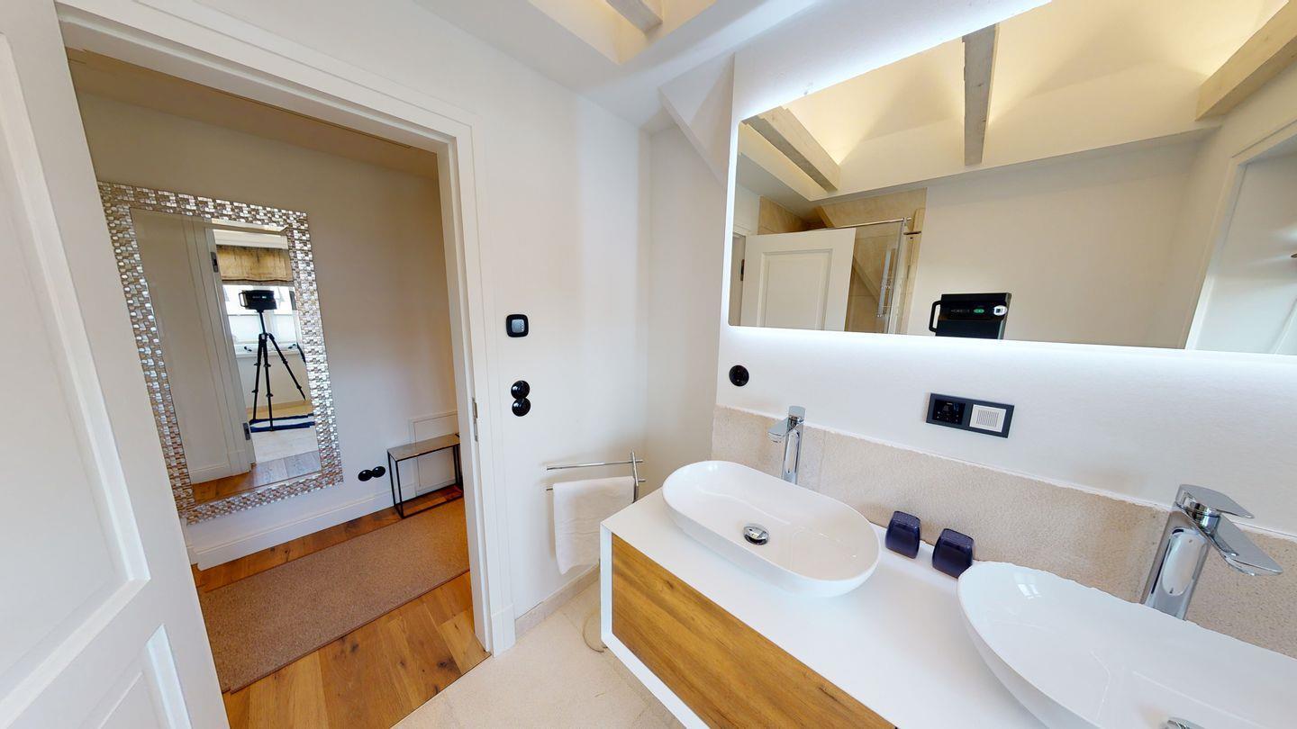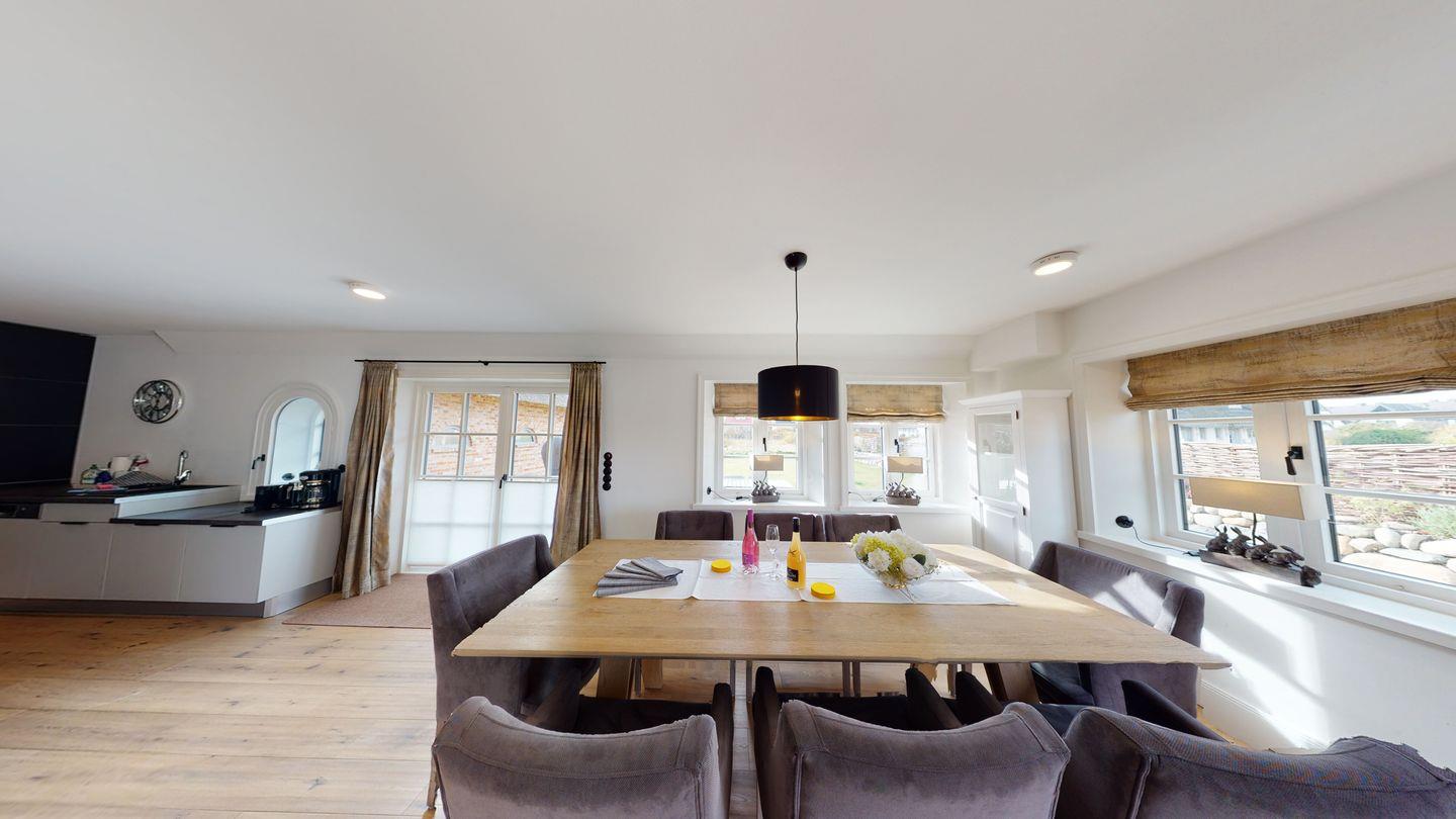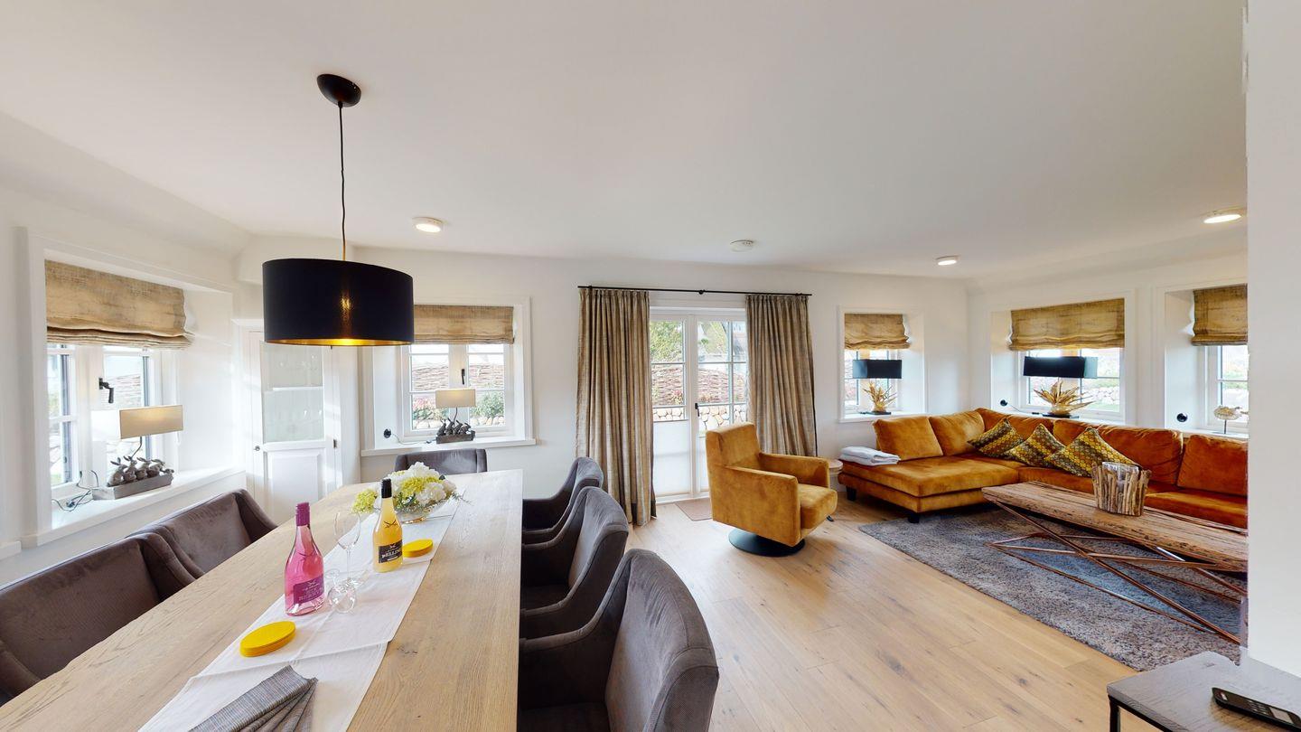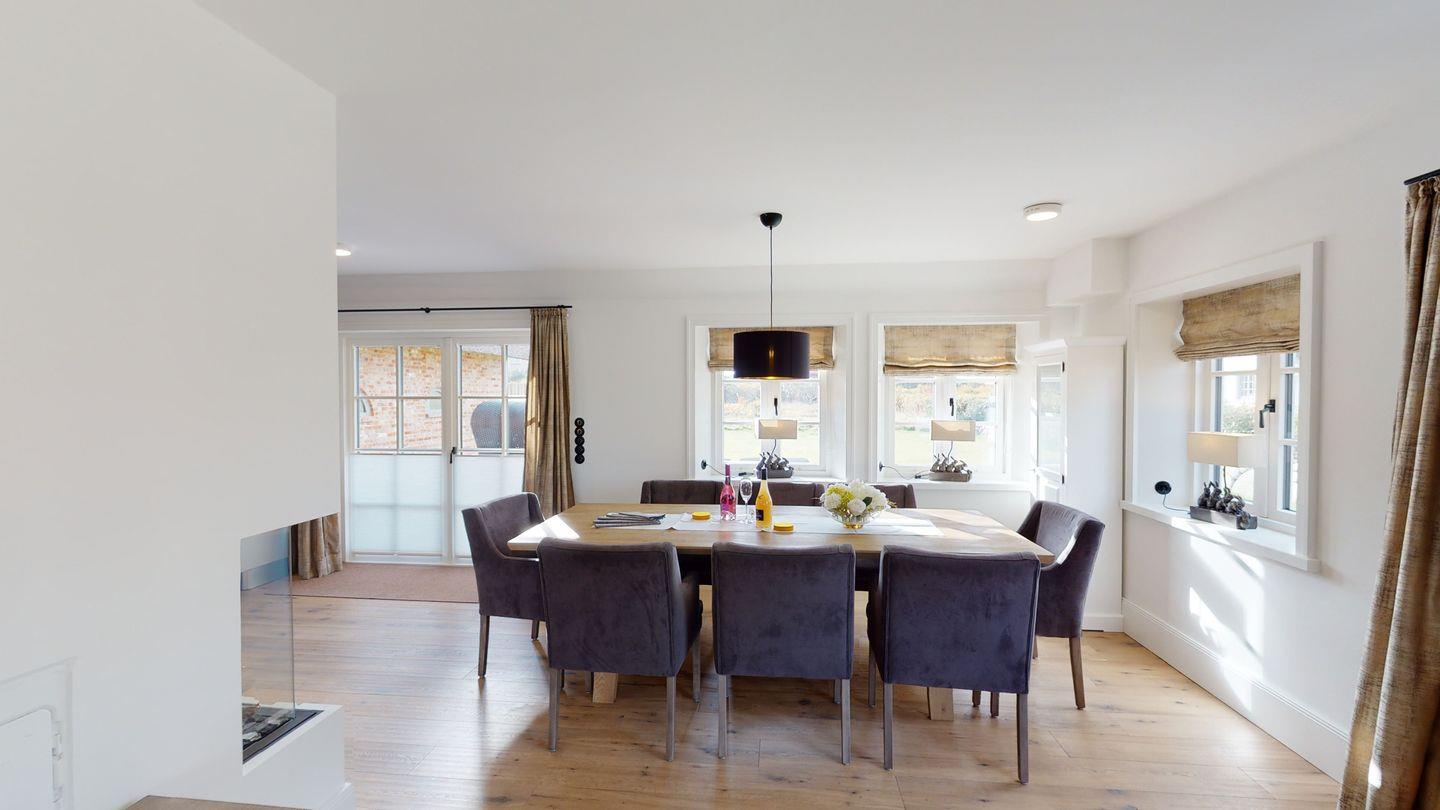 Willkommen in dieser außergewöhnlichen Friesenhälfte direkt am Meer, die Anfang 2020 fertiggestellt wurde. Auf großzügigen 215 qm erwartet Sie ein erlesener und besonderer Luxus. Die hochwertige Ausstattung reicht von Natursteinböden über Eichenvollholzdielen und Parkett-Balkendecken bis hin zu drei exklusiven Natursteinbädern. Die Designer-Einbauküche mit Bora-Kochinsel bildet das Herzstück, während Sie Ihr Frühstück in der Essecke des offenen Wohn-/Essbereichs genießen können. Ein Gäste-WC im Erdgeschoss sorgt für zusätzlichen Komfort.