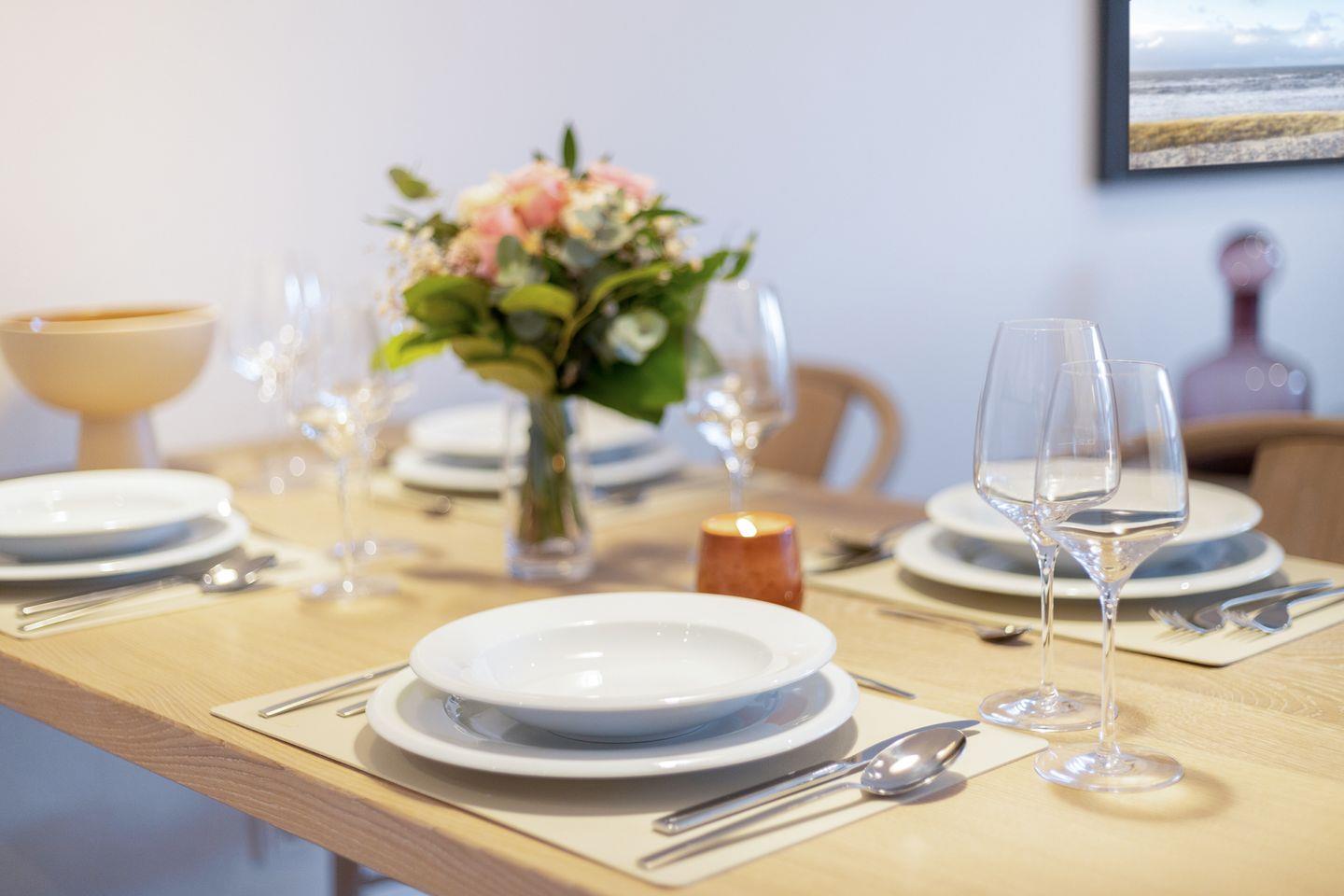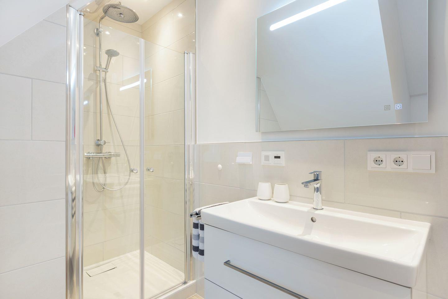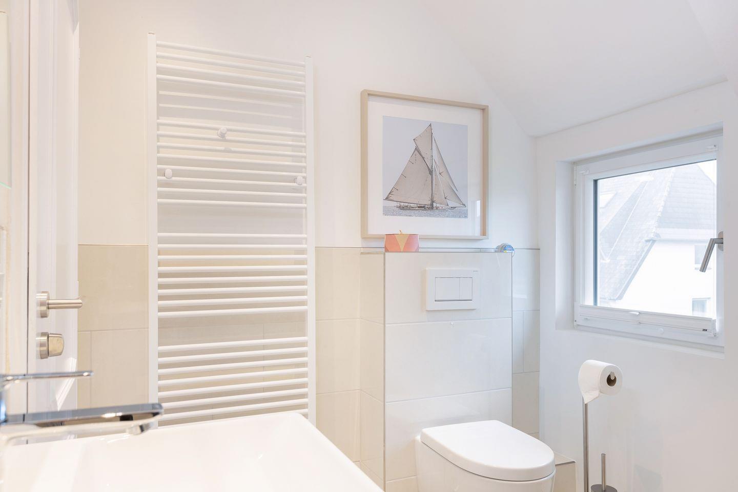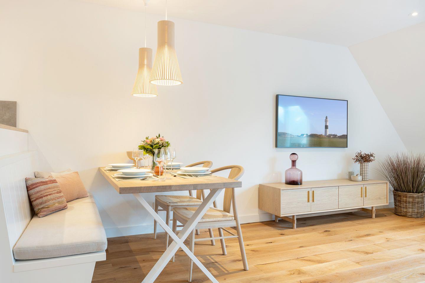 Die ca. 65 qm große Wohnung erstreckt sich über das 1. OG und das Dachgeschoss und bietet eine moderne und gemütliche Atmosphäre. Im 1. OG erwartet Sie ein großzügiger Wohn-/Essbereich mit einer vollausgestatteten Küche, die keine Wünsche offen lässt. Hier können Sie kulinarische Köstlichkeiten zubereiten und sie anschließend am Esstisch genießen. Das angrenzende Duschbad sorgt für zusätzlichen Komfort. Der Südwest-Balkon lädt dazu ein, die frische Meeresluft und die Sonne zu genießen.