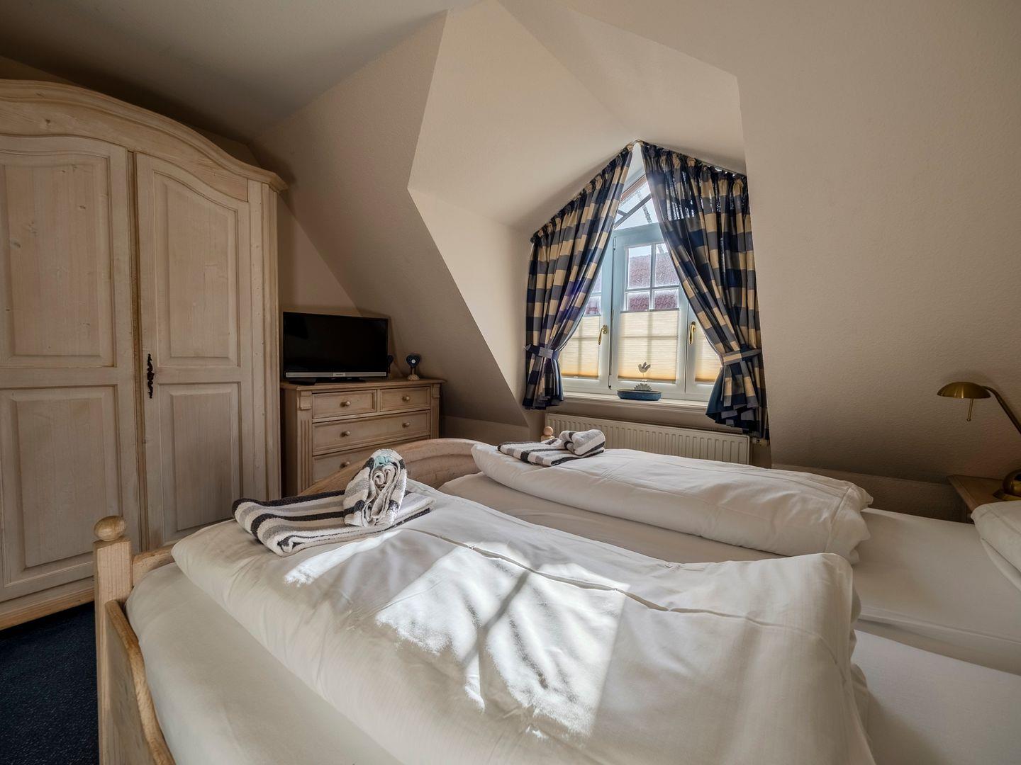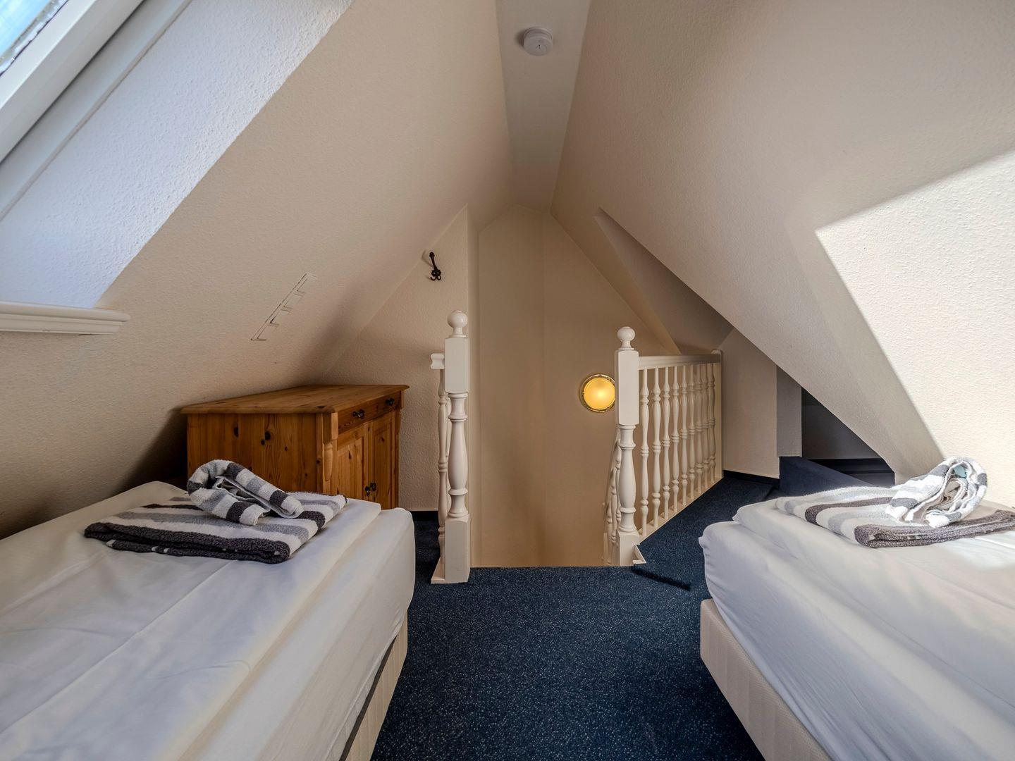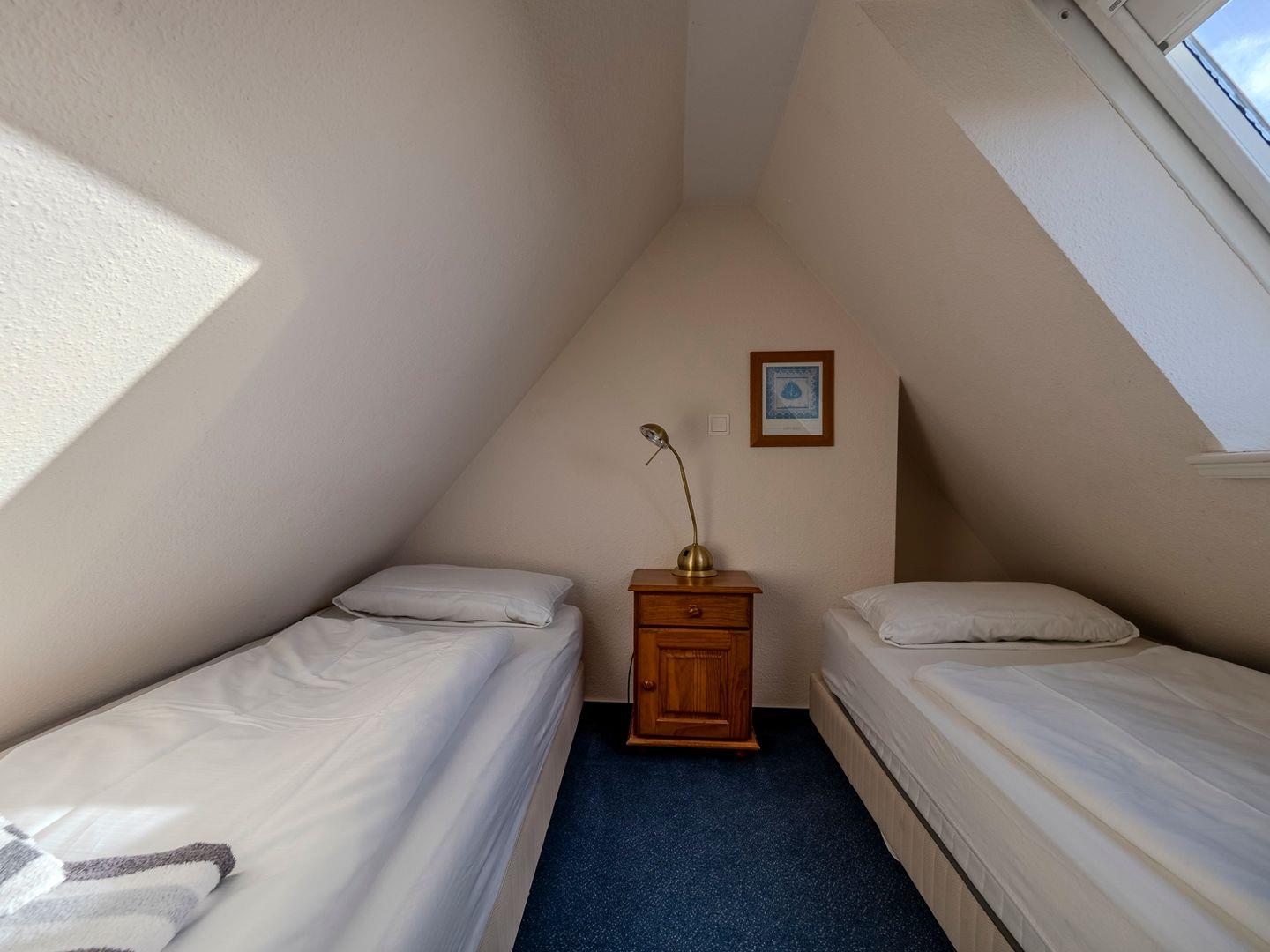Im ersten Obergeschoss finden Sie einen behaglichen Doppelschlafraum sowie das moderne Duschbad, das auch eine Waschmaschine für Ihren Komfort beherbergt. Im Dachgeschoss erwartet Sie ein weiterer Schlafraum mit zwei Einzelbetten, der eine gemütliche Atmosphäre zum Entspannen bietet.