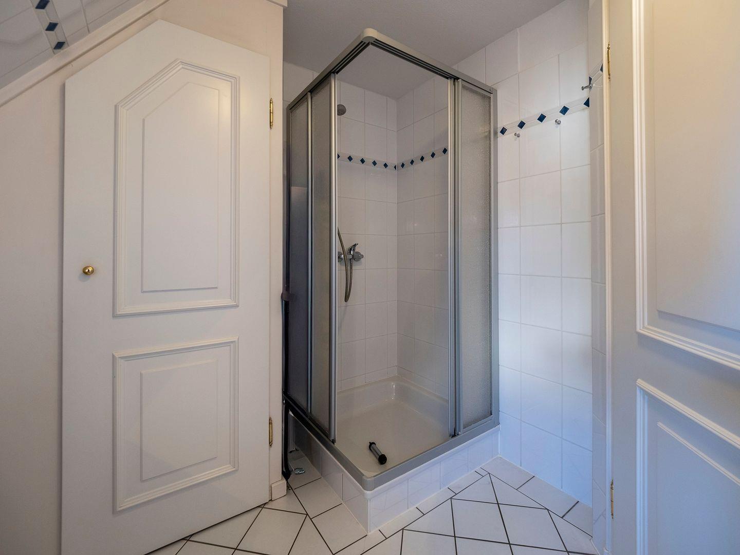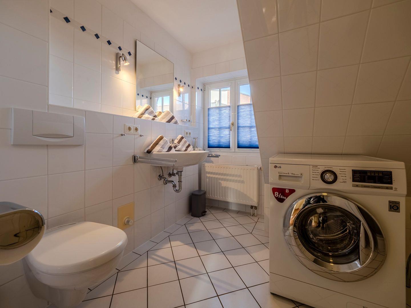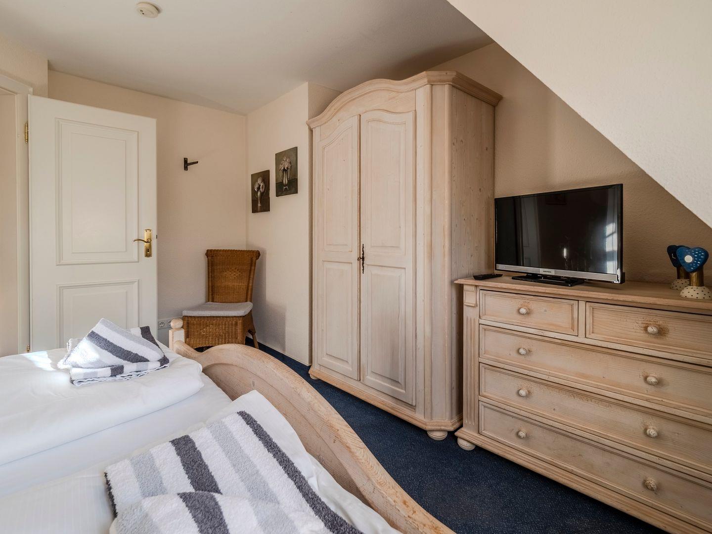 Im ersten Obergeschoss finden Sie einen behaglichen Doppelschlafraum sowie das moderne Duschbad, das auch eine Waschmaschine für Ihren Komfort beherbergt. Im Dachgeschoss erwartet Sie ein weiterer Schlafraum mit zwei Einzelbetten, der eine gemütliche Atmosphäre zum Entspannen bietet.