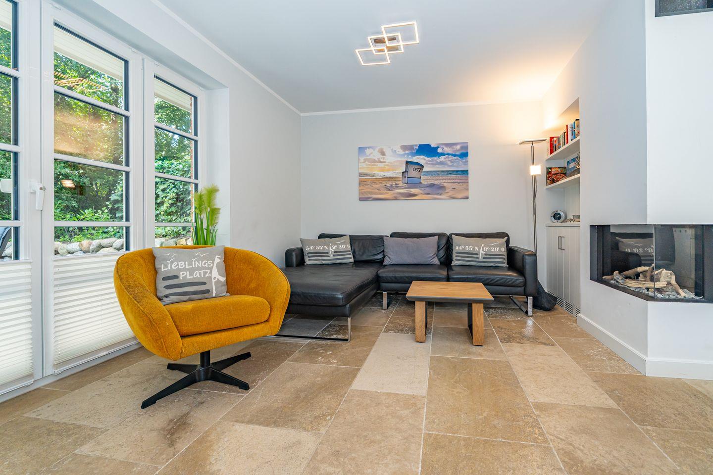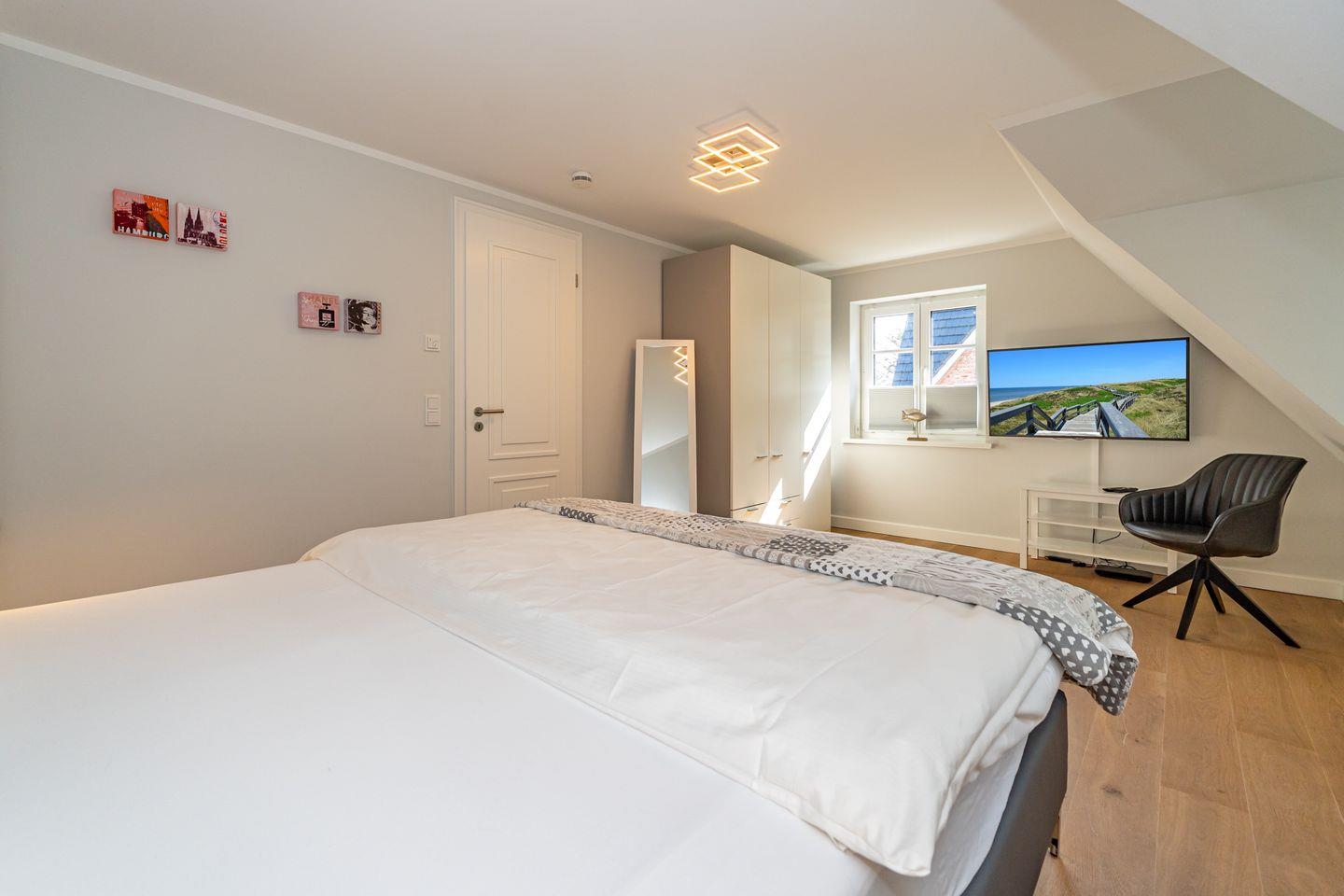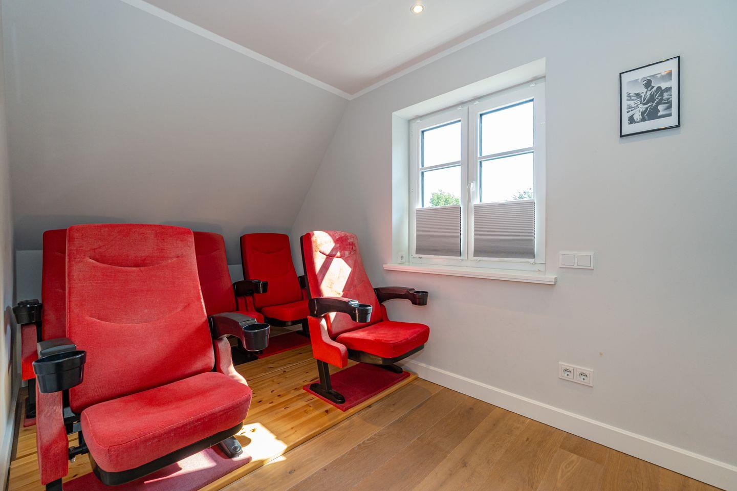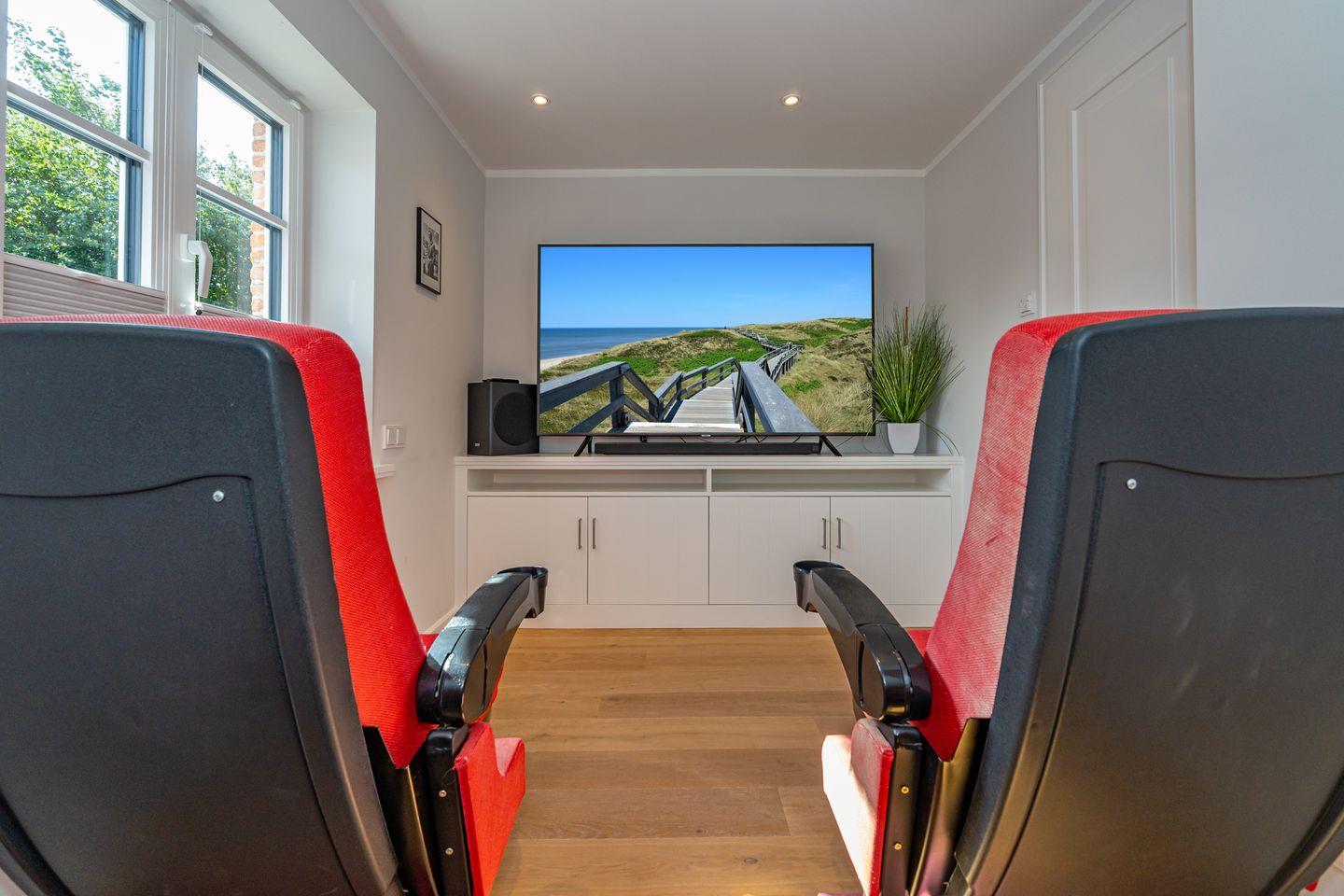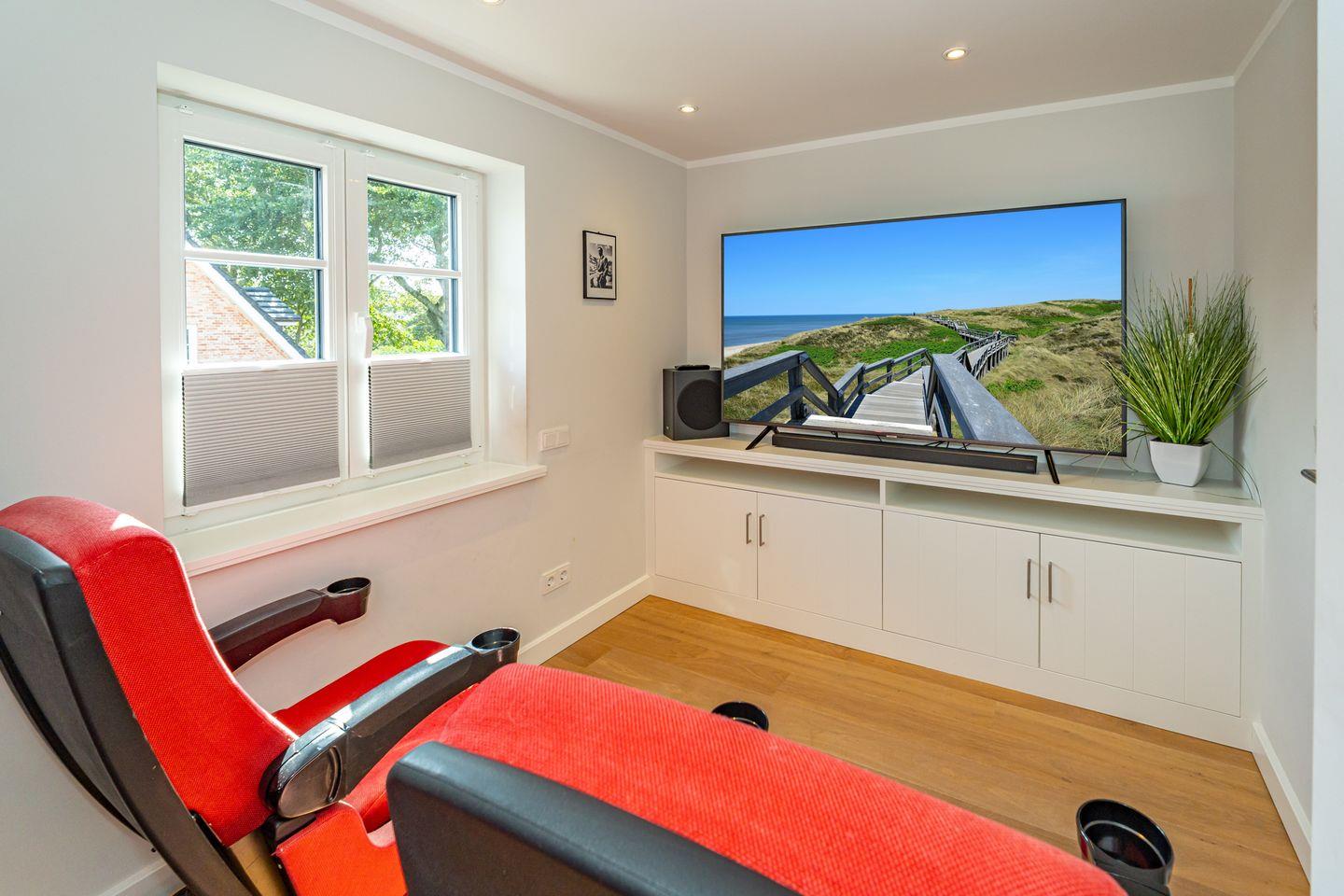 Im Erdgeschoss erwartet Sie ein Flur mit Garderobe. Von hier geht ein Gäste WC ab. Ebenfalls das geräumige und helle Wohn- und Esszimmer. Hier wartet Sie ein kuscheliger Gas Kamin, Sofa, TV und Essplatz. Angrenzend an diesen Bereich ist die offene Küche, hier können Sie köstliche Mahlzeiten zubereiten. Sie ist ausgestattet mit eine, Backofen, Induktionsherd mit Bora Feld, Geschirrspülmaschine, Gefrierschrank und Kaffeefiltermaschine. Vom Wohn- und Essbereich haben Sie Zutritt zum Garten mit Terrasse, Gartenmöbeln und Strandkorb. Über eine Treppe gelangen Sie in das erste OG, hier befindet sich ein Schlafzimmer mit Doppelbett (180x200), ein Badezimmer mit Dusche und Doppelwaschbecken. Als Highlight erwartet Sie auf dieser Ebene ein Kinoraum mit extra großem Smart-TV und gemütlichen Kinosesseln. Über eine weitere Treppe gelangen Sie in den Spitzboden, wo sich ein Schlafzimmer mit zwei Einzelbetten (je 90x200) und ein Gäste WC befinden. Im Souterrain des Hauses ist ein weiteres Schlafzimmer mit Doppelbett (180x200) und ein Badezimmer mit Dusche und Sauna. Zum Ferienhaus gehört ein PKW Stellplatz.