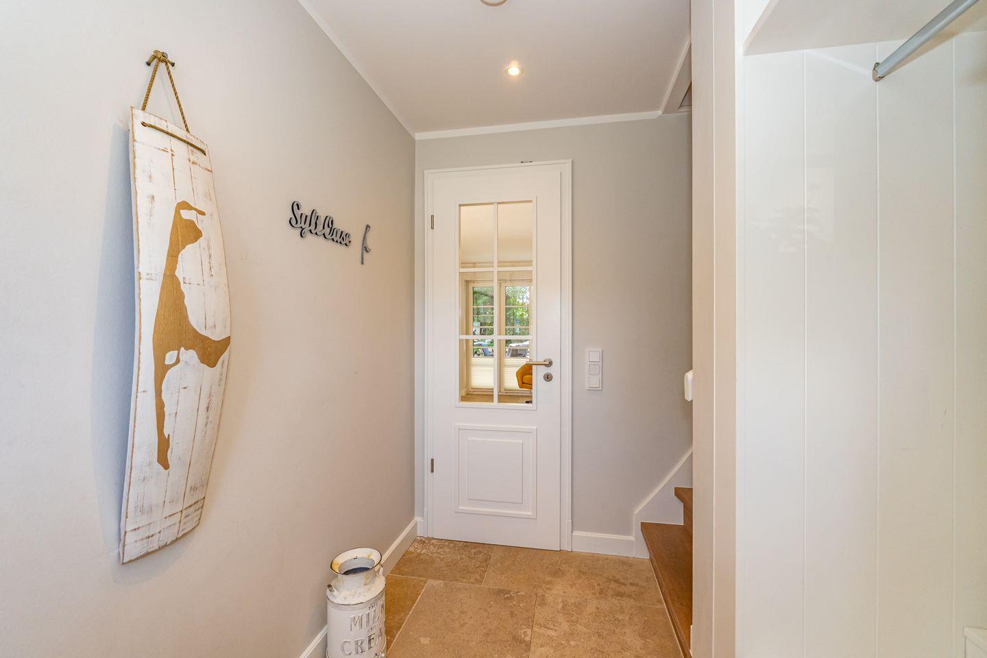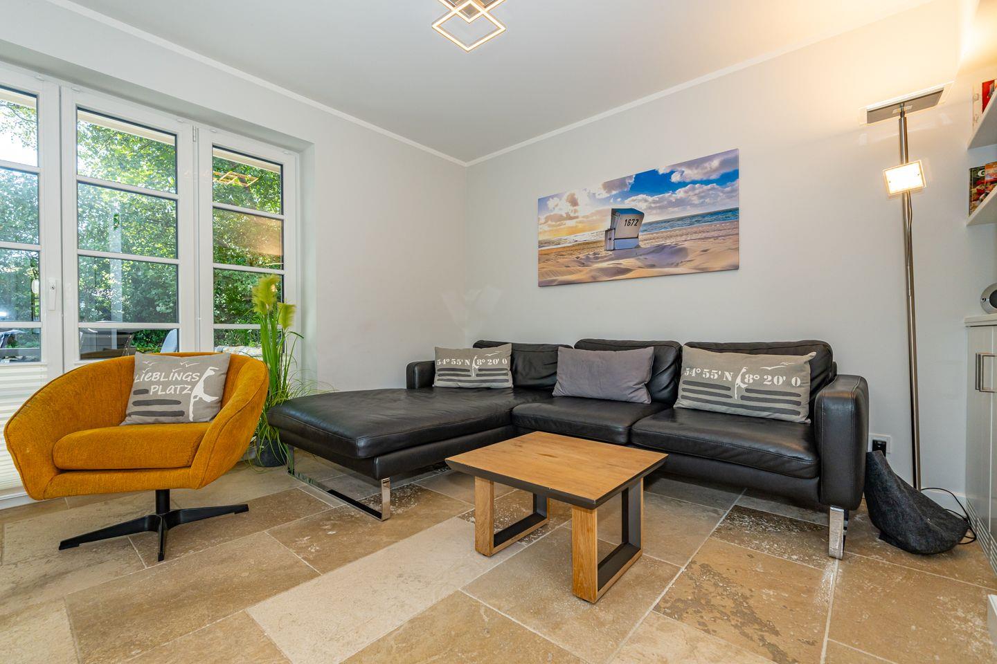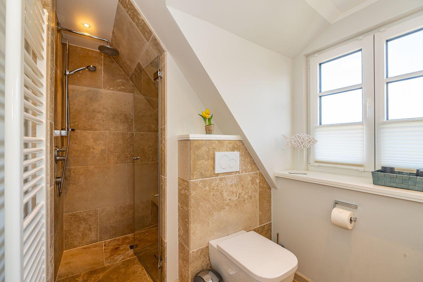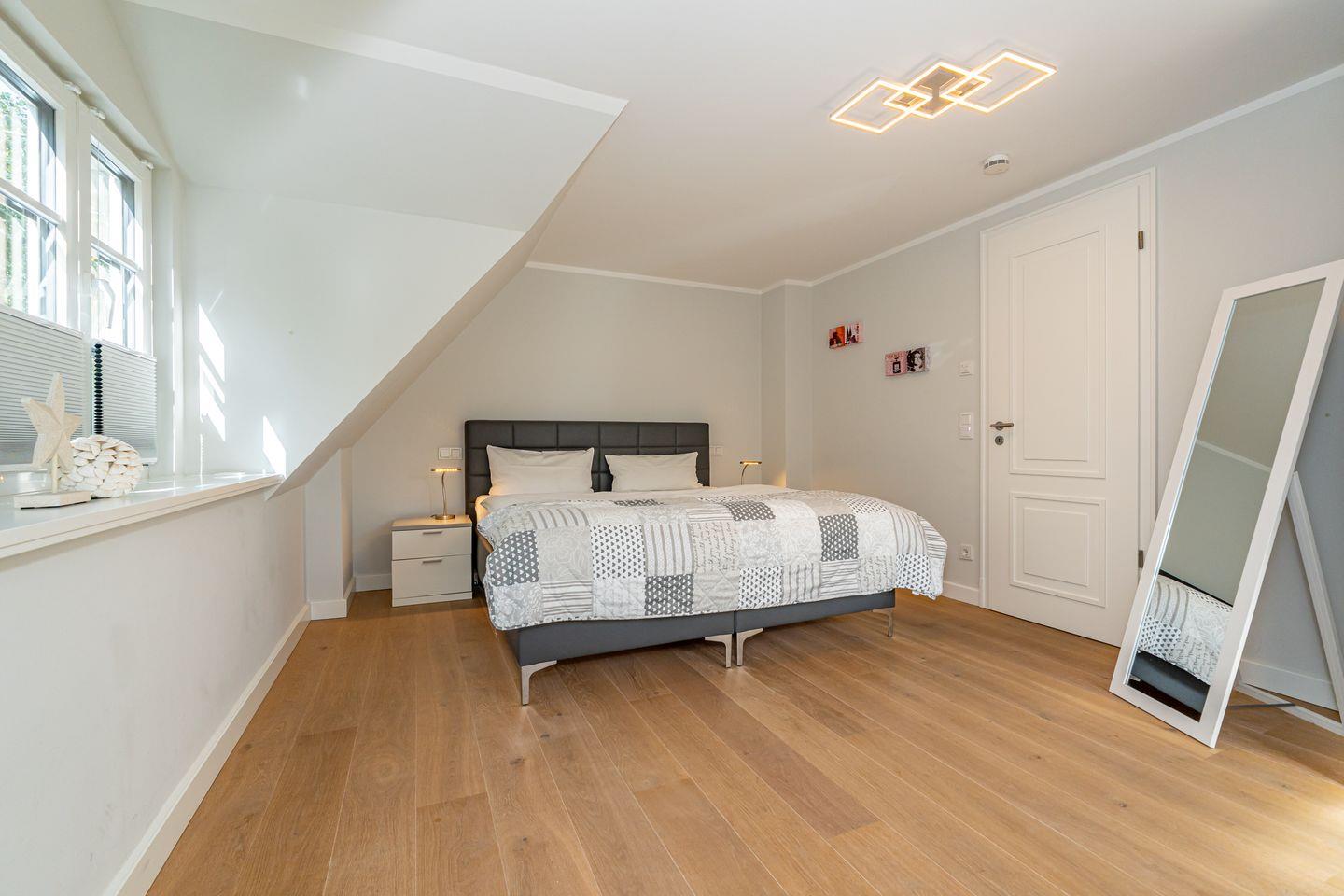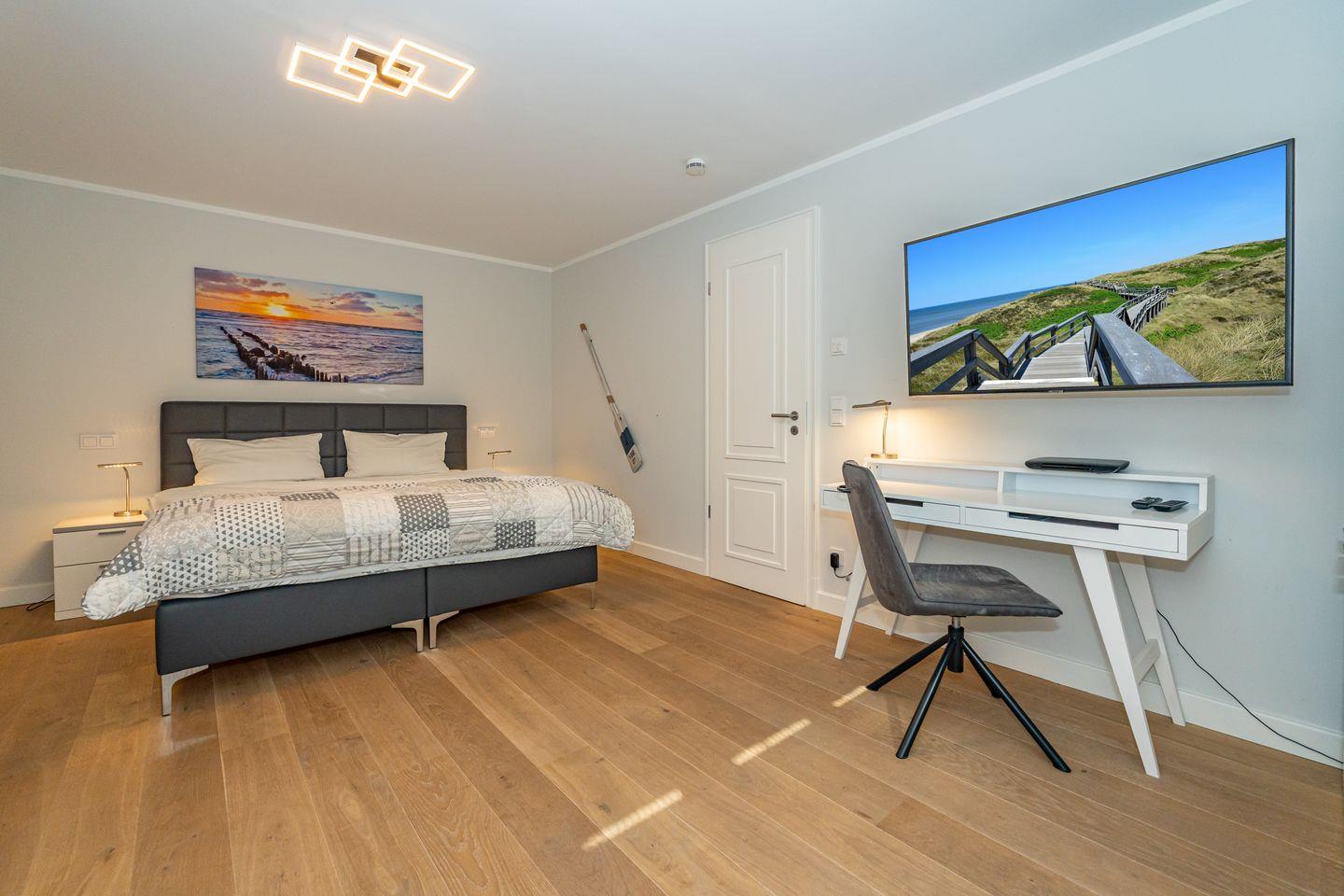 Im Erdgeschoss erwartet Sie ein Flur mit Garderobe. Von hier geht ein Gäste WC ab. Ebenfalls das geräumige und helle Wohn- und Esszimmer. Hier wartet Sie ein kuscheliger Gas Kamin, Sofa, TV und Essplatz. Angrenzend an diesen Bereich ist die offene Küche, hier können Sie köstliche Mahlzeiten zubereiten. Sie ist ausgestattet mit eine, Backofen, Induktionsherd mit Bora Feld, Geschirrspülmaschine, Gefrierschrank und Kaffeefiltermaschine. Vom Wohn- und Essbereich haben Sie Zutritt zum Garten mit Terrasse, Gartenmöbeln und Strandkorb. Über eine Treppe gelangen Sie in das erste OG, hier befindet sich ein Schlafzimmer mit Doppelbett (180x200), ein Badezimmer mit Dusche und Doppelwaschbecken. Als Highlight erwartet Sie auf dieser Ebene ein Kinoraum mit extra großem Smart-TV und gemütlichen Kinosesseln. Über eine weitere Treppe gelangen Sie in den Spitzboden, wo sich ein Schlafzimmer mit zwei Einzelbetten (je 90x200) und ein Gäste WC befinden. Im Souterrain des Hauses ist ein weiteres Schlafzimmer mit Doppelbett (180x200) und ein Badezimmer mit Dusche und Sauna. Zum Ferienhaus gehört ein PKW Stellplatz.