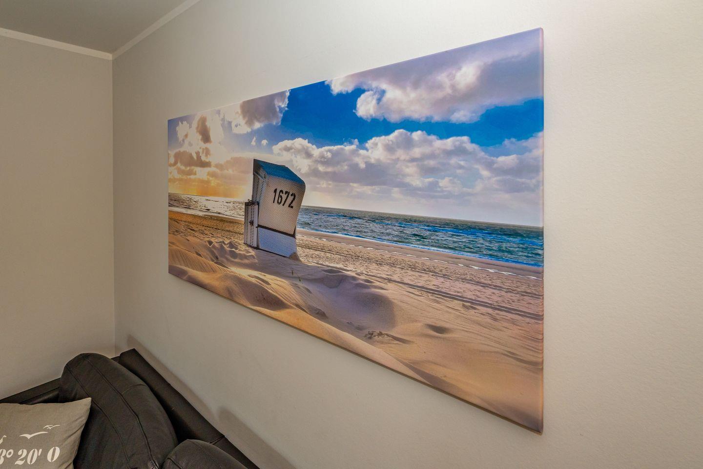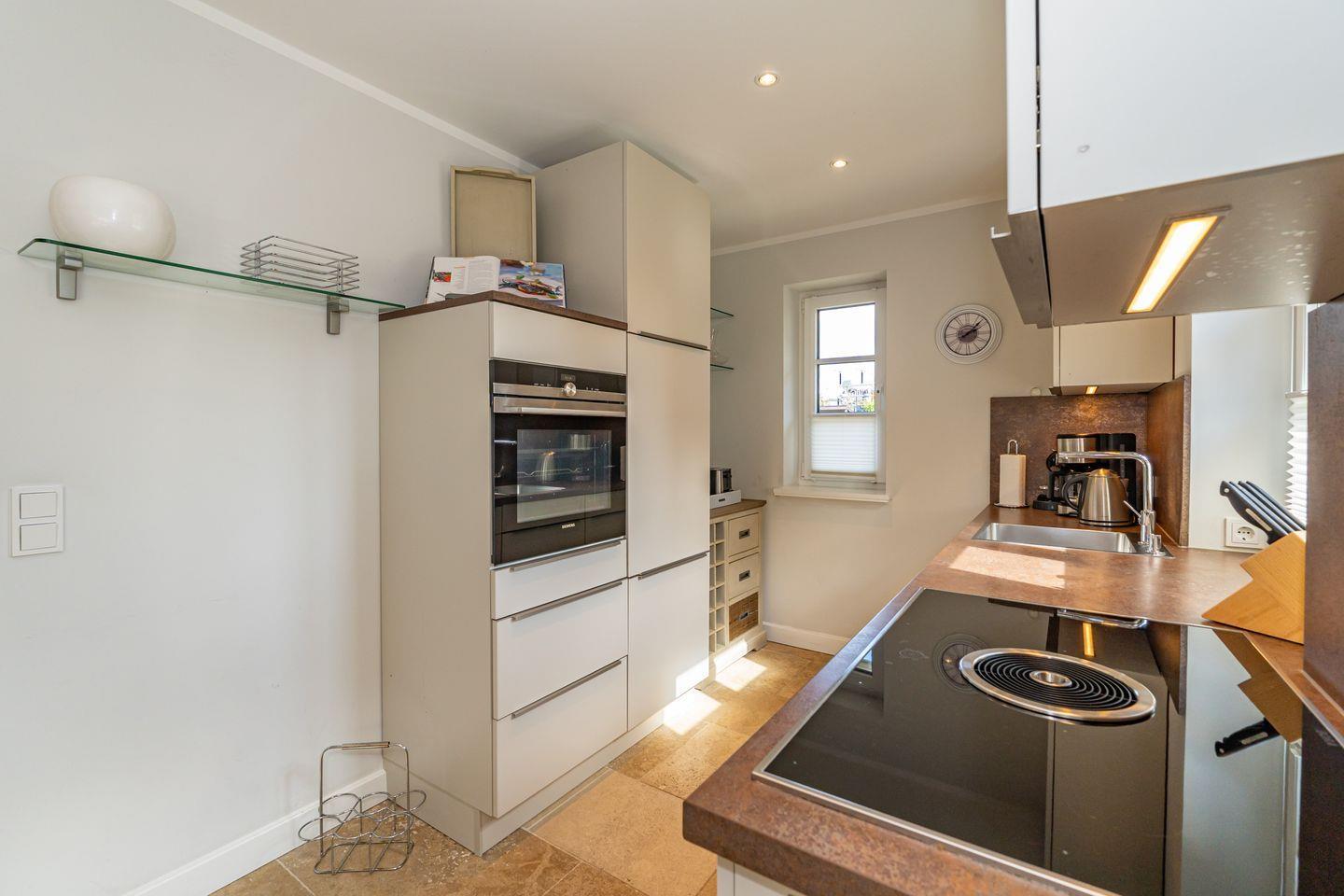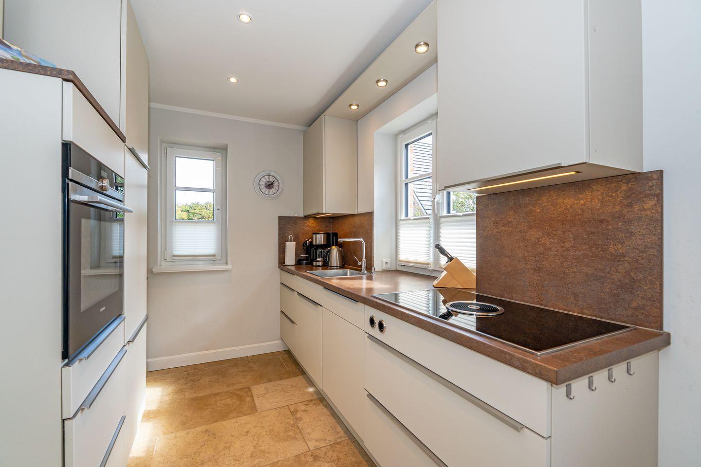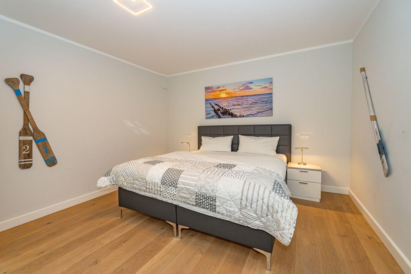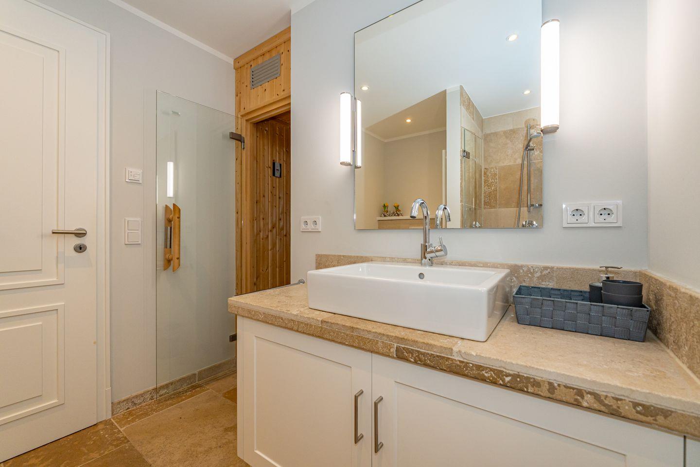 Im Erdgeschoss erwartet Sie ein Flur mit Garderobe. Von hier geht ein Gäste WC ab. Ebenfalls das geräumige und helle Wohn- und Esszimmer. Hier wartet Sie ein kuscheliger Gas Kamin, Sofa, TV und Essplatz. Angrenzend an diesen Bereich ist die offene Küche, hier können Sie köstliche Mahlzeiten zubereiten. Sie ist ausgestattet mit eine, Backofen, Induktionsherd mit Bora Feld, Geschirrspülmaschine, Gefrierschrank und Kaffeefiltermaschine. Vom Wohn- und Essbereich haben Sie Zutritt zum Garten mit Terrasse, Gartenmöbeln und Strandkorb. Über eine Treppe gelangen Sie in das erste OG, hier befindet sich ein Schlafzimmer mit Doppelbett (180x200), ein Badezimmer mit Dusche und Doppelwaschbecken. Als Highlight erwartet Sie auf dieser Ebene ein Kinoraum mit extra großem Smart-TV und gemütlichen Kinosesseln. Über eine weitere Treppe gelangen Sie in den Spitzboden, wo sich ein Schlafzimmer mit zwei Einzelbetten (je 90x200) und ein Gäste WC befinden. Im Souterrain des Hauses ist ein weiteres Schlafzimmer mit Doppelbett (180x200) und ein Badezimmer mit Dusche und Sauna. Zum Ferienhaus gehört ein PKW Stellplatz.