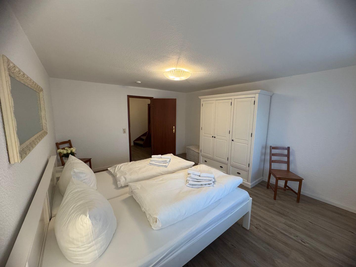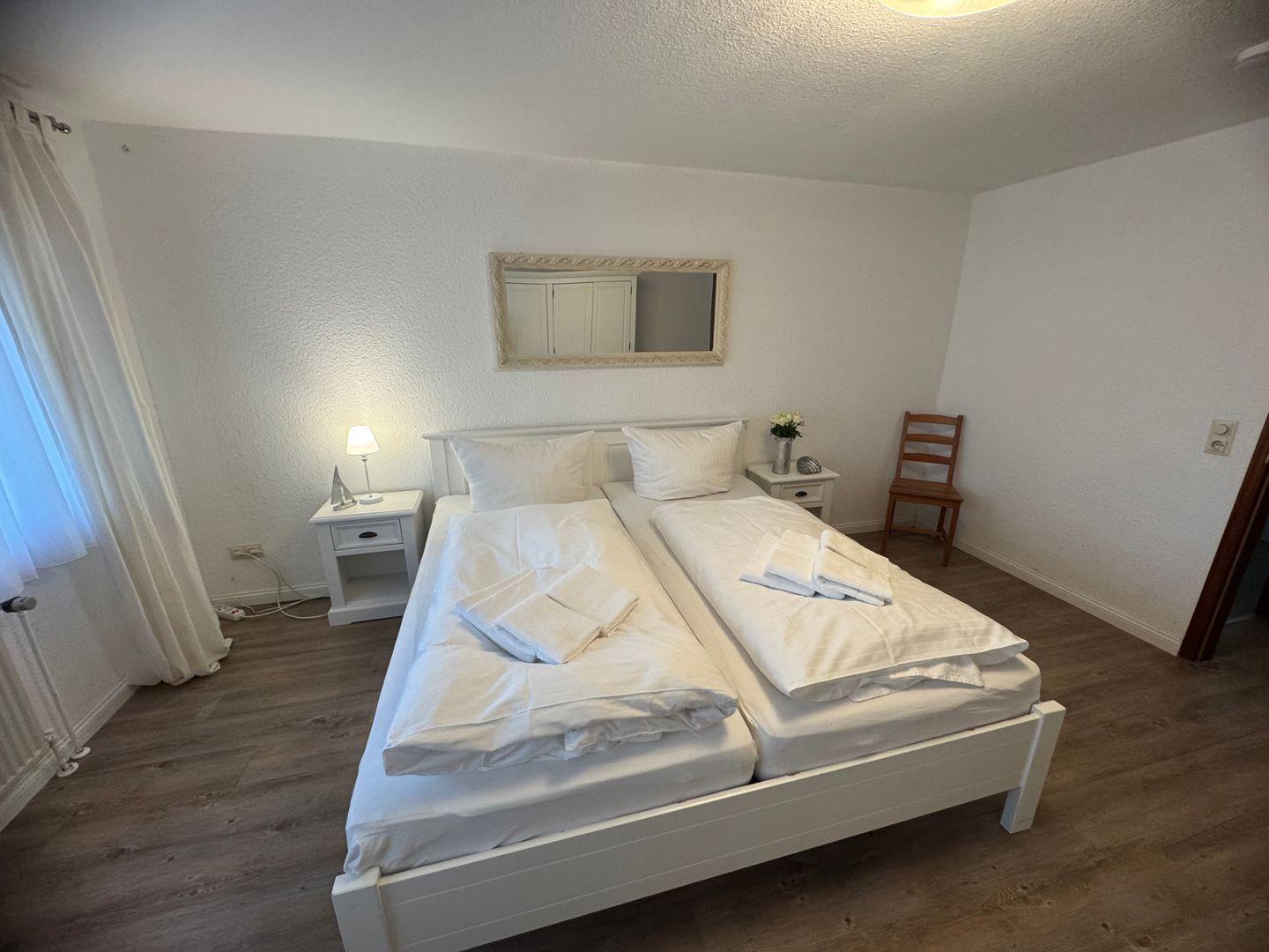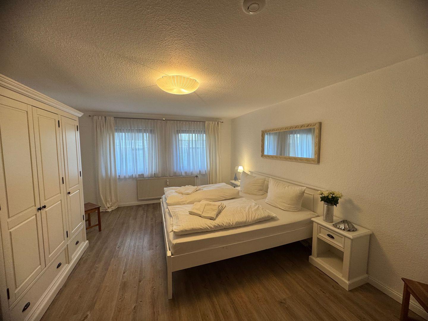 Die Ferienwohnung liegt im Hochparterre und überzeugt durch ihr helles und einladendes Ambiente. Der Laminatboden im Wohnzimmer sowie im Schlafzimmer sorgt für eine angenehme Raumakustik und ist pflegeleicht. Das Wohnzimmer ist mit einer komfortablen Sitzecke ausgestattet, die perfekt ist, um entspannte Abende mit einem guten Buch oder einem gemeinsamen Filmabend zu verbringen. Selbstverständlich steht Ihnen auch ein Fernseher zur Verfügung, um Ihren Aufenthalt zusätzlich zu bereichern.