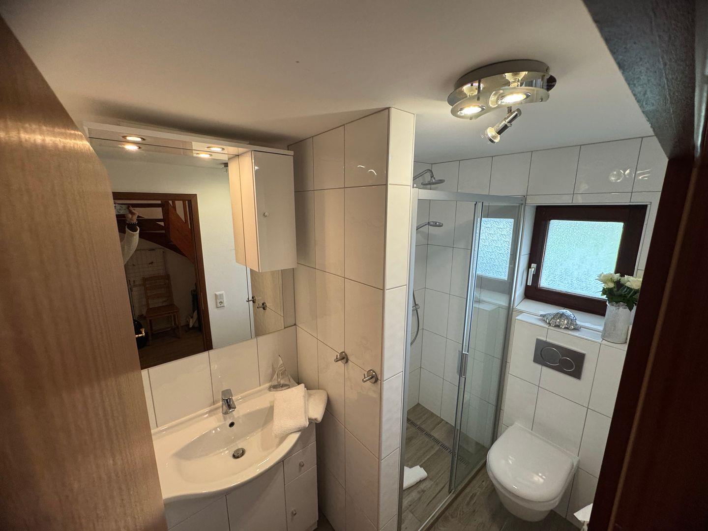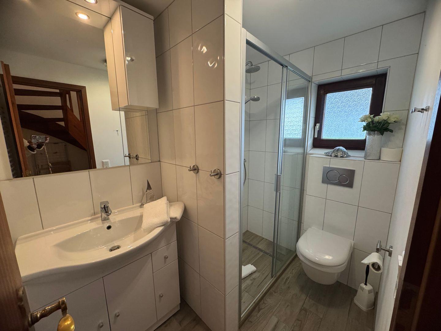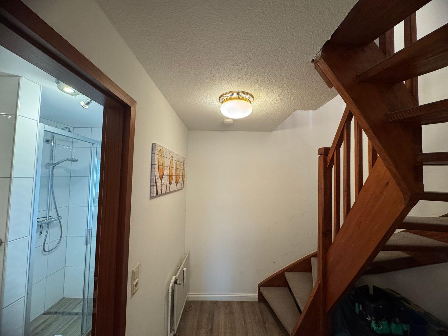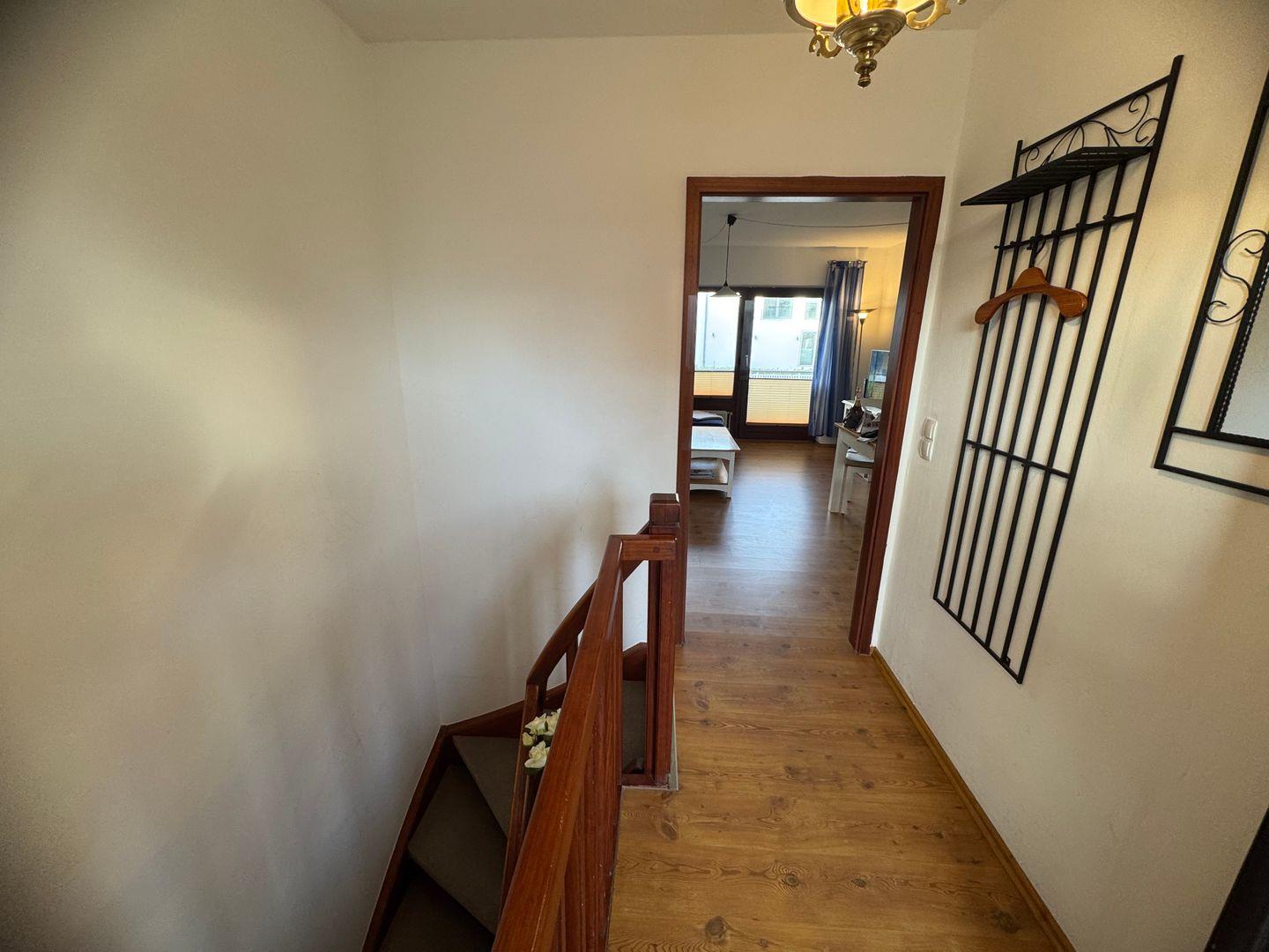 Die Ferienwohnung liegt im Hochparterre und überzeugt durch ihr helles und einladendes Ambiente. Der Laminatboden im Wohnzimmer sowie im Schlafzimmer sorgt für eine angenehme Raumakustik und ist pflegeleicht. Das Wohnzimmer ist mit einer komfortablen Sitzecke ausgestattet, die perfekt ist, um entspannte Abende mit einem guten Buch oder einem gemeinsamen Filmabend zu verbringen. Selbstverständlich steht Ihnen auch ein Fernseher zur Verfügung, um Ihren Aufenthalt zusätzlich zu bereichern.
