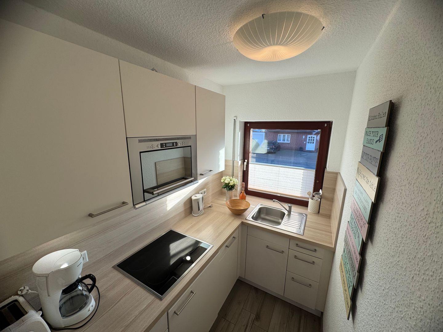 Die voll ausgestattete Küche lädt dazu ein, Ihre Lieblingessensrezepte zuzubereiten. Hier finden Sie alles, was Sie benötigen, einschließlich eines modernen Ceran-Kochfeldes, einer Mikrowelle und einer gemütlichen Essecke, wo Sie die zubereiteten Speisen genießen können. Der Balkon bietet zusätzlich die Möglichkeit, das Frühstück an der frischen Luft zu genießen, während Sie den Blick in die Umgebung schweifen lassen.