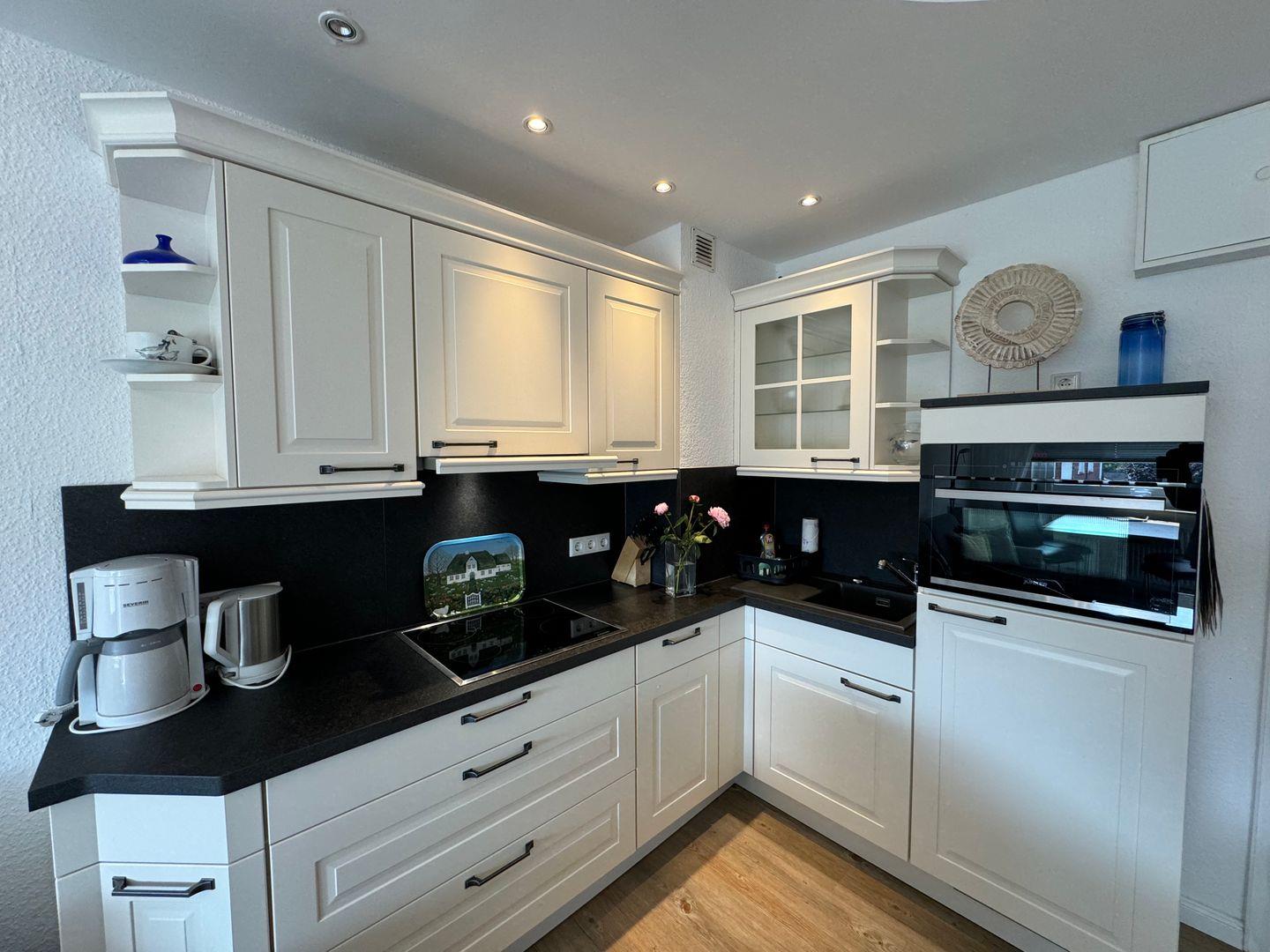 Die voll ausgestattete Küche lässt keine Wünsche offen: Von einem Ceranherd, über einen Backofen bis hin zu Kühlschrank und Geschirrspüler ist alles vorhanden, um Ihre kulinarischen Ideen zu verwirklichen. Genießen Sie Ihre Mahlzeiten gemütlich am Esstisch oder auf dem Balkon bei frischer Sylter Luft.