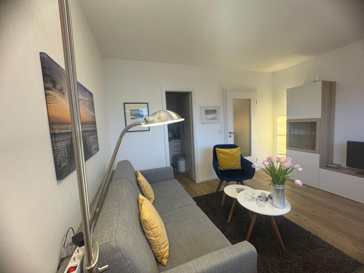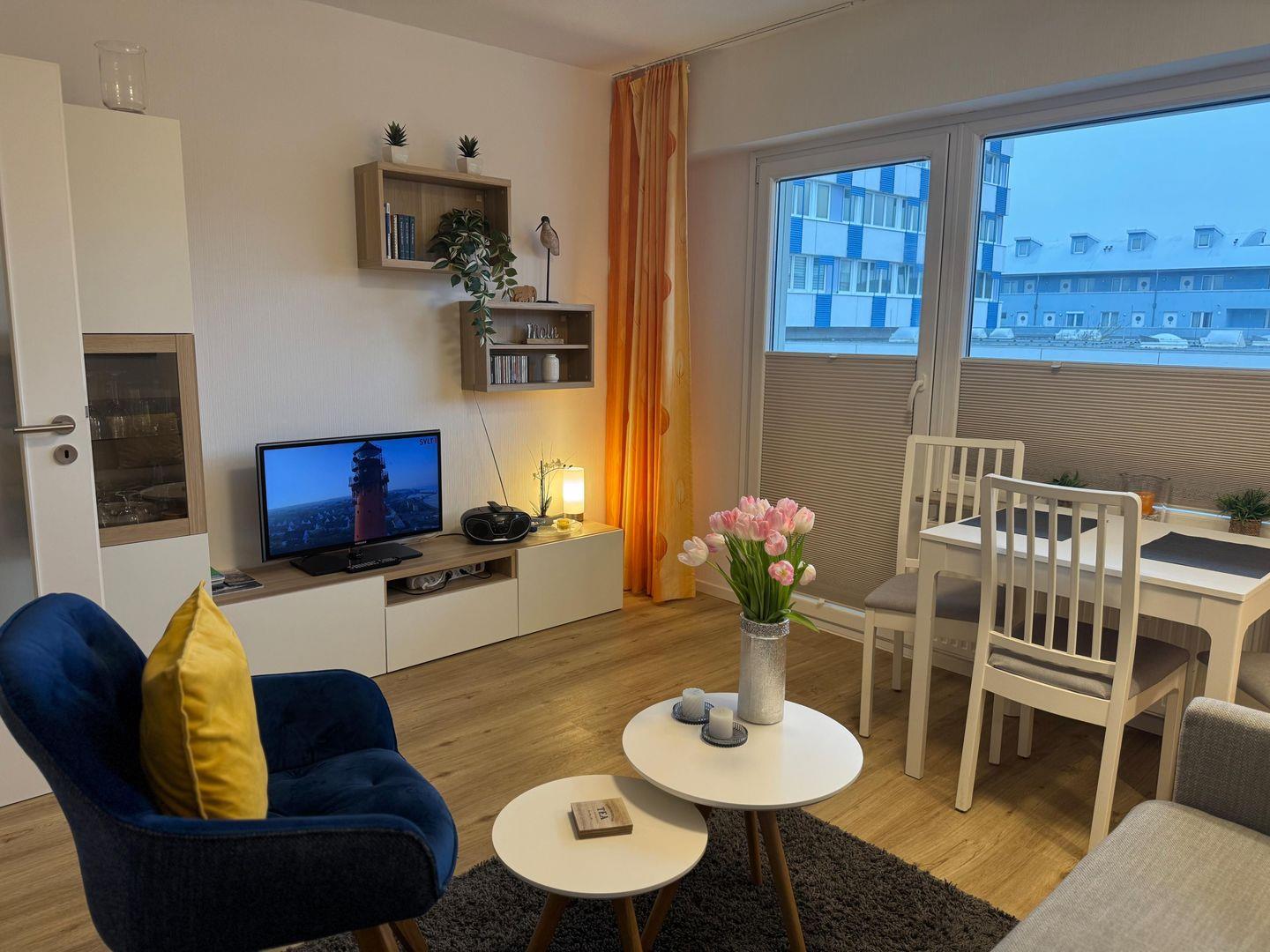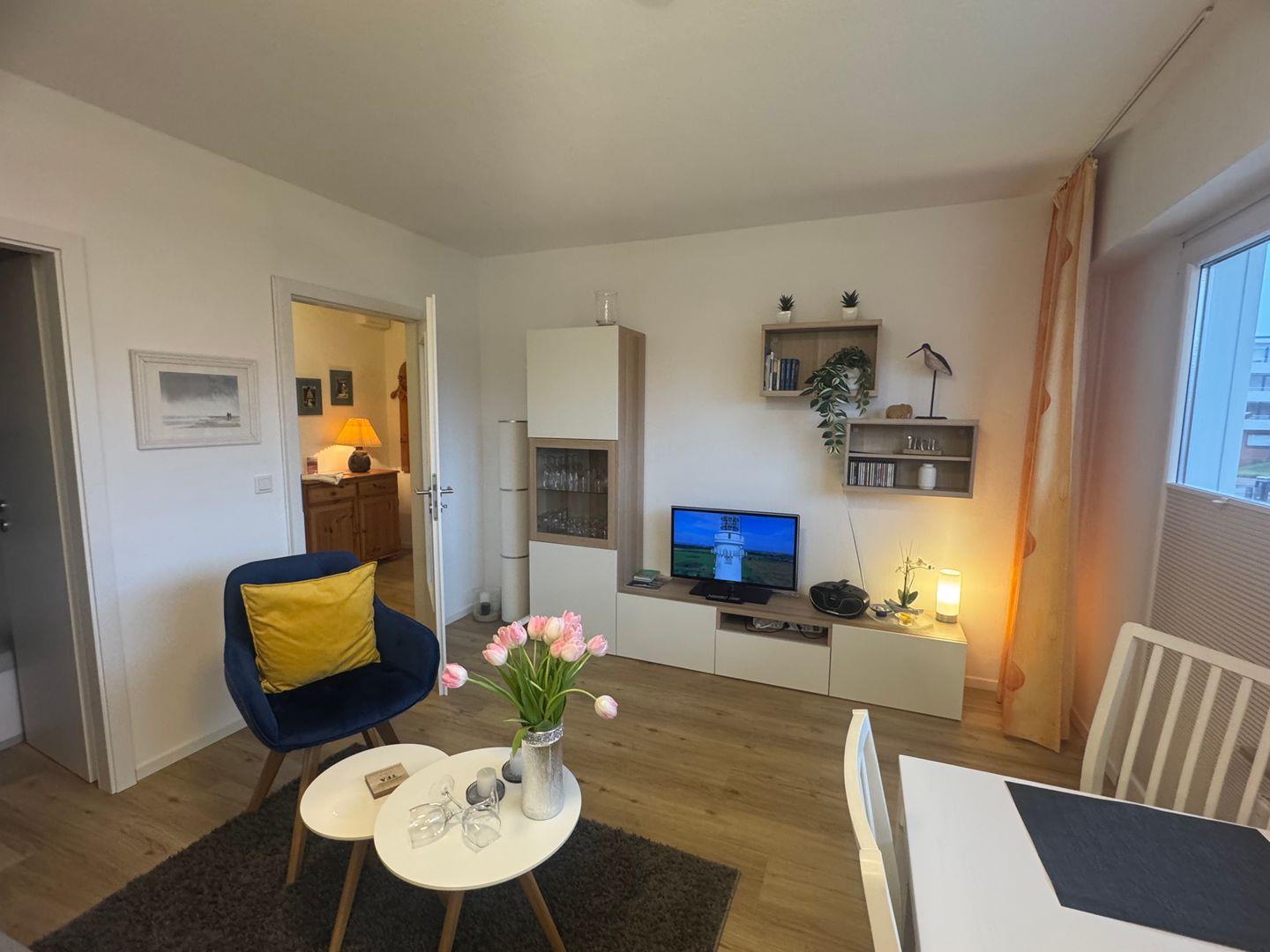 Das lichtdurchflutete Wohnzimmer von App. 22 im Haus Nordland empfängt Sie mit einer modernen und gemütlichen Einrichtung. Große Fenster sorgen für helle, freundliche Atmosphäre und laden zum Entspannen nach einem Strandtag ein.