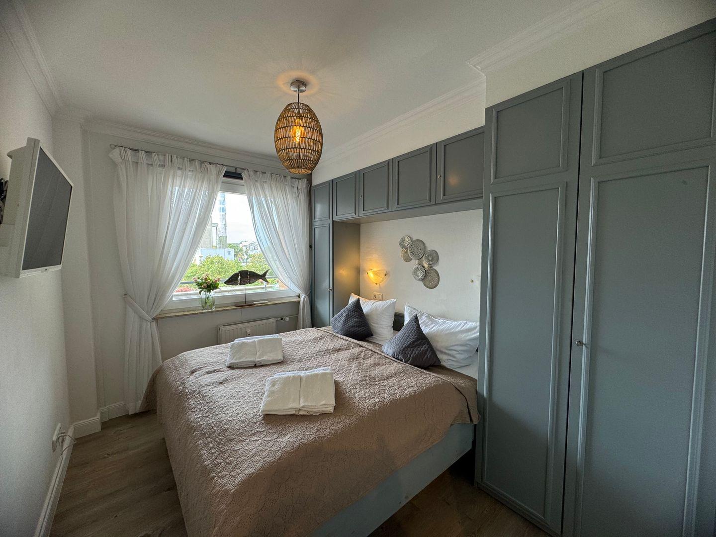 Die Wohnung verfügt über ein komfortables Schlafzimmer, das mit einem Vinylboden ausgestattet ist und einen ruhigen Rückzugsort nach einem erlebnisreichen Tag an der frischen Meeresluft bietet. Zudem finden Sie im gemütlichen Wohnzimmer eine einladendes Sofa sowie einen Esstisch, an dem Sie gemeinsame Mahlzeiten genießen können. Der Fernseher mit Kabelanschluss sorgt für Unterhaltung am Abend – sei es beim Kuscheln oder beim Planen des nächsten Ausflugs.