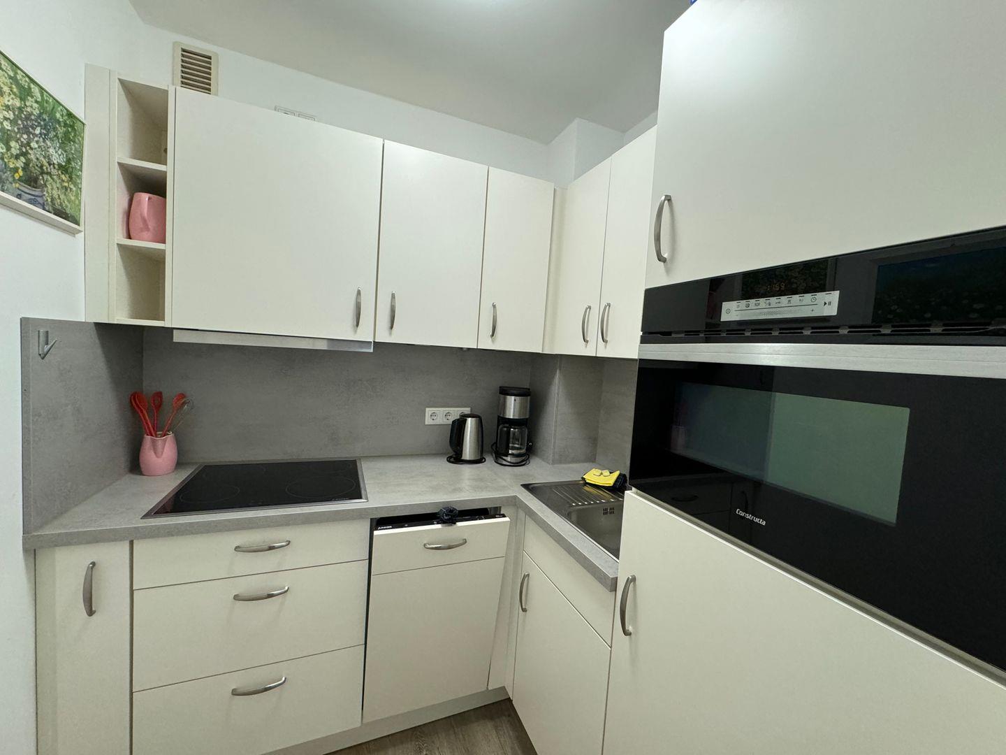 Eine moderne, voll ausgestattete Küche steht Ihnen zur Verfügung, die mit hochwertigen Geräten wie einem Cerankochfeld, Backofen, Kühlschrank, Gefrierfach, Geschirrspüler sowie Kaffee- und Wasserkocher ausgestattet ist. So können Sie Ihre Lieblingsgerichte einfach zubereiten und den Tag mit einem köstlichen Frühstück auf dem Balkon beginnen. Genießen Sie dabei die frische Meeresluft und die Aussicht auf die Umgebung.