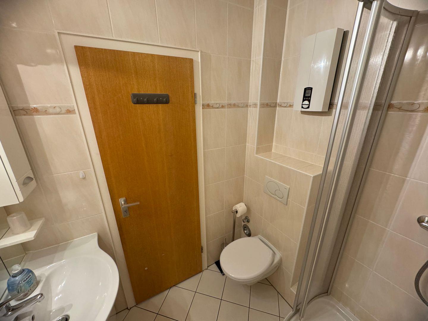 Das Badezimmer ist modern gestaltet und bietet eine Dusche und WC.