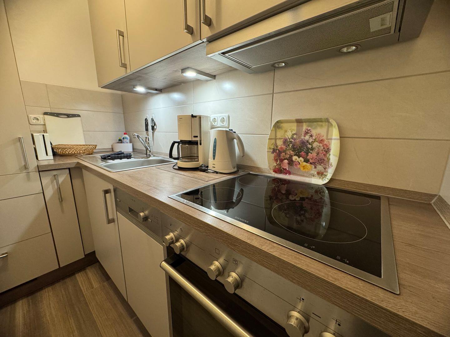Die vollständig ausgestattete Küche lädt dazu ein, kulinarische Köstlichkeiten zu kreieren. Hier können Sie Ihre Lieblingsgerichte zubereiten und Ihr Frühstück oder Abendessen in Ruhe genießen. Der angrenzende Balkon bietet Ihnen einen wunderbaren Rückzugsort, um an der frischen Luft zu entspannen und den Blick auf die Umgebung zu genießen. Verbringen Sie angenehme Stunden im Freien und lassen Sie den Tag bei einem Glas Wein ausklingen.