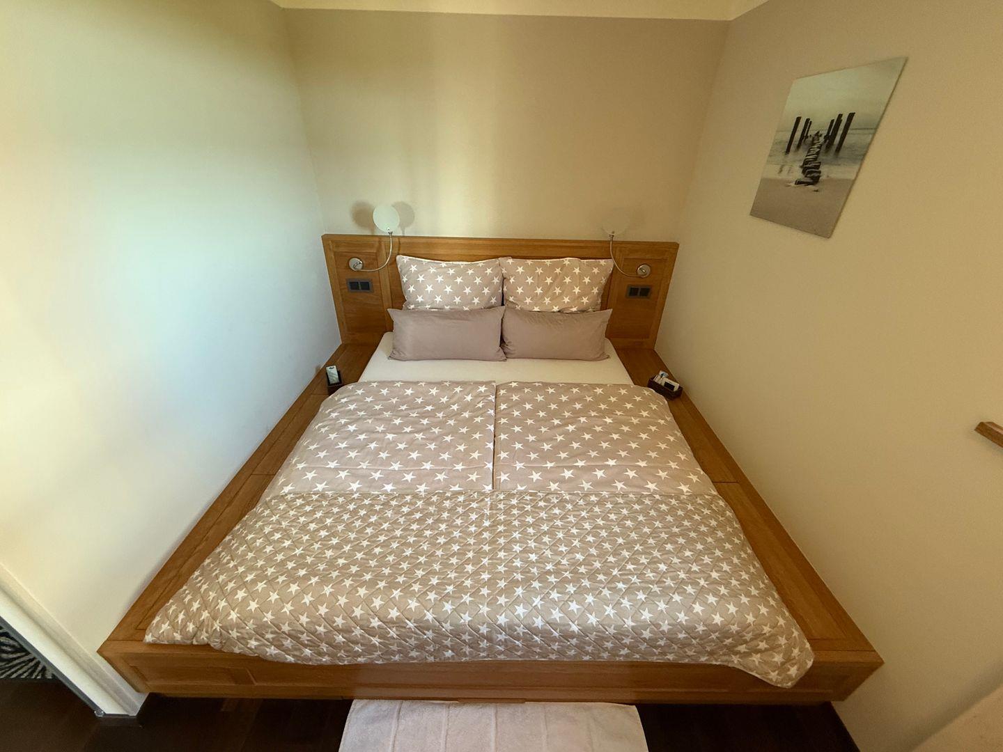 Das Schlafzimmer ist eine Oase der Ruhe mit einem komfortablen eingebautem Doppelbett (1.60 X 2.00) mit einer Tempur-Matratze.