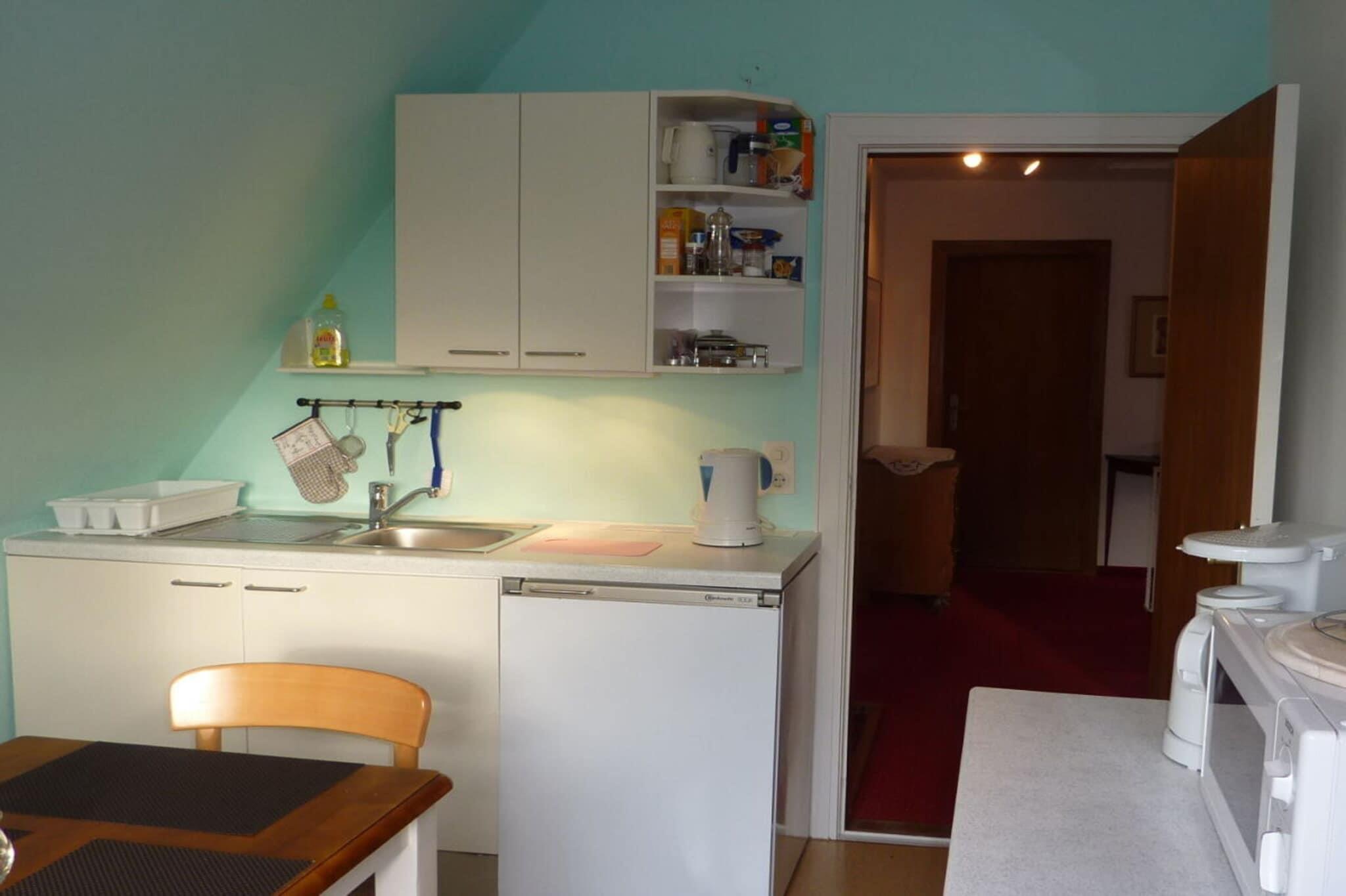 Die 3-Zimmer-Ferienwohnung liegt im Obergeschoss mit einem separat genutzten Hauseingang; getrennt durch eine zur Privatwohnung gehörenden Wohnungstür im Erdgeschoss. Der Haupteingang der Erdgeschosswohnung ist die Gartenseite. Ihre Ferienwohnung verfügt über ein großzügiges und helles Wannen-Duschbad/WC (Fön), 2 Schlafzimmer (Nordseite) mit je 1 Bett und je 2 Betten, sowie mit Sitzgelegenheit, einer Wohnküche (Südseite) und einem Wohnzimmer (Südseite). W-LAN. Die Wohnküche ist ausgestattet u.a. mit 2 Kochplatten, einer Mikrowelle, Kaffeemaschine, Wasserkocher und Kühlschrank. In dem Wohnzimmer finden Sie einen gemütlichen Cassina-Liege-Sessel, 3klassische und bequeme Ledersessel, einen Sekretär, Sat-Flachbildschirm TV u. Radio.