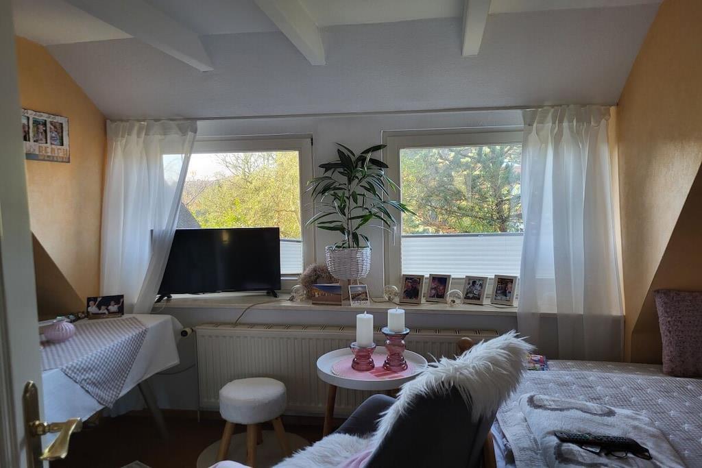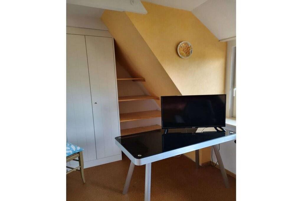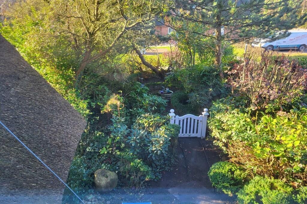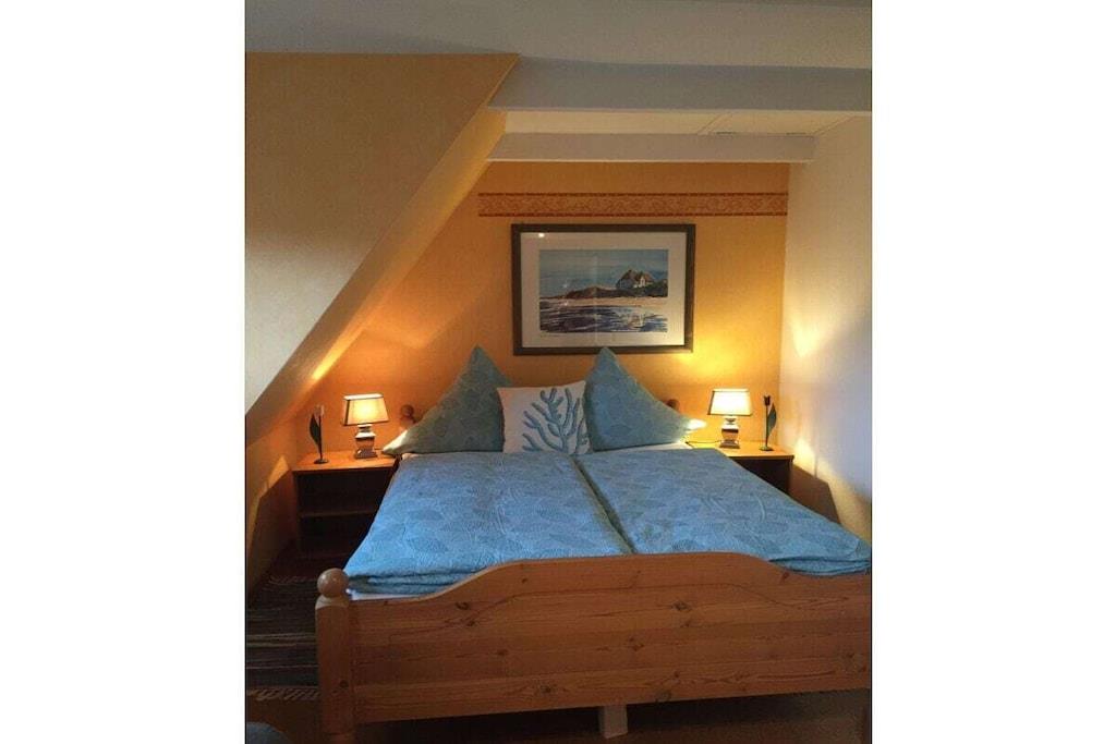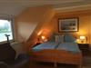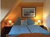 Dobbeltværelset ligger på øverste etage i den stråtækte ferielejlighed Tina. Det store, lyse værelse er indrettet med garderobe, dobbeltseng, lille bord, tekøkken og TV. Et stort lyst badeværelse ligger lige ved siden af værelset. Du når overetagen med separat adgang via en stor... En parkeringsplads er placeret lige udenfor hoveddøren. Ideelt beliggende, stille og alligevel meget centralt, med alle supermarkeder inden for gåafstand. Store enge er i umiddelbar nærhed. Adskillige hundevenlige strande ligger kun 5 minutter væk i bil.