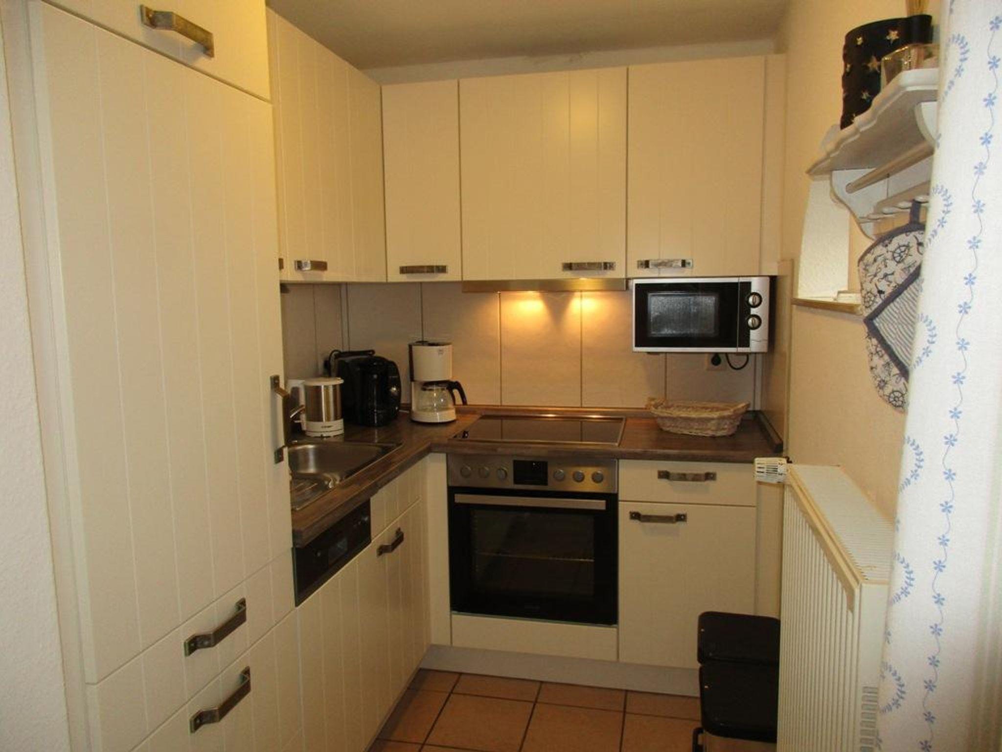 Eine komplett ausgestattete moderne Landhausküche inspiriert Sie zum Kochen. Die Küche ist zum Wohnraum offen, liegt aber in einer Nische.