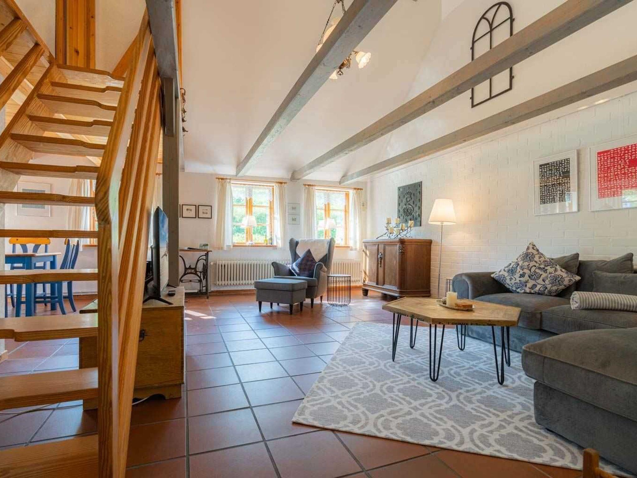 Wohnzimmer mit gemütlicher Wohnlandschaft, bequemem Ohrensessel und SMART-TV (Sat). Die offene Küche bietet mit Backofen, Geschirrspüler, Kühlschrank mit Gefrierfach und Nespresso Kapsel-Kaffeemaschine jeglichen Komfort. Vor der Küche befindet sich der Essbereich mit großem Esstisch.