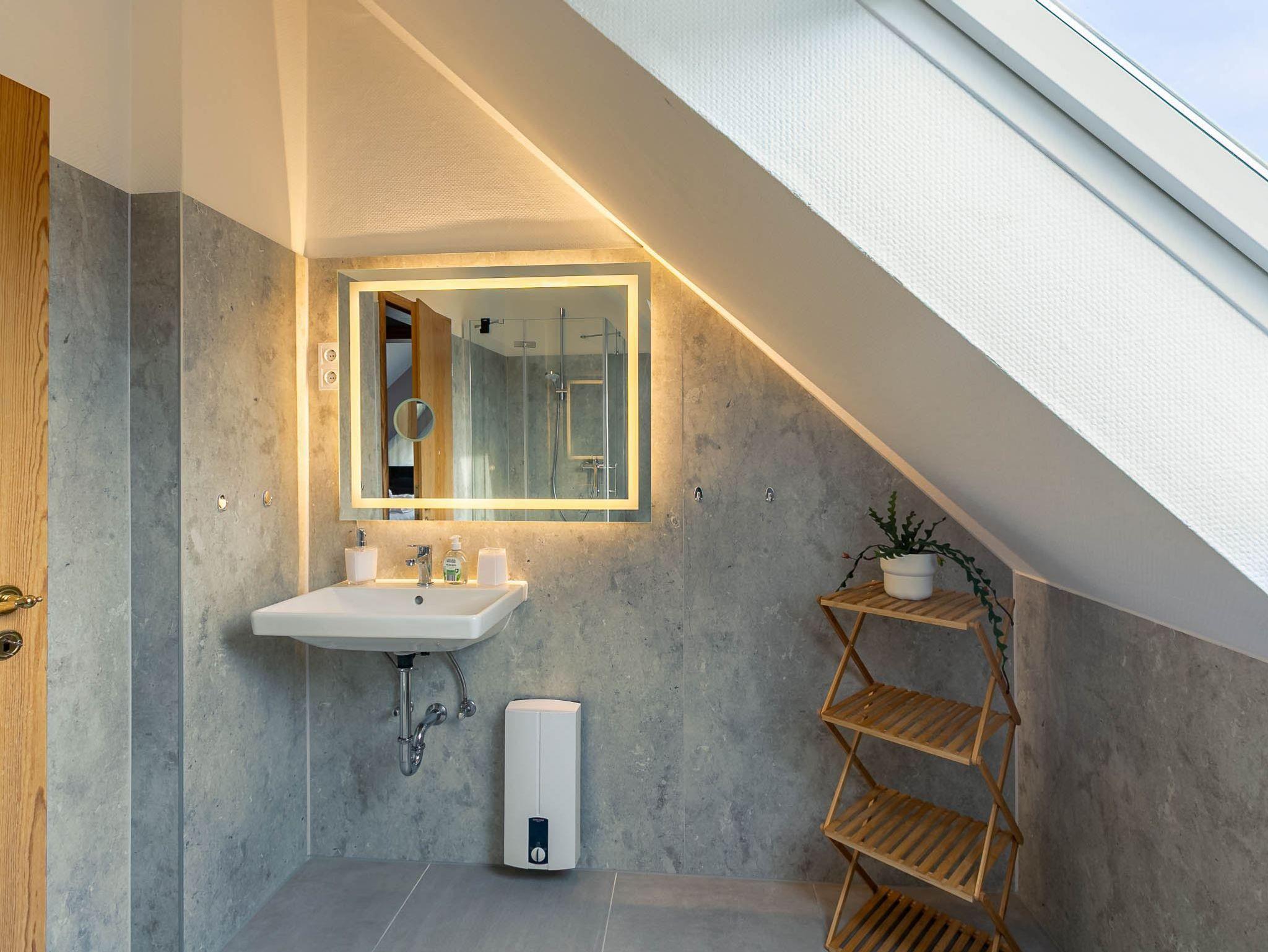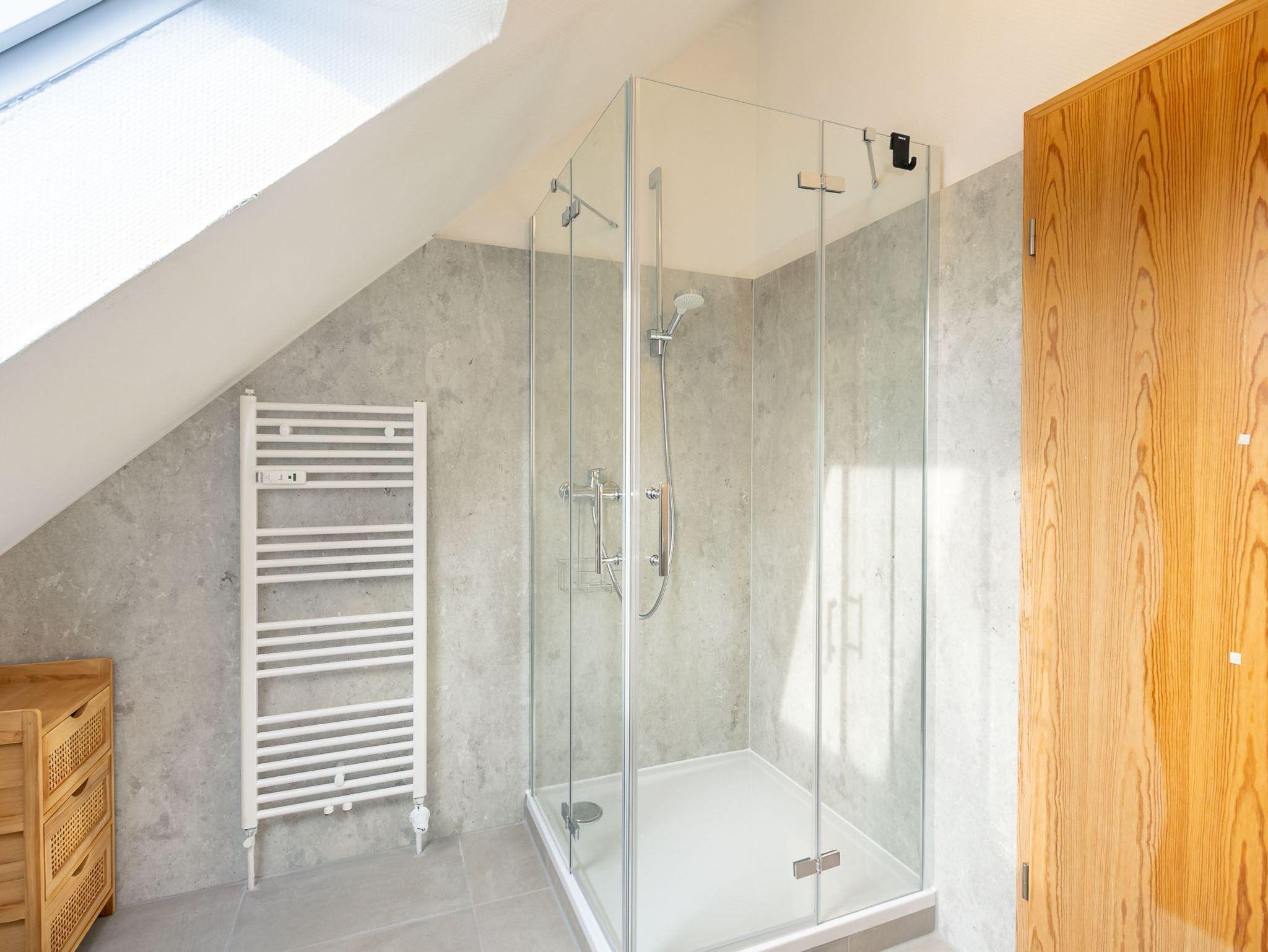 Badezimmer (Duschbad) mit Dusche (90x90cm), WC, Handtuchwärmer und Tageslicht.