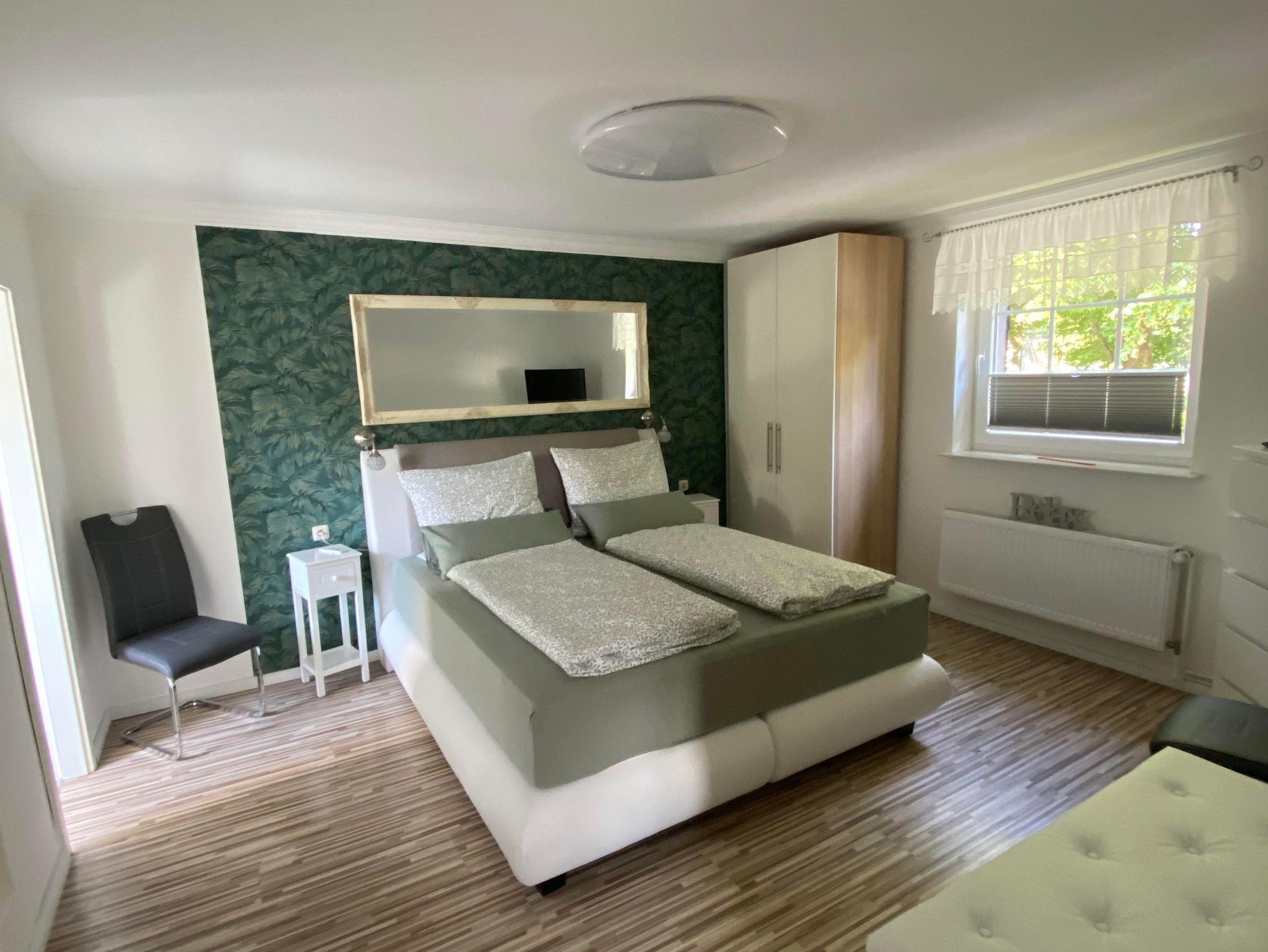 Das Elternschlafzimmer ist ausgestattet mit einem Boxspringbett, einem Kleiderschrank und einem Flachbildschirm-TV.