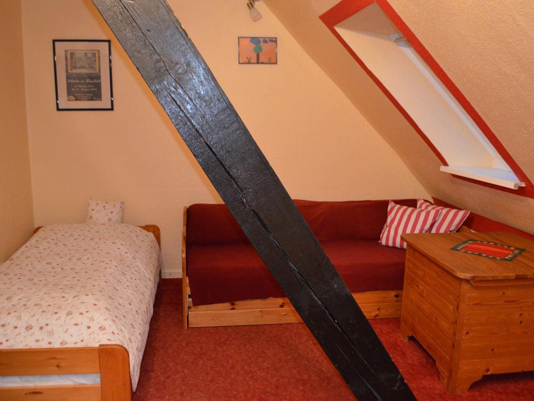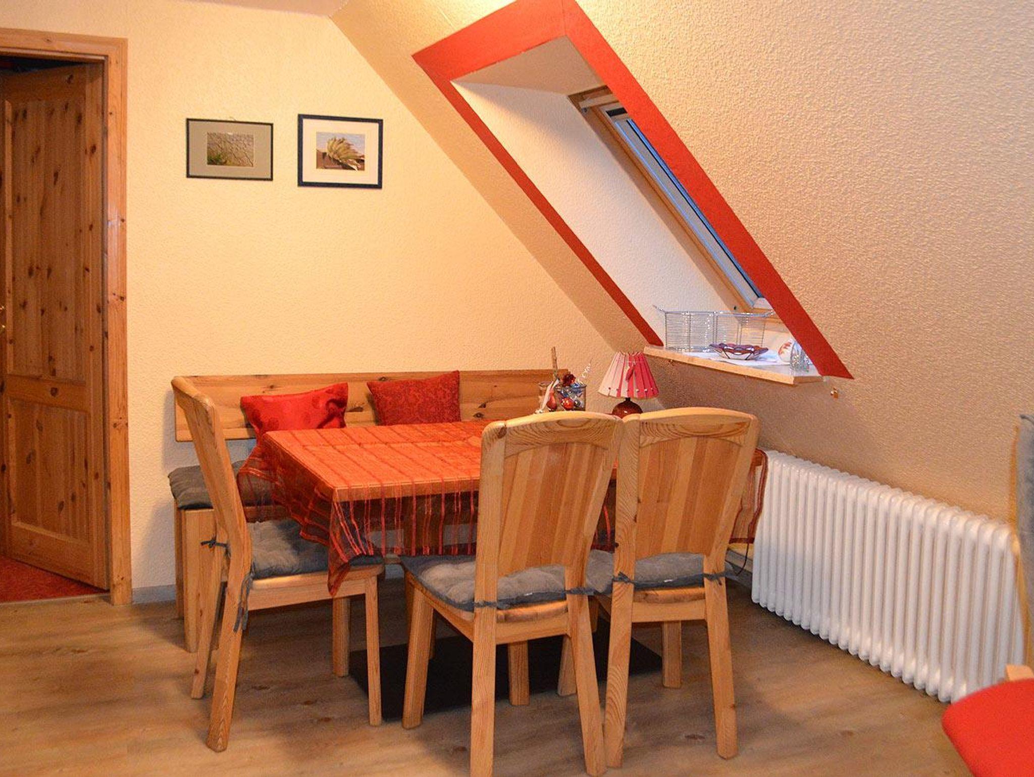 Die behagliche Ferienwohnung hat einen Wohn/Essraum, eine kleine Küche, 1 Elternschlafzimmer mit Doppelbett, Dusche/WC. 1 Kinderzimmer mit 2 Betten. Farb-TV und Stereoanlage vorhanden. Auf Wunsch auch Bettzeug für Allergiker Waschmaschine und Trockner für alle Gäste im Haus (gegen Gebühr).