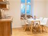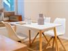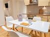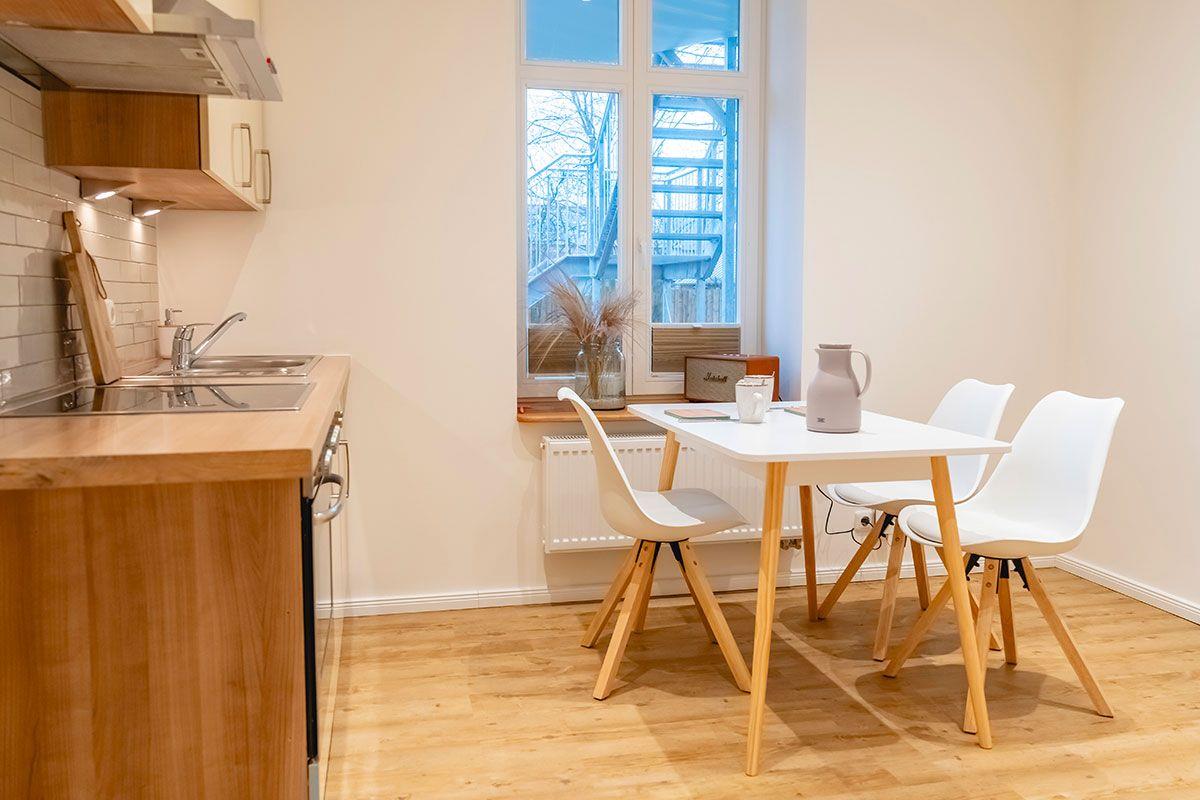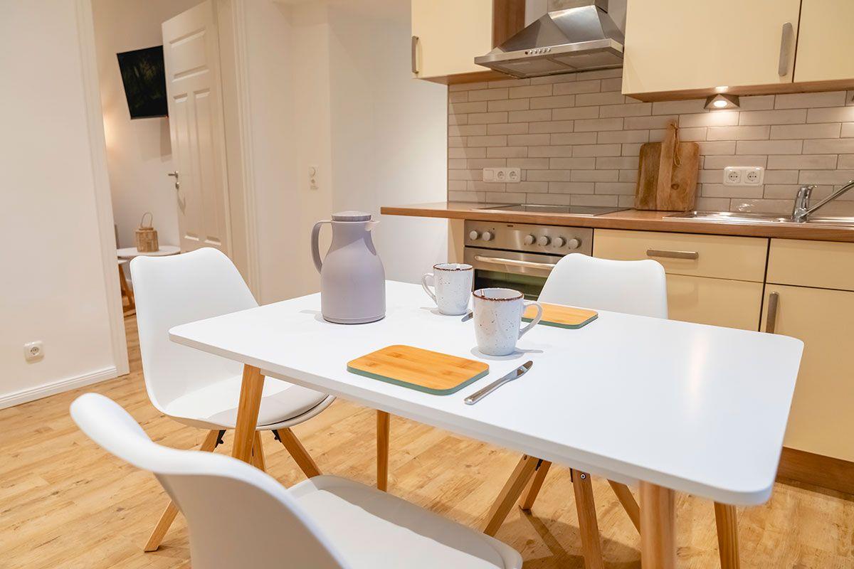 Esstisch mit 4 Stühlen, voll ausgestattete Küche mit Herd und Backofen, Spülmaschine, Kühlschrank, Töpfen, Pfannen, Geschirr, Besteck, Bechern, Gläsern, Kaffeemaschine, Wasserkocher und Toaster. Das Badezimmer hat Waschbecken, WC, Dusche sowie Haartrockner.