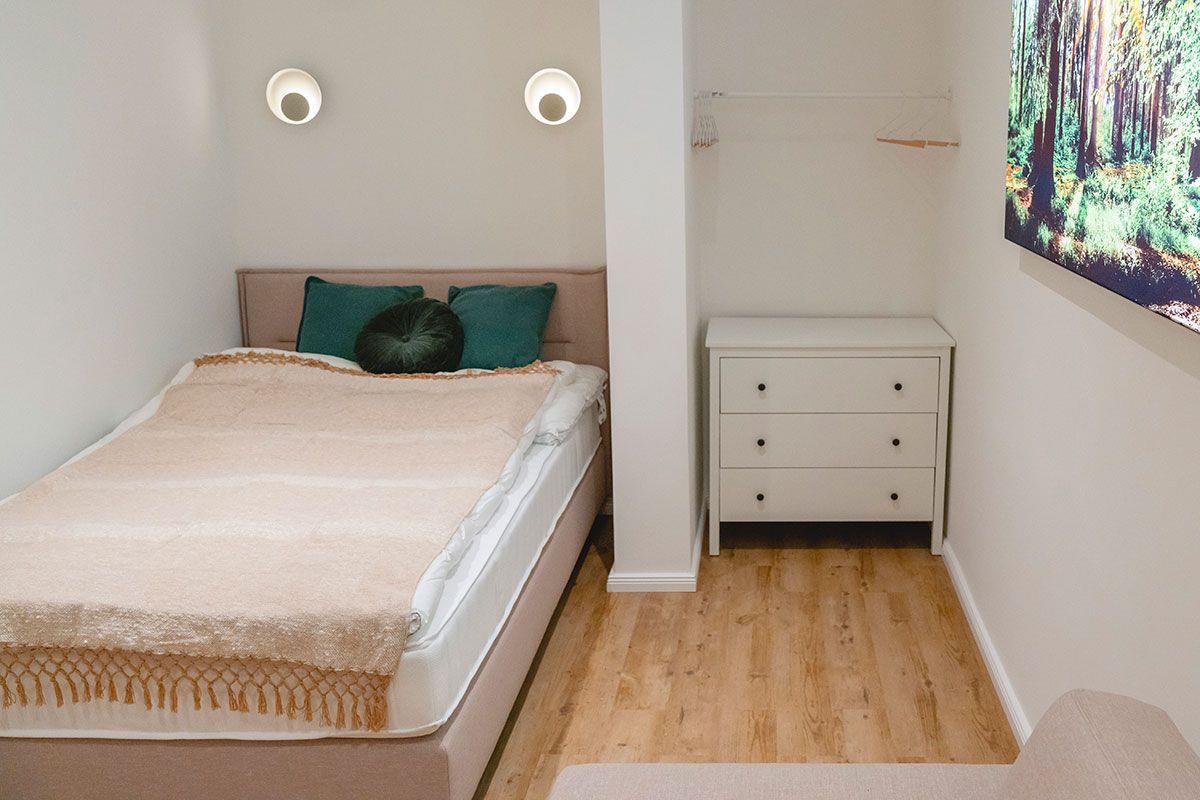 Die Ferienwohnung „Timsen“ ist mit 29 m² für 1-2 Personen ausgelegt. Zur Verfügung stehen ein kuscheliges Doppelbett (1,80 x 2 Meter) im Wohn- und Schlafzimmer und ein separater Ess- und Küchenbereich im Erdgeschoss.