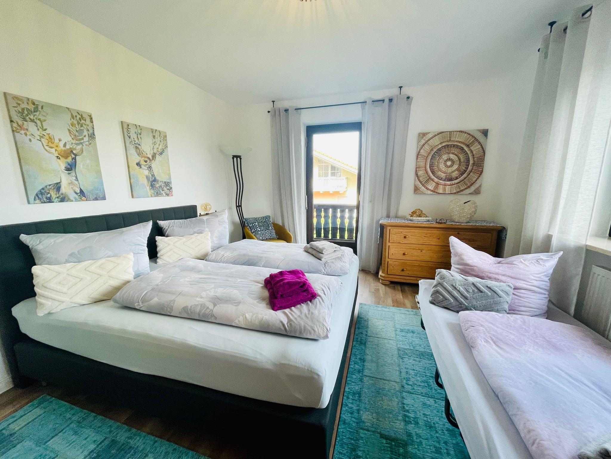 Unsere 2 liebevoll eingerichteten 3-Zi-FeWo mit 118 m² / 88 m² Wohnfläche bieten Platz für 5 Personen und liegen nur 350 m fußläufig und ohne Straßenüberquerung vom Tachinger See und dem idyllischen Strandbad Taching – am verbundenen Waginger See - entfernt. Der ideale Ausgangspunkt – ob erholsam, sportlich, geschäftlich oder einfach zum Seele baumeln lassen.