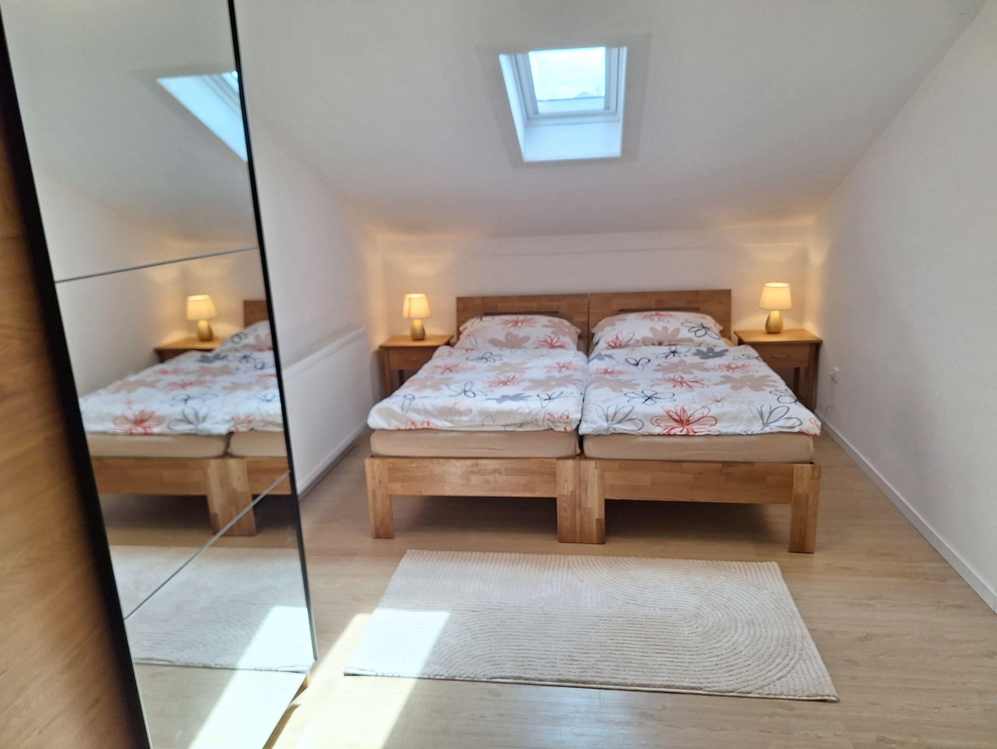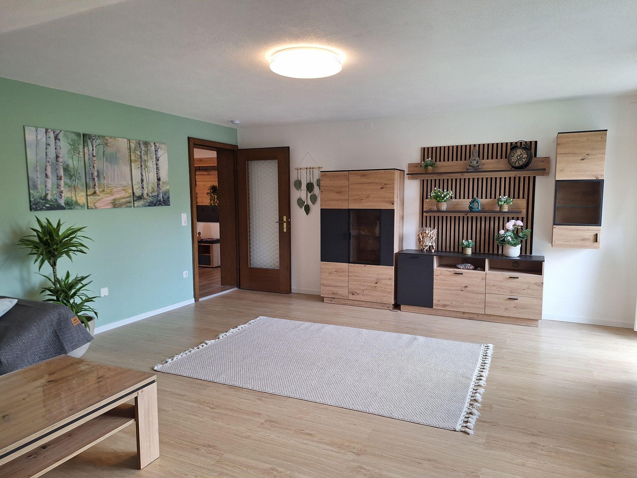 Große, sonnige Ferienwohnung mit neuer Einrichtung, 2 Schlafzimmer, 1 Wohnzimmer, 1 Küche, 1 Vorzimmer mit Garderobe, Ganzkörperspiegel und Schuhregal, 1 Bad, 1 Abstellraum mit Regal.