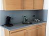 Kühlschrank, Kaffemaschine mit Pads, Toaster und Wasserkocher.
