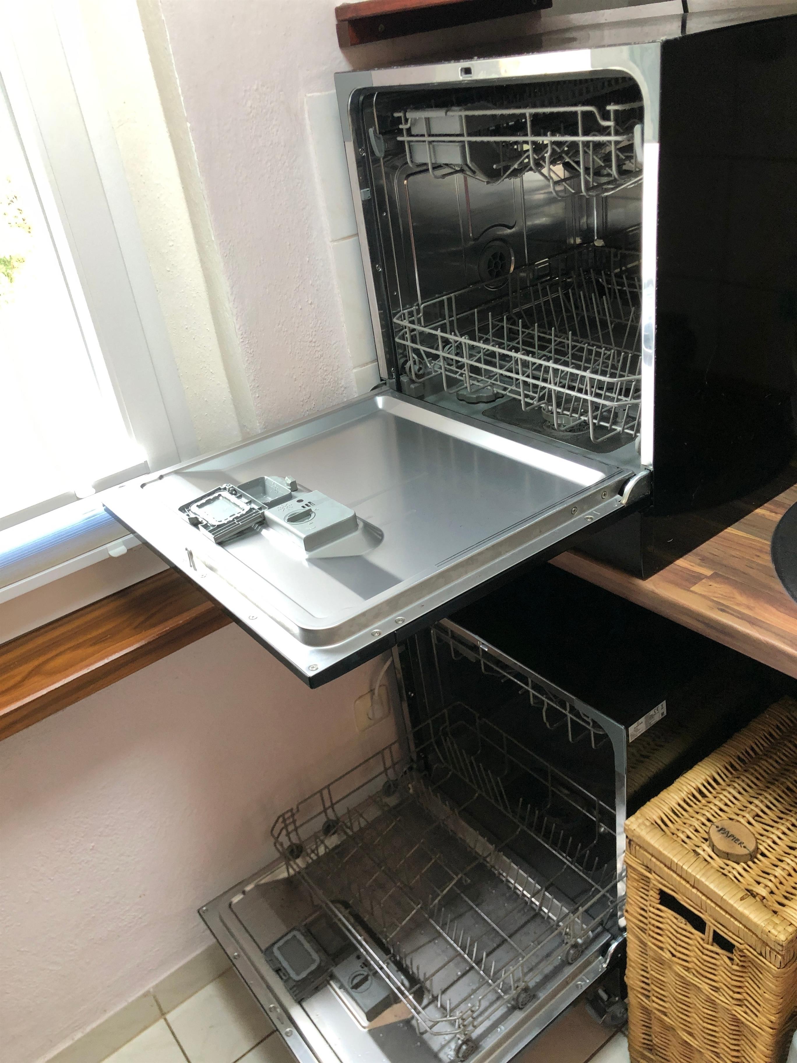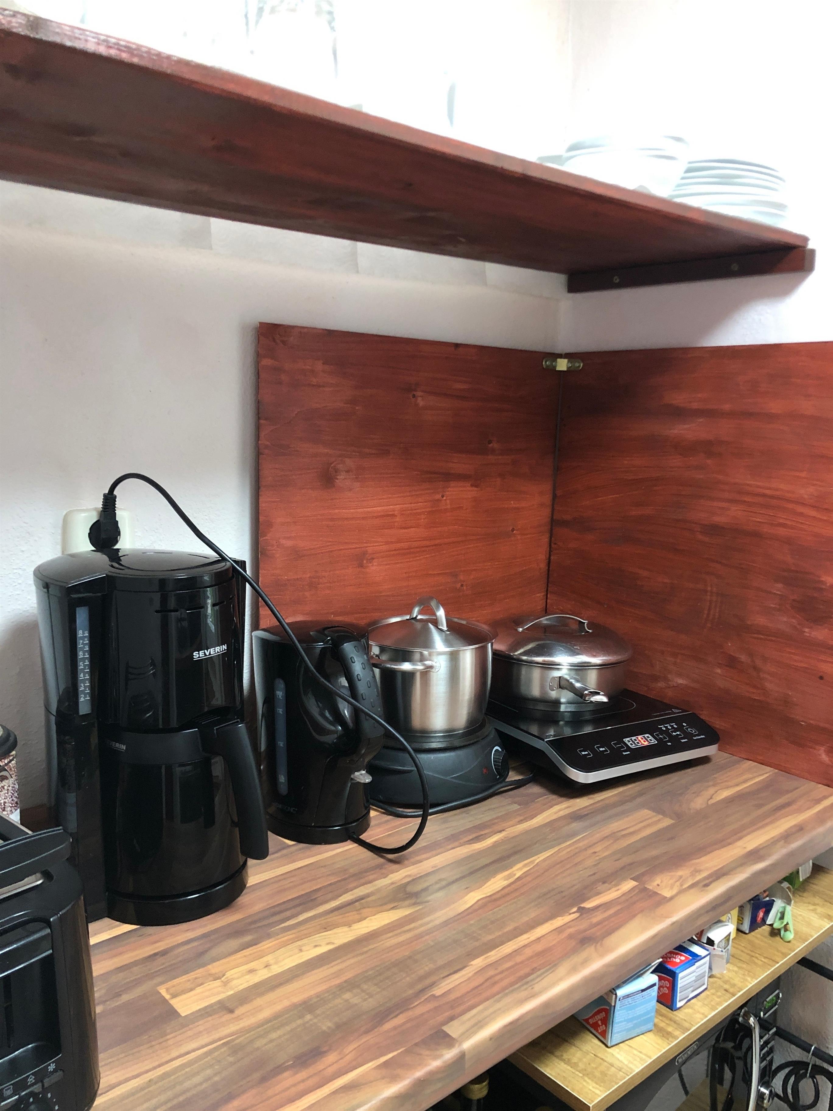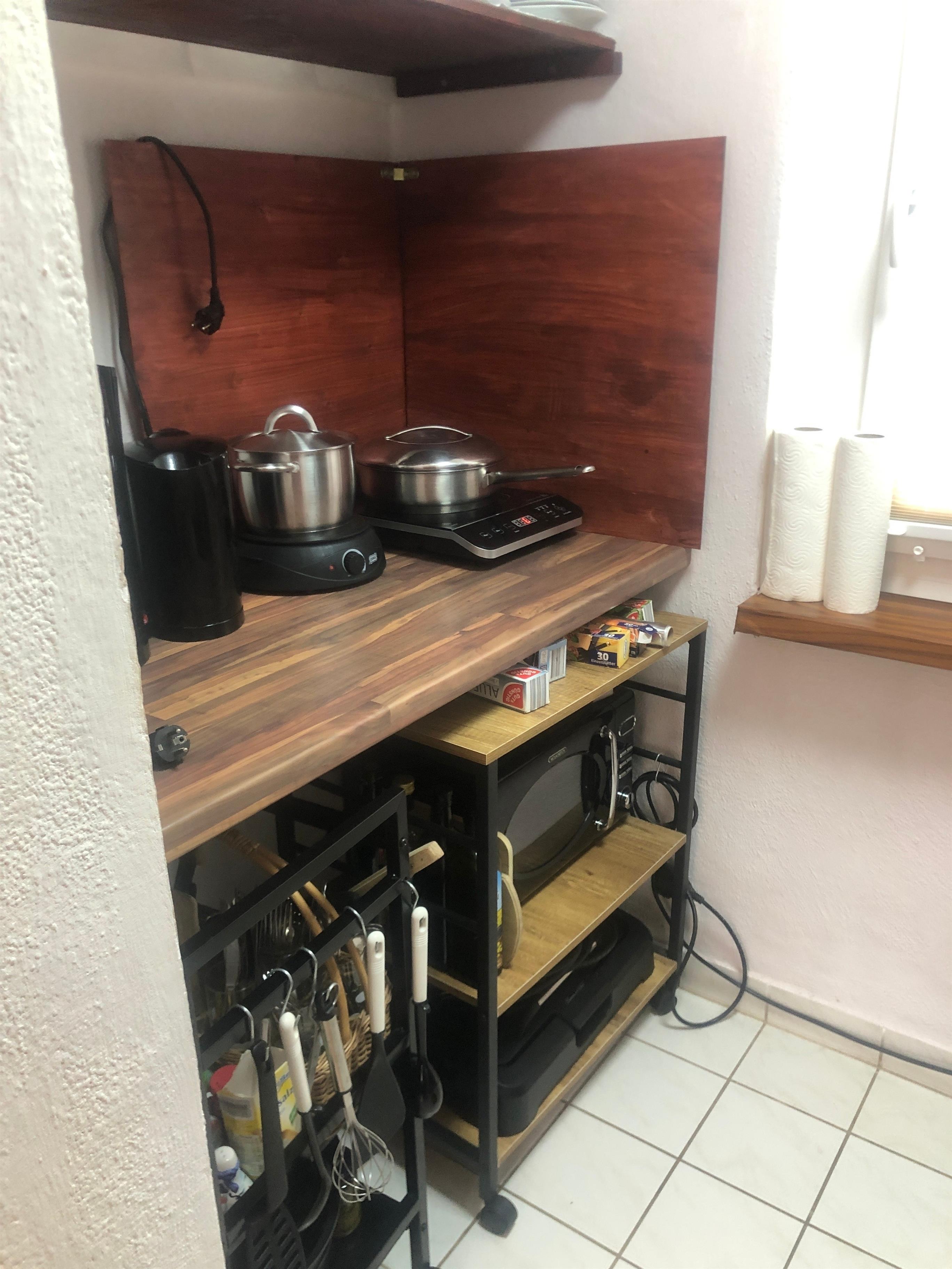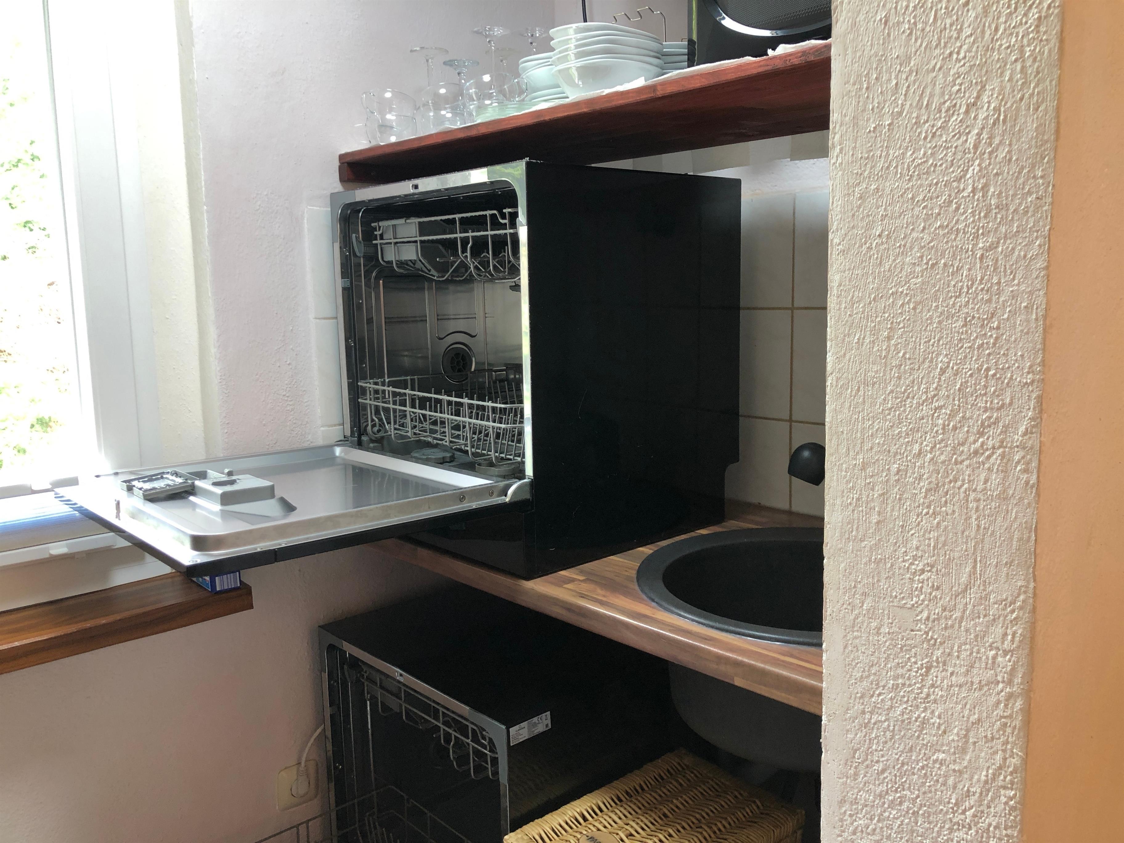 1 Geschirrspülmaschine, Kühl-Gefrierkombination, 1 Herdplatte sowie Waschmaschine und Trockner sorgen für bequemen Komfort, auch bei längerem Aufenthalt.