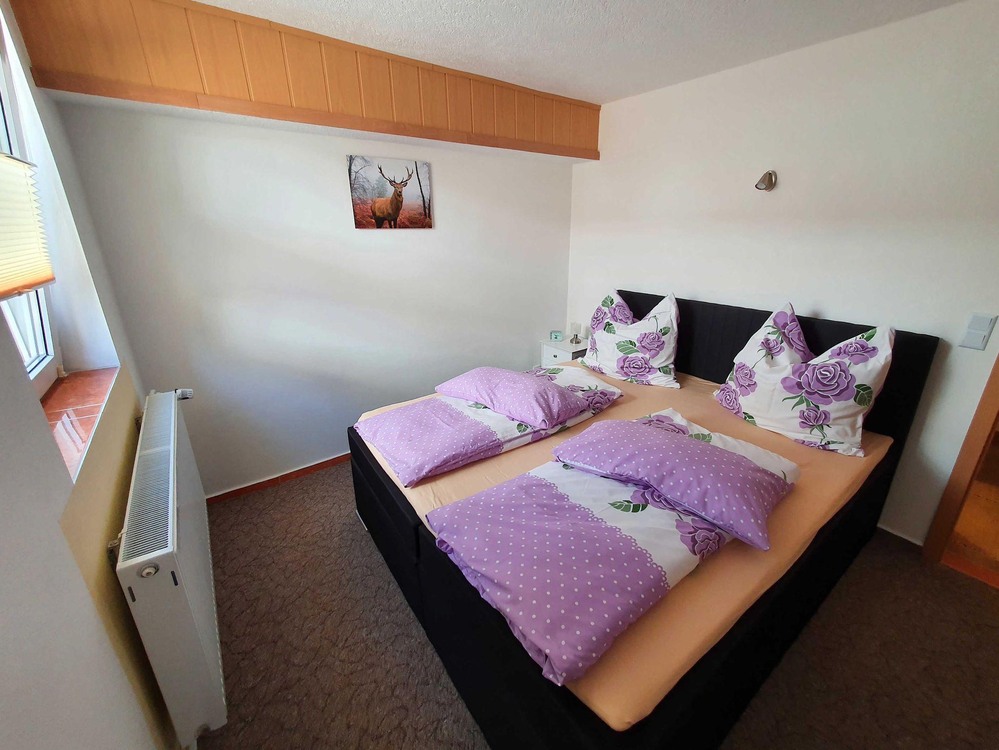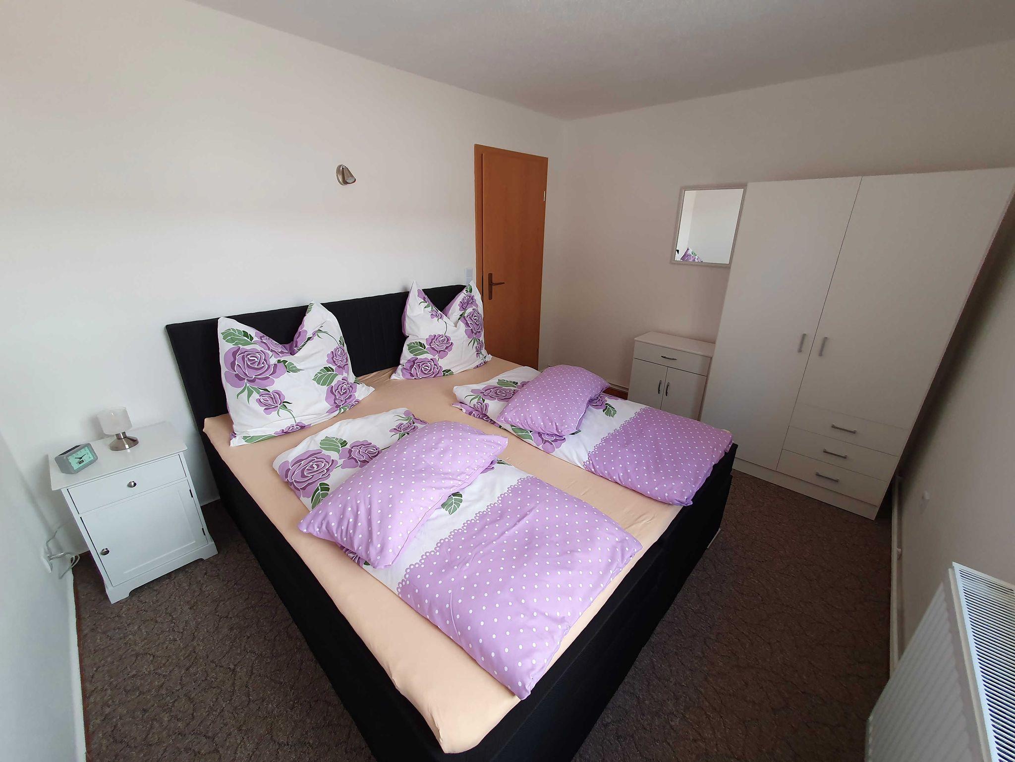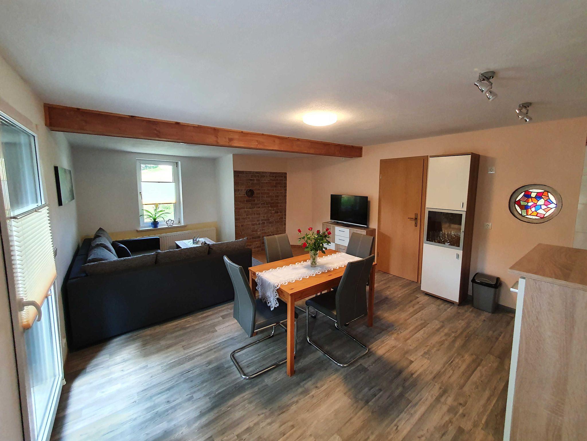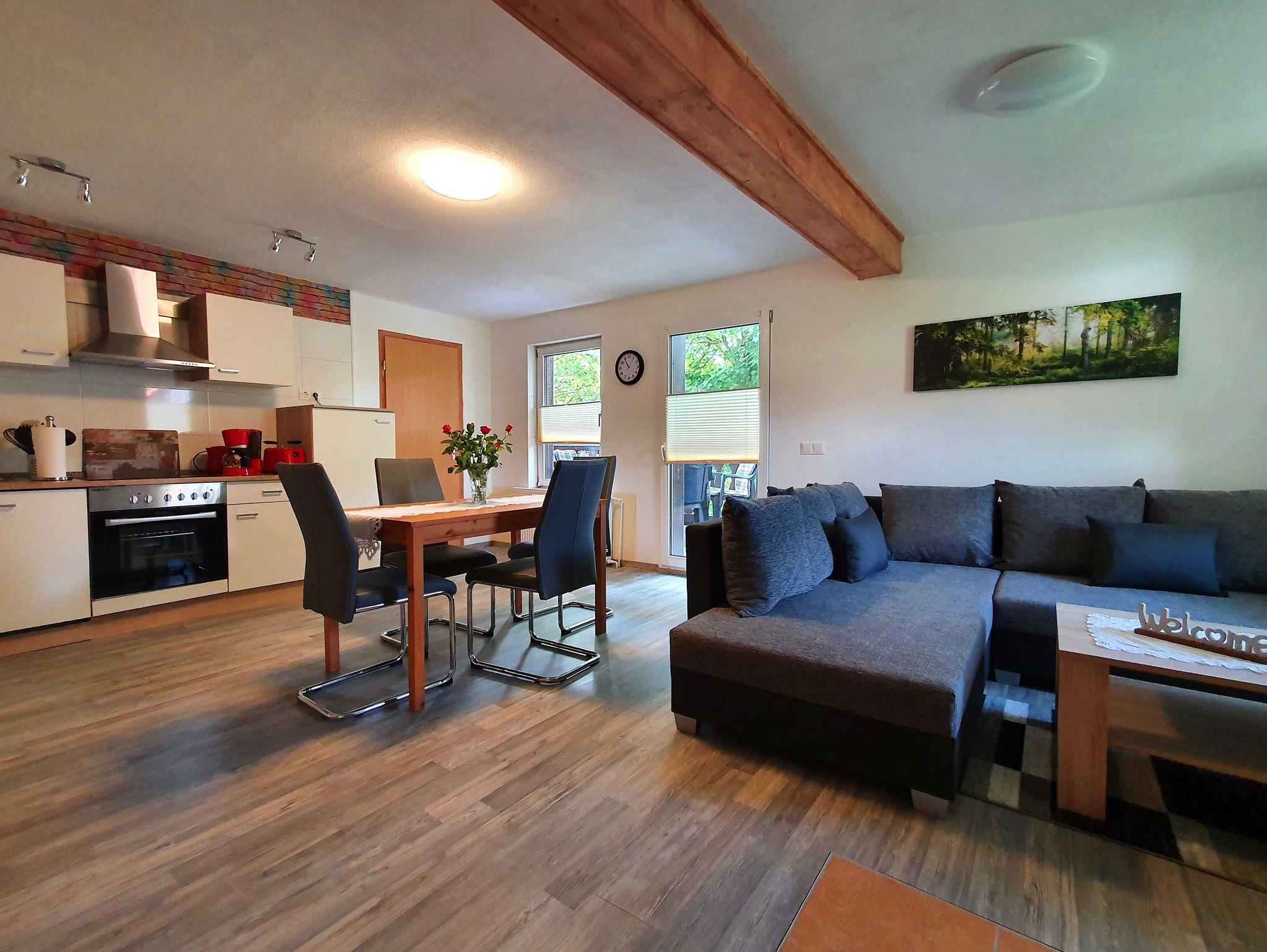In der separat zugänglichen Ferienwohnung, welche erst im Jahr 2021 entstanden ist, heißt man Sie auf einer Wohnfläche von 60 m² willkommen! Die Wohnung bietet Platz für bis zu 4 Personen, sie unterteilt sich in zwei großzügige Schlafzimmer, ein gemütliches Wohnzimmer mit integriertem Küchenbereich und ein Duschbad/WC. Die Schlafzimmer schenken Ihnen einen komfortablen Schlaf in einem großzügigen Boxspringbett und einem Doppelbett (dieses kann auf Wunsch auch in zwei Einzelbetten verwandelt werden), die jeweils von zwei beidseitigen Nachttischen mit Leselampen umgeben sind. Zusätzlich finden Sie zur Verstauung Ihres Reisegepäcks in jedem Schlafzimmer einen Kleiderschrank. Zur Wohnung gehört ein mit Gartenmöbeln möblierter Süd-Balkon. Hier genießen Sie eine Mahlzeit im Freien und profitieren von der weitläufigen Aussicht auf die hügelige, grüne Umgebung. Auch die Nutzung des Gartens mit kleinem Gartenhaus ist möglich. Ein Parkplatz steht Ihnen auf dem Grundstück zur Verfügung. In dieser Wohnung sind keine Haustiere erlaubt.
