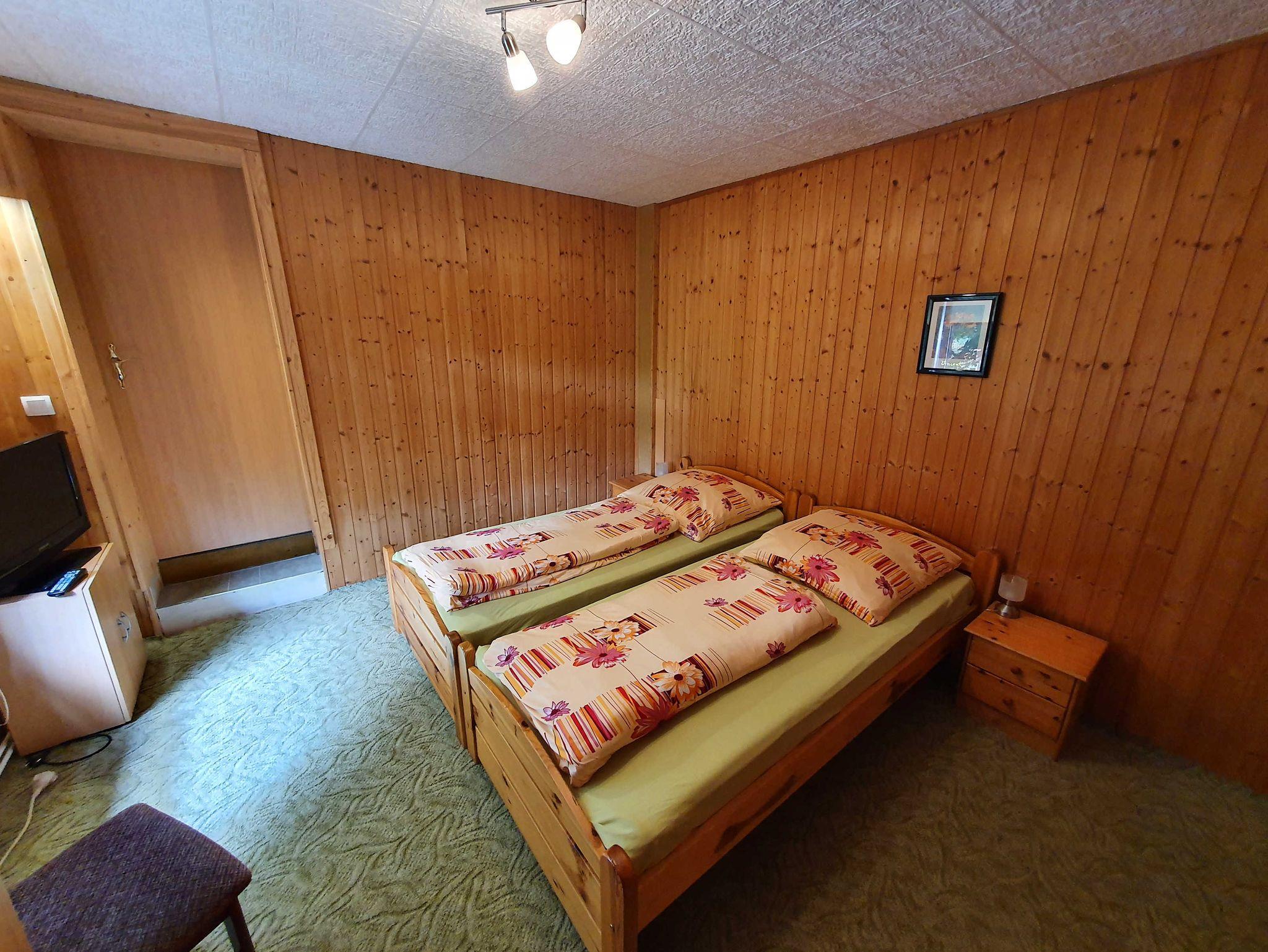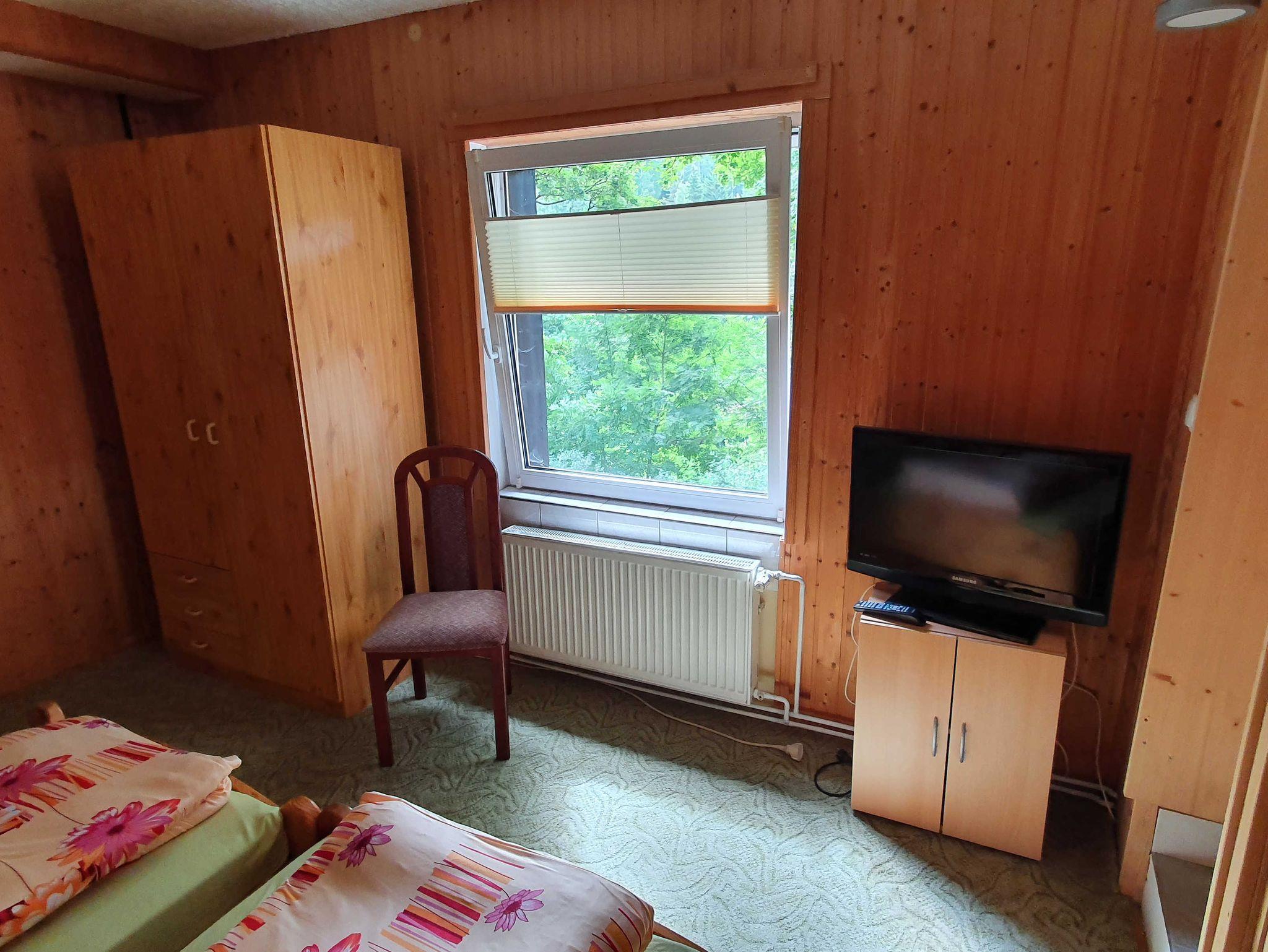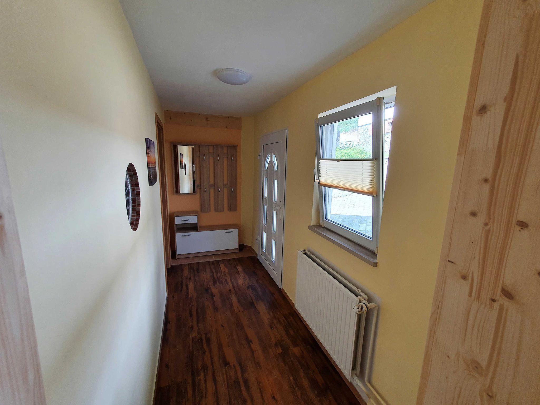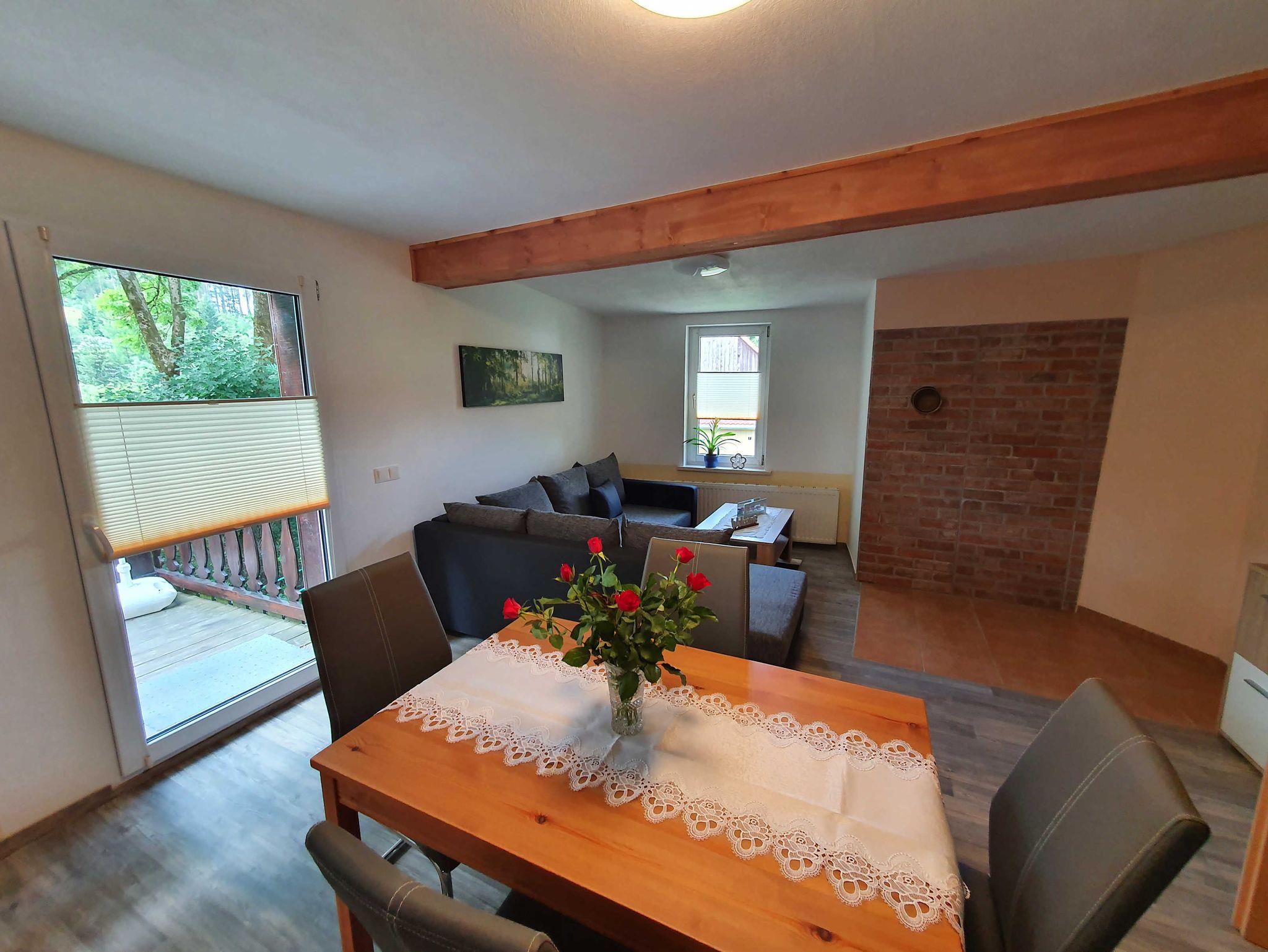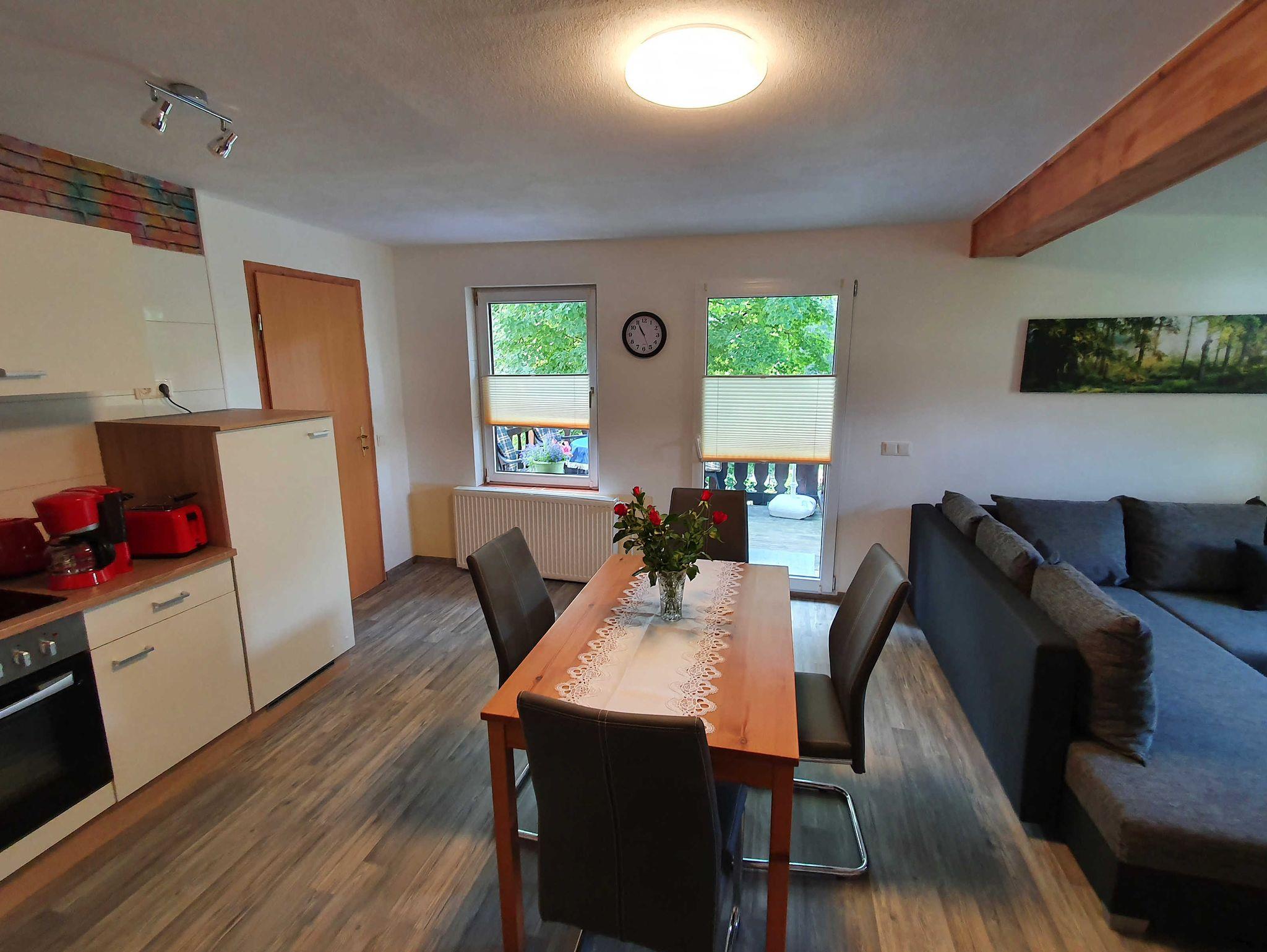 In der separat zugänglichen Ferienwohnung, welche erst im Jahr 2021 entstanden ist, heißt man Sie auf einer Wohnfläche von 60 m² willkommen! Die Wohnung bietet Platz für bis zu 4 Personen, sie unterteilt sich in zwei großzügige Schlafzimmer, ein gemütliches Wohnzimmer mit integriertem Küchenbereich und ein Duschbad/WC. Die Schlafzimmer schenken Ihnen einen komfortablen Schlaf in einem großzügigen Boxspringbett und einem Doppelbett (dieses kann auf Wunsch auch in zwei Einzelbetten verwandelt werden), die jeweils von zwei beidseitigen Nachttischen mit Leselampen umgeben sind. Zusätzlich finden Sie zur Verstauung Ihres Reisegepäcks in jedem Schlafzimmer einen Kleiderschrank. Zur Wohnung gehört ein mit Gartenmöbeln möblierter Süd-Balkon. Hier genießen Sie eine Mahlzeit im Freien und profitieren von der weitläufigen Aussicht auf die hügelige, grüne Umgebung. Auch die Nutzung des Gartens mit kleinem Gartenhaus ist möglich. Ein Parkplatz steht Ihnen auf dem Grundstück zur Verfügung. In dieser Wohnung sind keine Haustiere erlaubt.