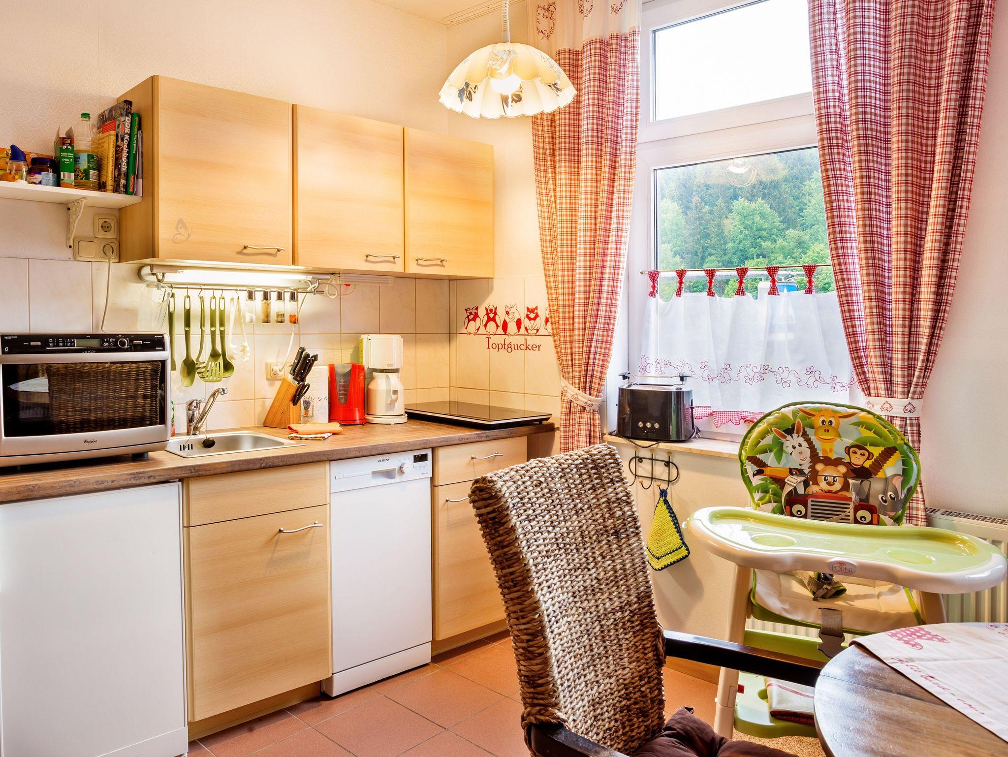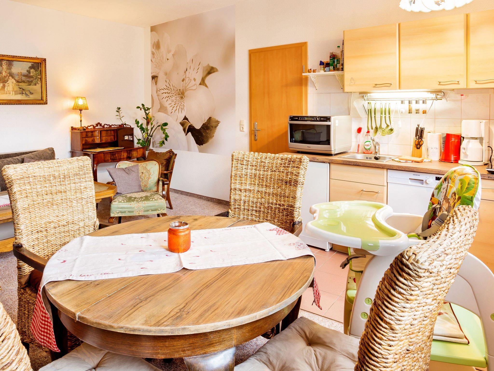 Für Familien mit Kleinkindern ist die 60 m² große Ferienwohnung „Gartenblick“ bestens geeignet. Mit einem separaten Schlafzimmer, Babybett und Kinderstühlchen sowie einer Schlafcouch im Wohnzimmer bietet sie ausreichend Platz für die ganze Familie.