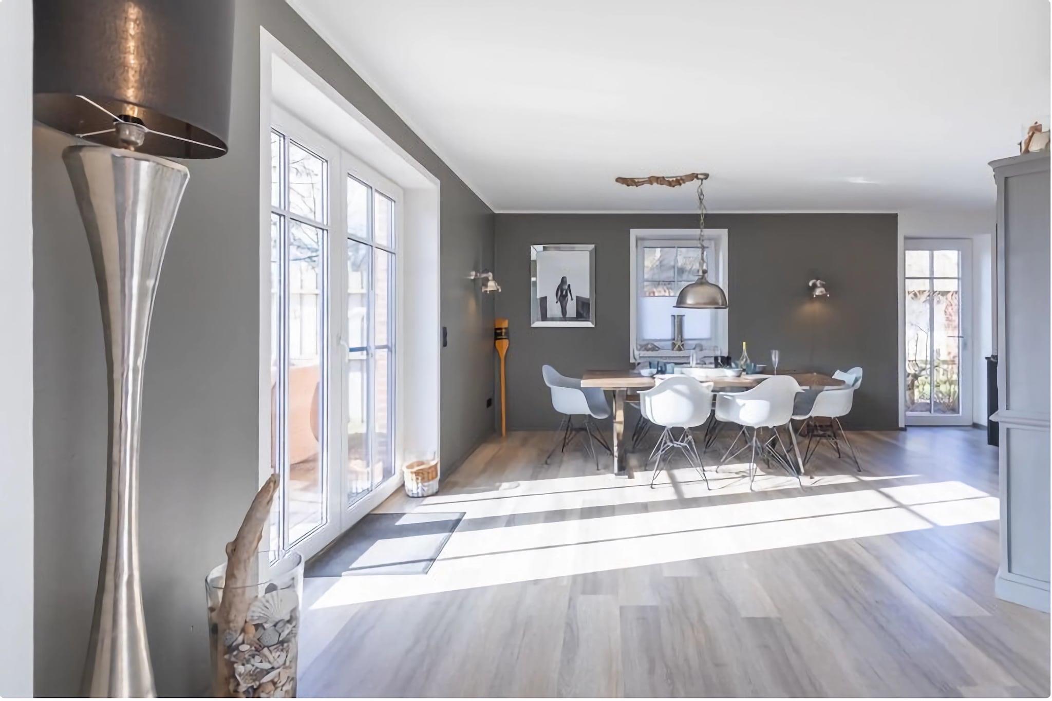 Det 110 kvm store sommerhus i Tating er fordelt på to plan og byder på plads til hele familien. Nyd tiden i det åbne opholds- og spiseområde eller lav mad sammen i det veludstyrede køkken. Udenfor venter en 625 kvm stor have, som minder om et imponerende klitlandskab. Der kan du slappe af i en strandstol eller på de to liggestole. Boligen har tre soveværelser på loftet. Det ene soveværelse har eget badeværelse med brusebad på gulvniveau og håndklædetørrer samt påklædningsområde. Der er også et brusebad i stueetagen, hvor du har en vaskemaskine til din rådighed. Der er desuden tre parkeringspladser foran huset. Højdepunkter: WiFi, forbrugsbaserede energiomkostninger, vaskeripakke, slutrengøring Feriehuset ligger i den landlige landsby Tating, lige foran de store sandstrande i St. Peter-Ording (8 minutter i bil). Små butikker, bageri og butikker til daglige behov er inden for gåafstand.