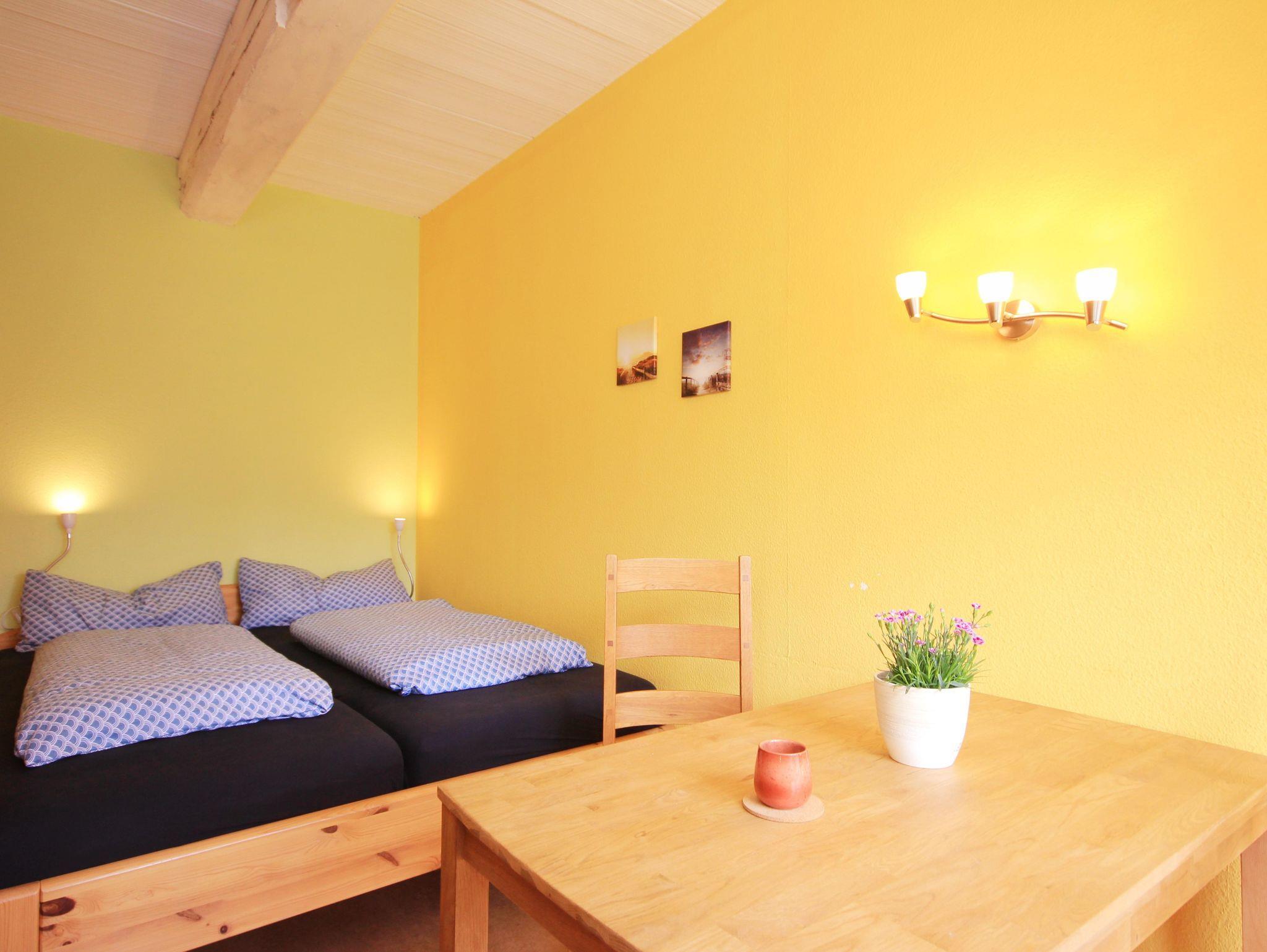 Kombinierter Wohn-/Schlafraum mit Schlafsofa und Essecke, Flachbild-TV, integrierter Pantry-Küche mit 2 Platten-Ceran-Kochfeld, Mikrowelle, Kühlschrank mit Gefrierfach, Kaffeemaschine, Toaster und Wasserkocher. Separates Duschbad mit WC. WLAN inklusive.