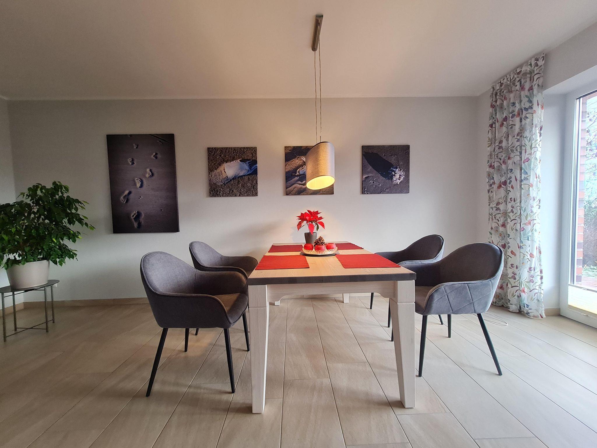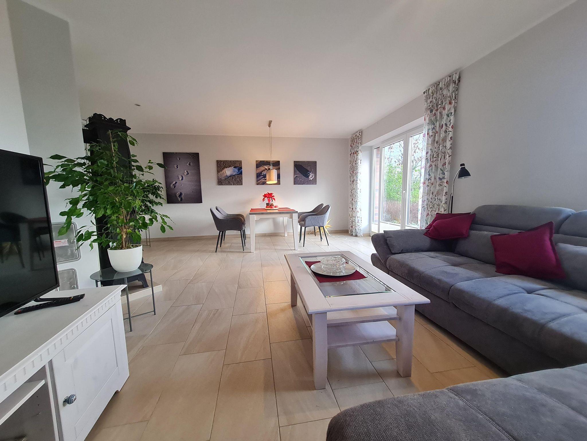 Der großzügige Wohnbereich mit Sitzgruppe, TV und Essgruppe bietet viel Platz zum Entspannen und einen wundervollen Ausblick über die Landschaft Eiderstedts.